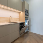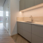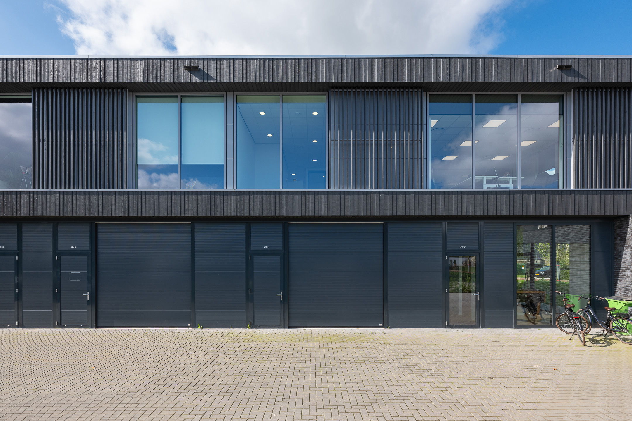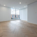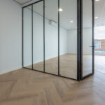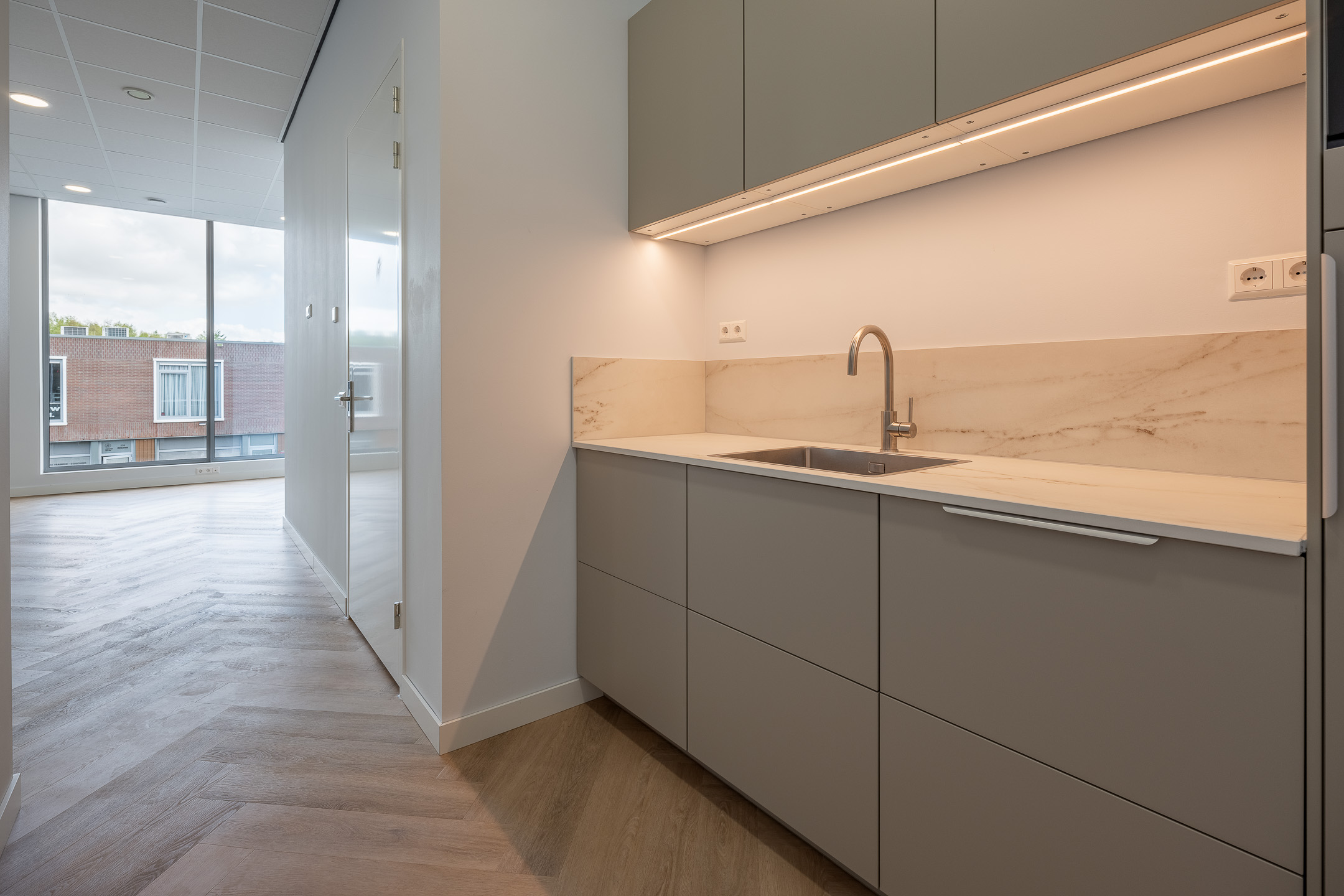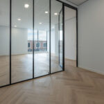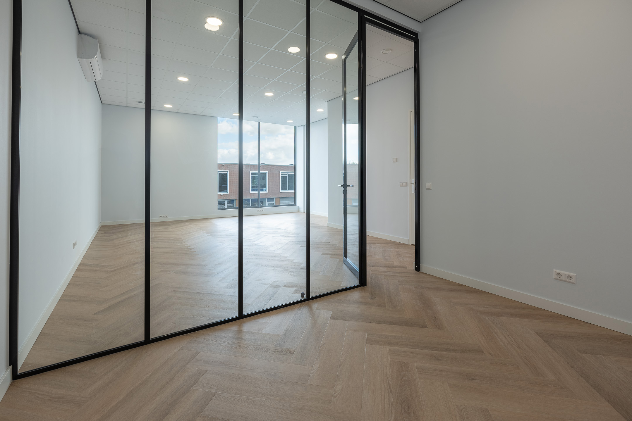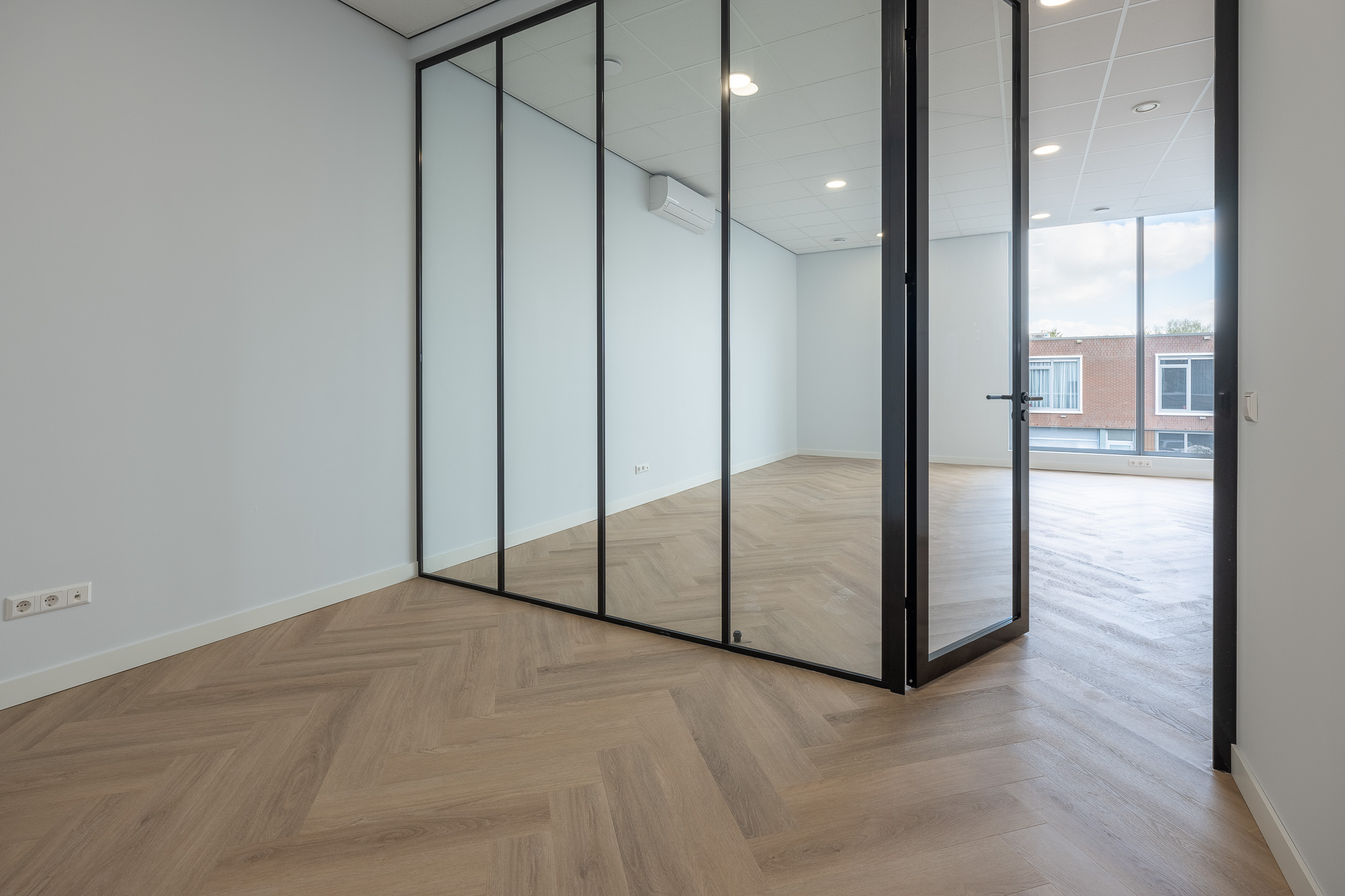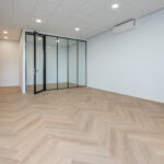 Op de eerste etage beschikt de bedrijfsruimte over een vloeroppervlak van circa. 56 m². Deze etage is voorzien van een strakke PVC visgraatvloer. Middels een stalen glazenwand beschikt de ruimte over een afgesloten vergader/werkkamer. Daarnaast is er een pantry aanwezig voorzien van een spoelbak, vaatwasser, stoomoven en koelkast met vriesvak. Boven het systeemplafond bevindt zich het balansventilatiesysteem met warmteterugwinning. Ook deze etage is te verwarmen en koelen middels een airco.