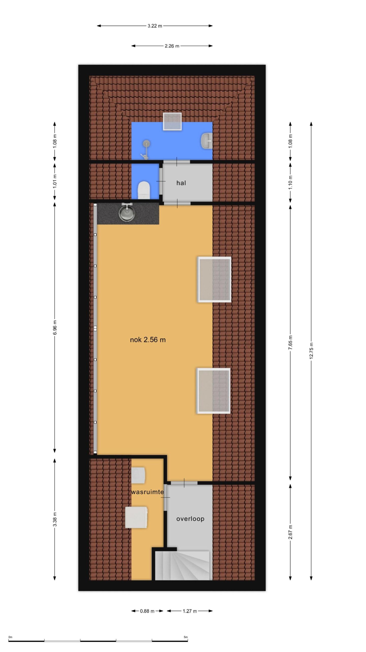 De eerste verdieping (circa. 35 m² VVO) is bereikbaar via een separate opgang. Hier bevinden zich een tweede klaslokaal, een wasruimte, een toilet en een badkamer. De maximale nokhoogte bedraagt circa 2,56 meter.