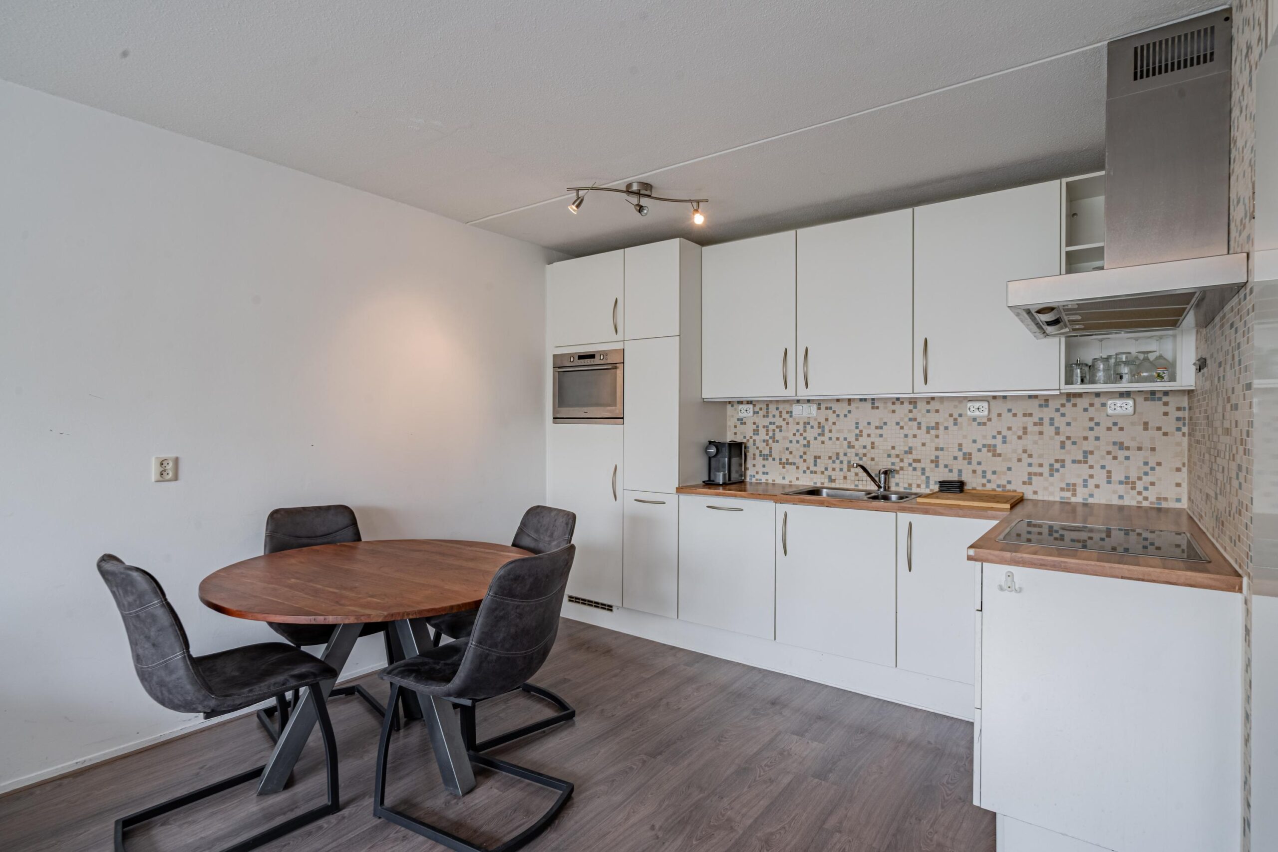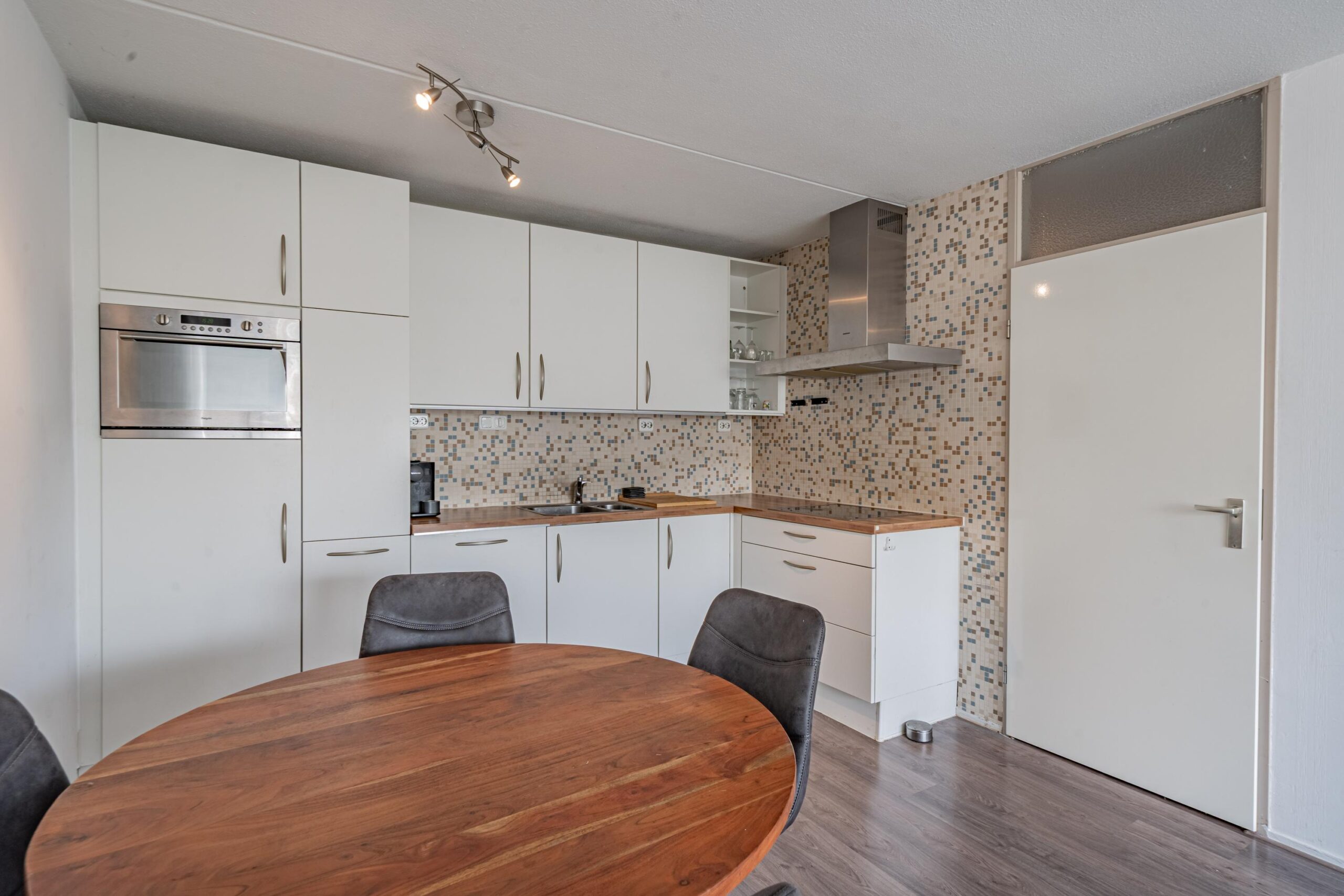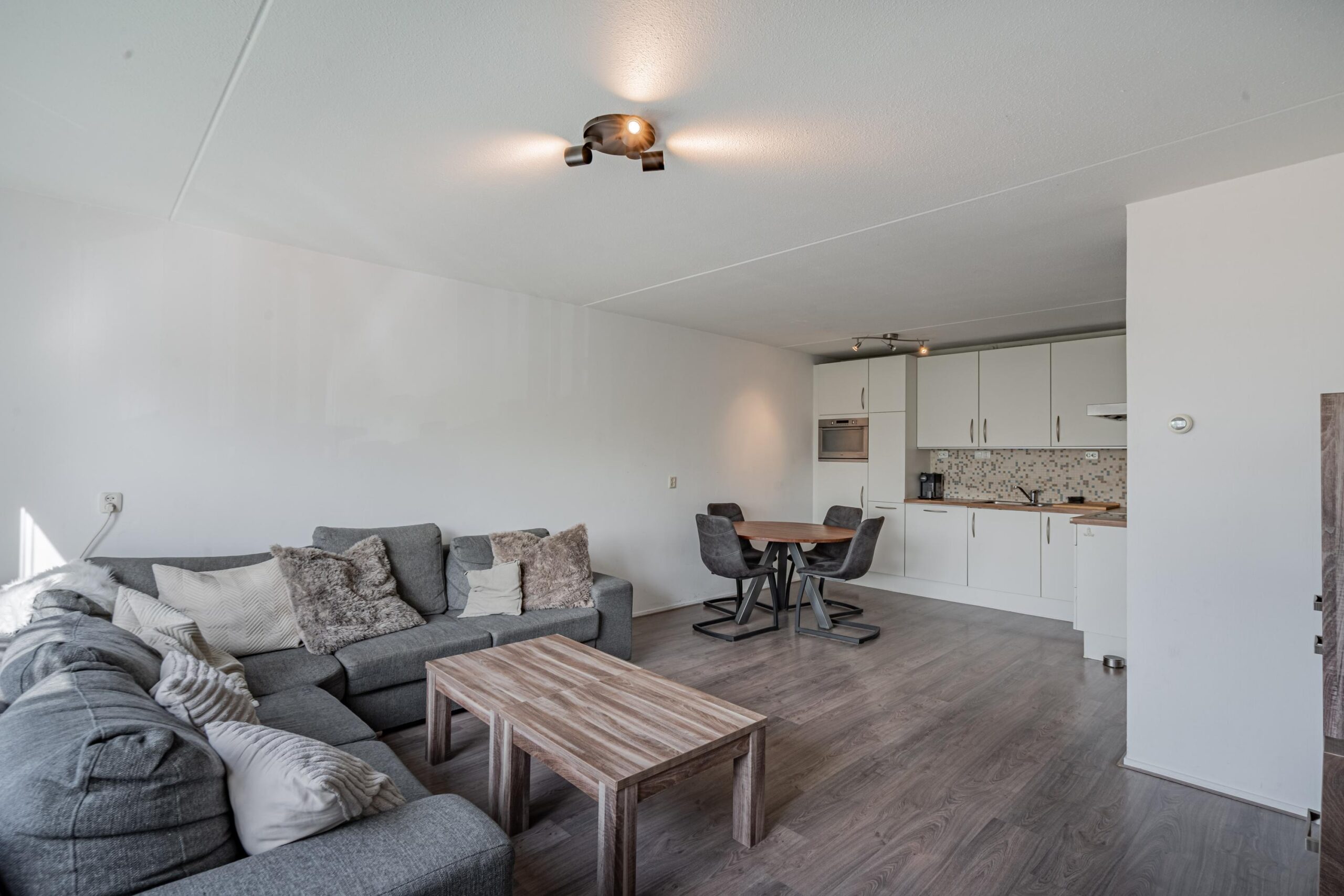 Entree, gang met garderobe en toegang tot lichte woonkamer met open moderne keuken voorzien van diverse inbouwapparatuur, waaronder; koelkast, oven, vaatwasser, inductiekookplaat en afzuigkap.