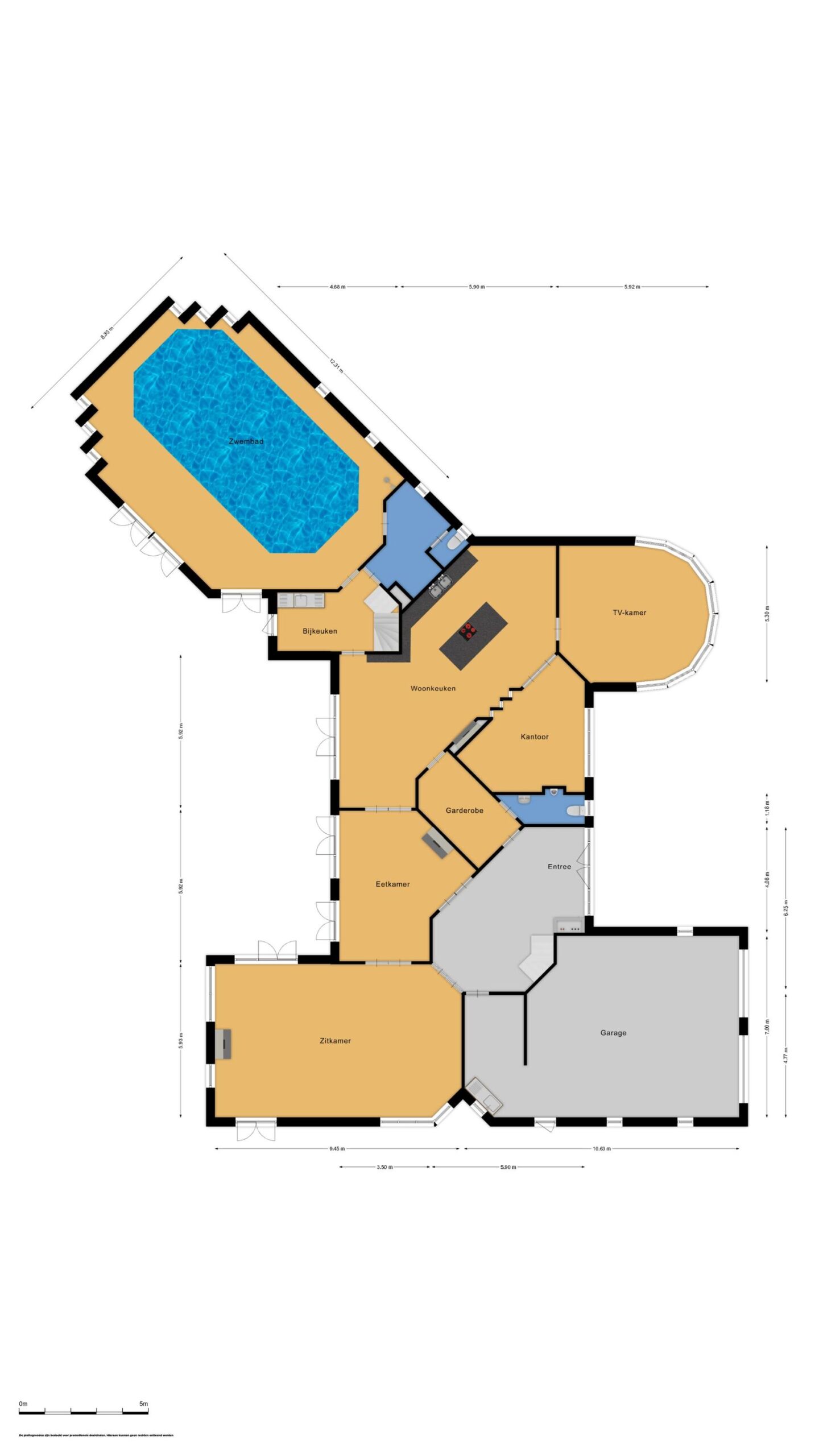 De bijkeuken biedt toegang tot de kelder en de eerste verdieping en leidt tevens naar de kleedruimte met toilet ten behoeve van het zwembad . Vanuit hier bereikt u het verwarmde binnenzwembad, dat dankzij meerdere openslaande deuren een directe verbinding heeft met de tuin. Tot slot beschikt de begane grond over een inpandig bereikbare, verwarmde dubbele garage met pantry.
