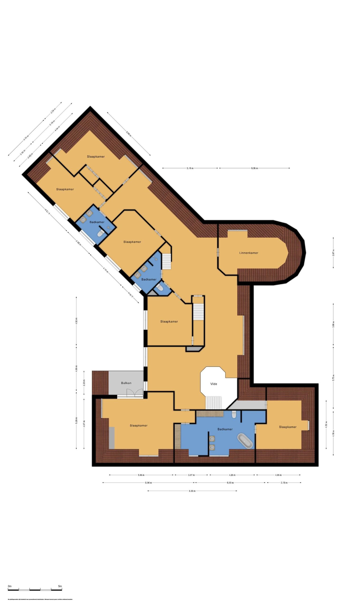 De royale overloop met vide geeft toegang tot de master bedroom met balkon en en suite badkamer, voorzien van dubbele wastafel, toilet, ligbad en inloopdouche. Een tweede kamer is momenteel in gebruik als fitnessruimte. Daarnaast bevinden zich op deze verdieping nog vier slaapkamers, twee badkamers, een linnenkamer en een separaat toilet. Alle slaapkamers zijn ruim bemeten en twee zijn voorzien van vaste kasten.