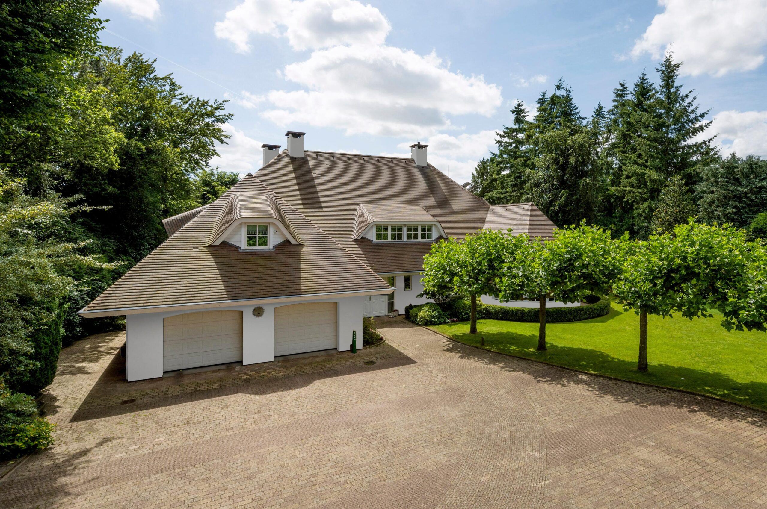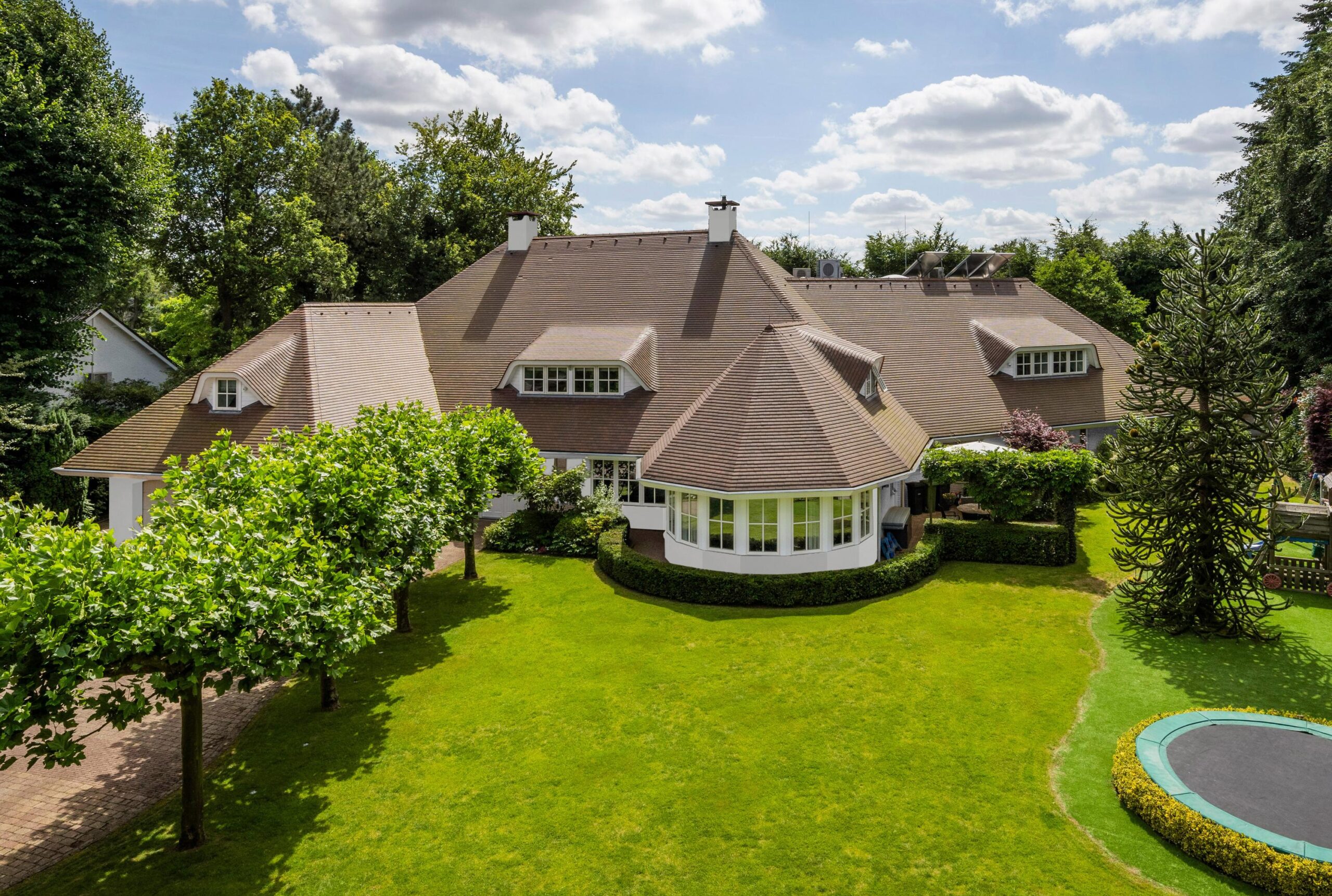 De imposante ontvangsthal met vide, garderobe en plavuizen vloer vormt de entree tot deze villa. De royale woonkamer beschikt over een schouw met open haard en dubbele openslaande deuren naar de tuin. De aangrenzende eetkamer, eveneens met open haard en openslaande deuren naar het terras, vormt samen met de luxe, volledig uitgeruste Miele-keuken het hart van het huis. Aansluitend bevindt zich een sfeervolle zit-/tv-kamer met erker en gashaard, evenals een speelkamer die direct in verbinding staat met de keuken.