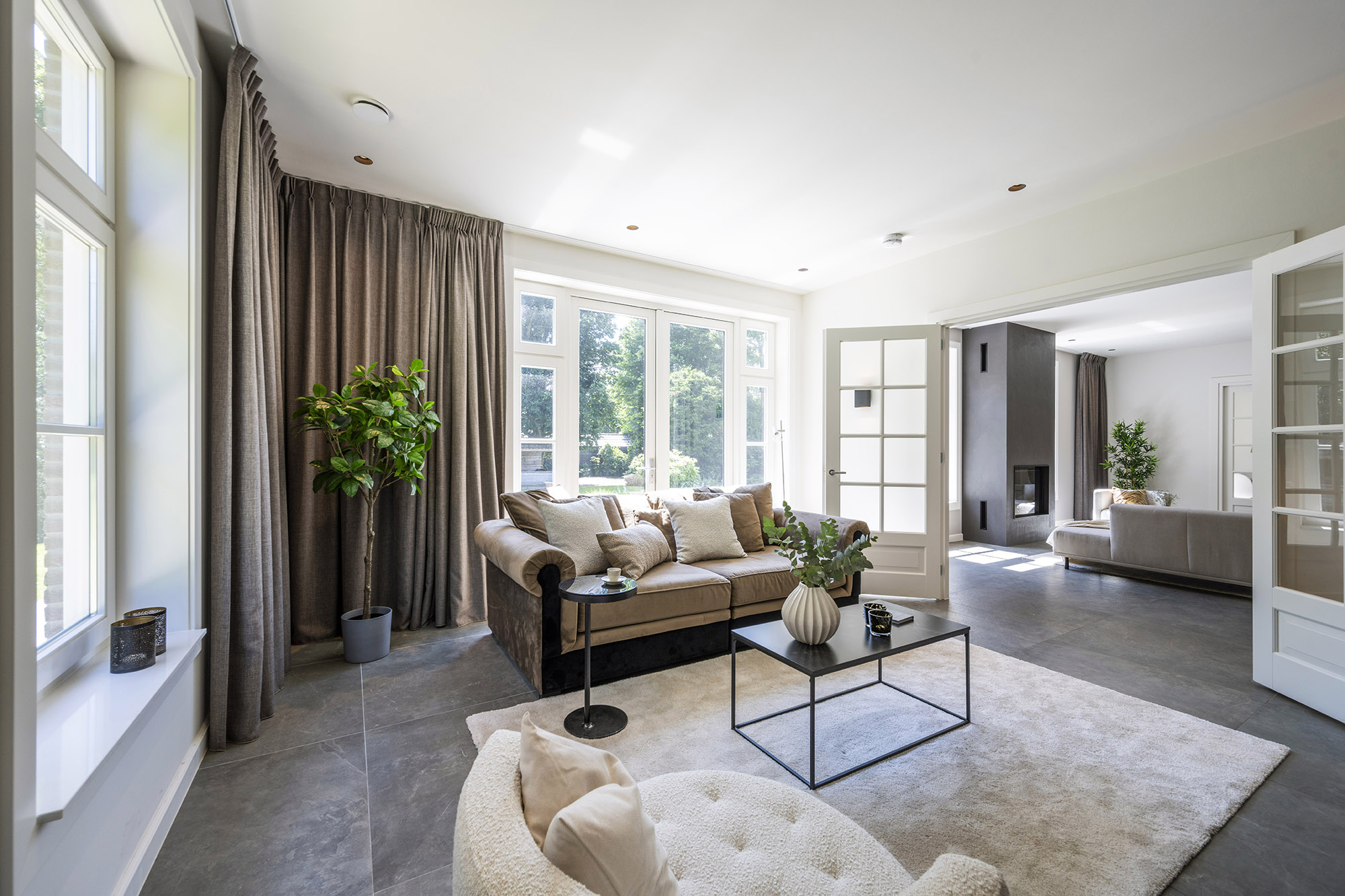De entree met dubbele deuren leidt naar een royale hal met een indrukwekkende vide van liefst 6 meter hoog. Via openslaande deuren kom je in de lichte woonkamer met sfeervolle openhaard. Links van de woonkamer is een gezellige televisiekamer met openslaande deuren naar de tuin en rechts van de woonkamer een ruime werkkamer. Daarnaast is er een stijlvolle gastentoiletruimte.