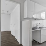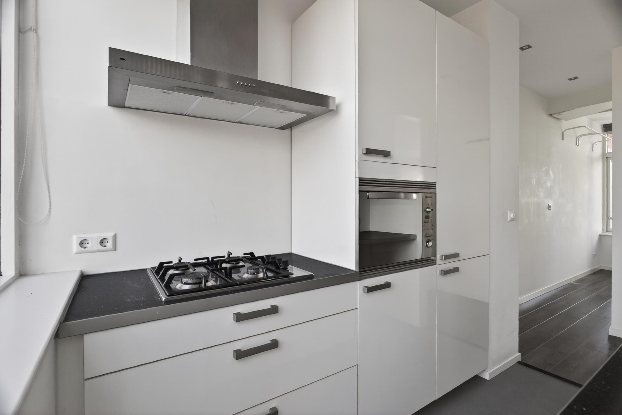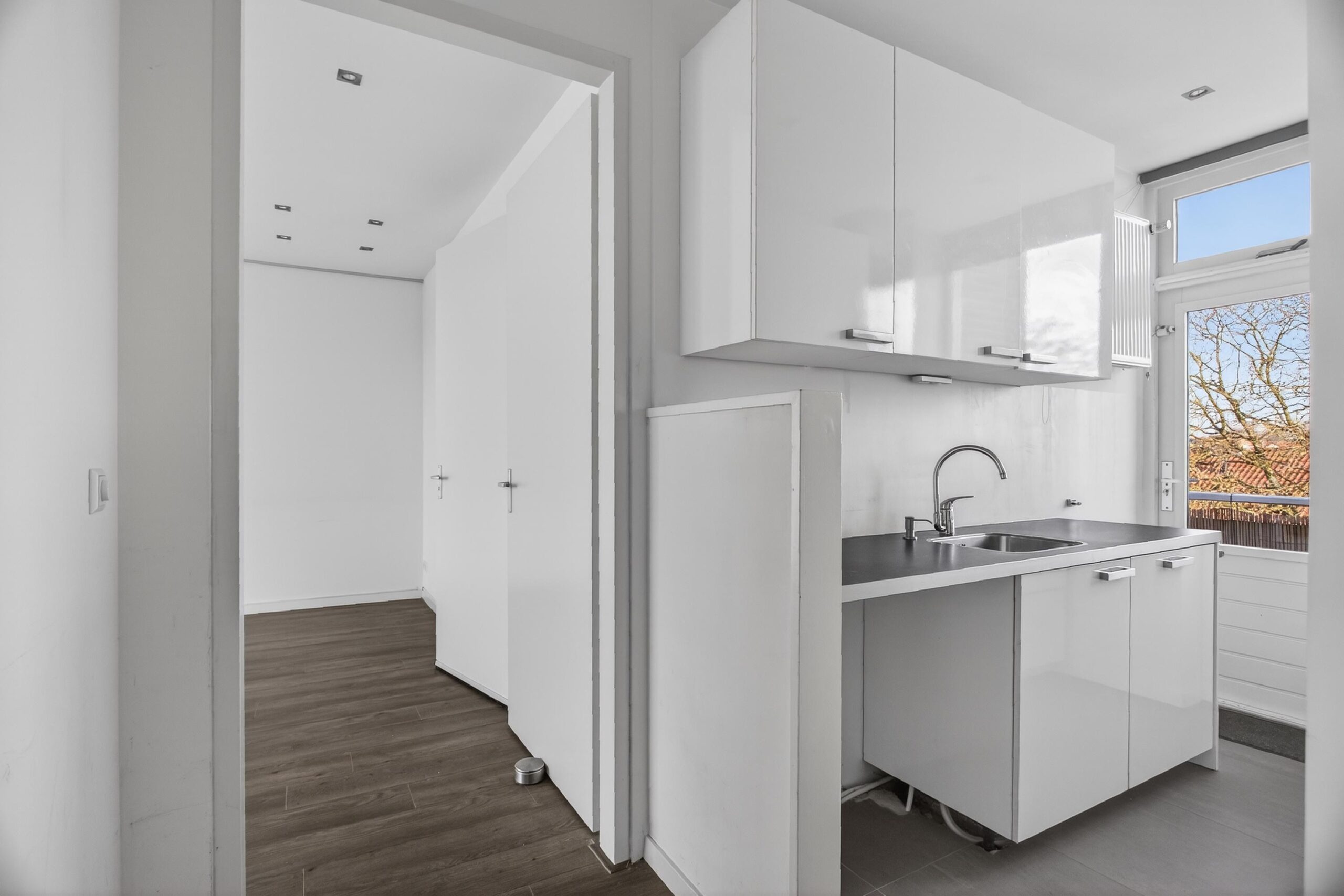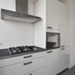 Aan de voorzijde bevindt zich de strakke, gesloten keuken, voorzien van diverse inbouwapparatuur en met toegang tot het balkon. De badkamer is modern en praktisch ingericht met douche en wastafelmeubel. Daarnaast is er een separaat toilet.
