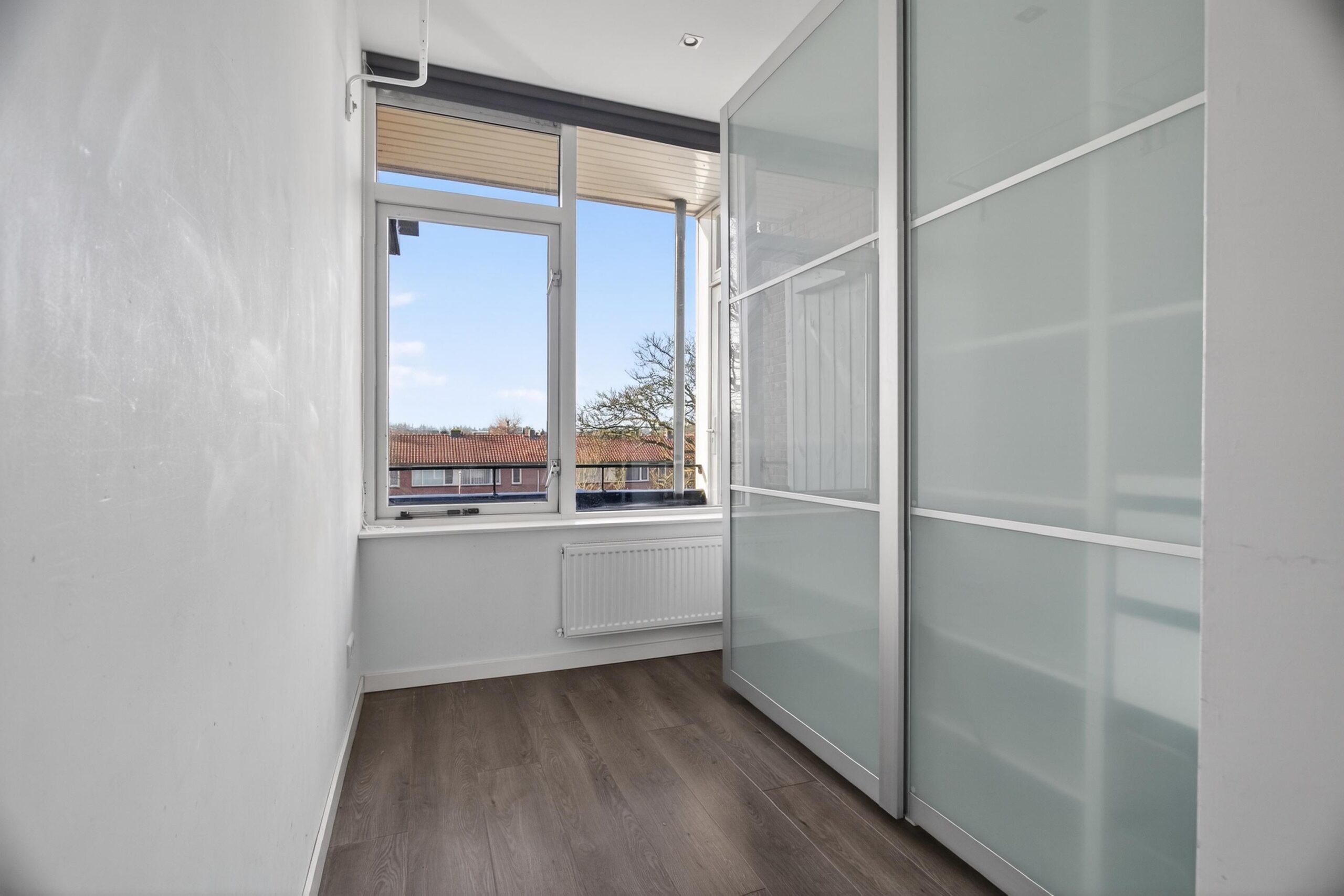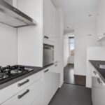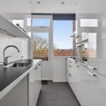 Aan de voorzijde bevindt zich de nette, afgesloten keuken, compleet met inbouwapparatuur en met toegang tot het balkon. De badkamer is modern uitgevoerd en voorzien van een douche en wastafelmeubel. Daarnaast beschikt de woning over een separaat toilet en een extra ruimte die momenteel als kastenkamer in gebruik is, maar eenvoudig kan worden omgevormd tot een tweede slaapkamer.