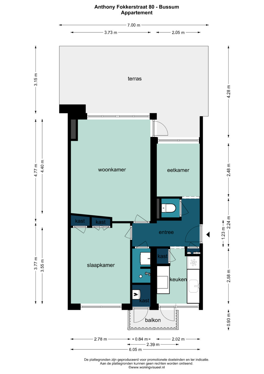 Aan de voorzijde bevindt zich de gesloten keuken, met toegang tot het balkon. De slaapkamer is voorzien van praktische inbouwkasten. De badkamer is compact maar functioneel en er is een apart toilet.