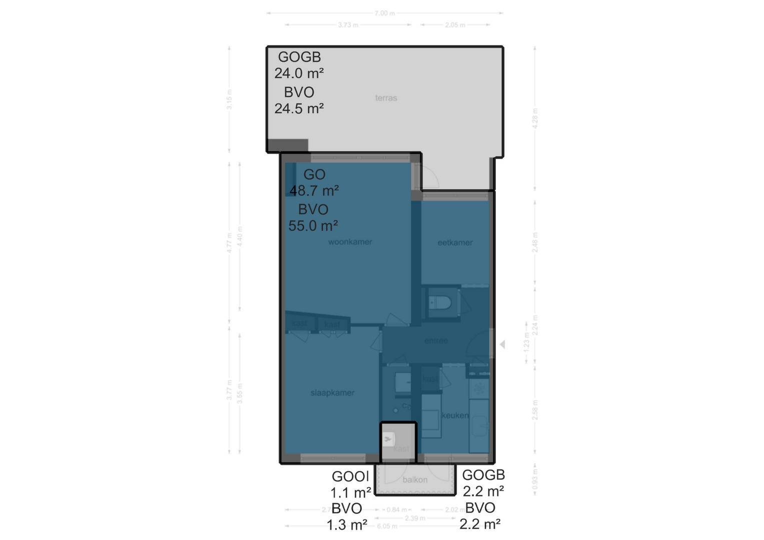 - Woonoppervlakte ca. 49 m² (GO wonen 48,7 m²)