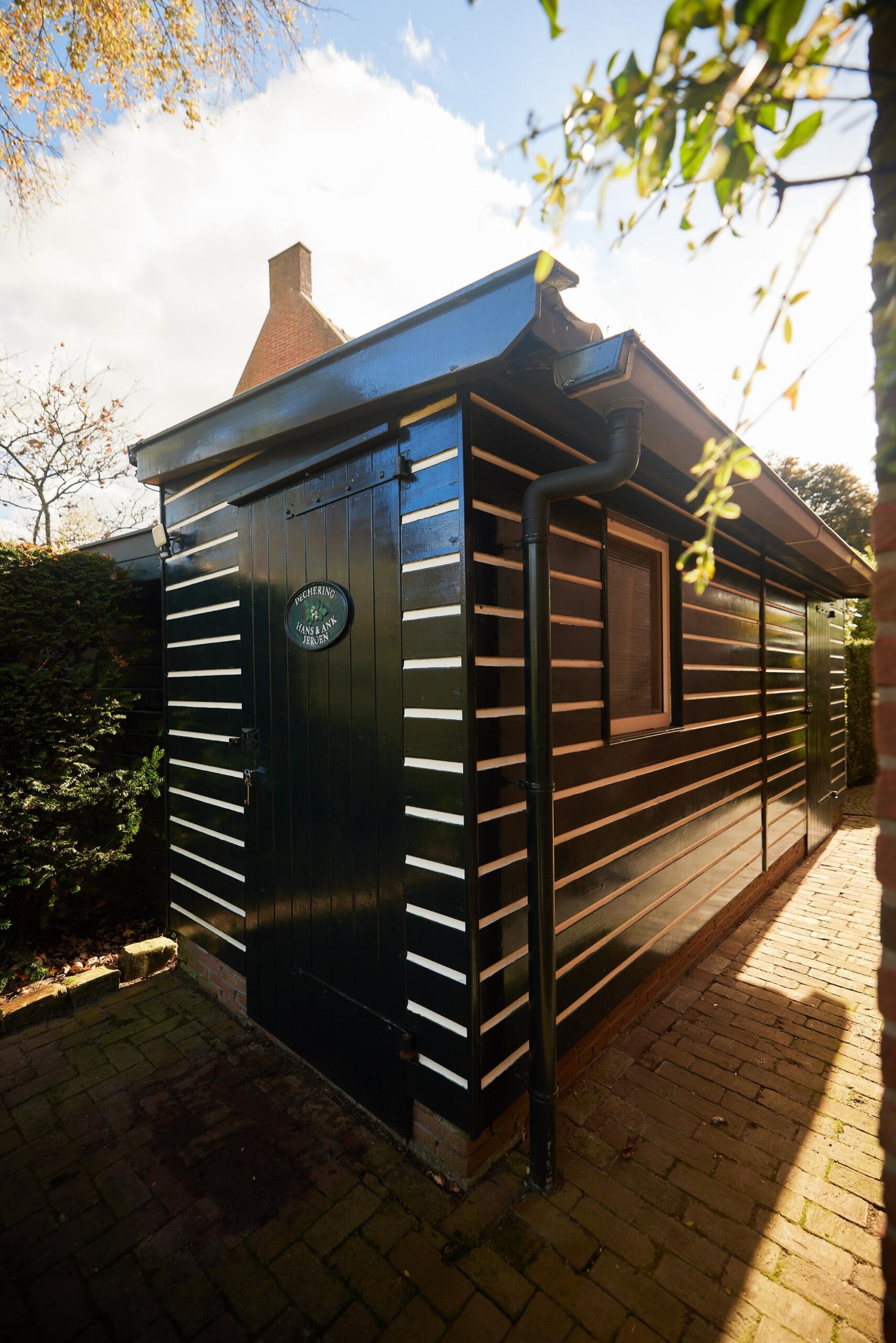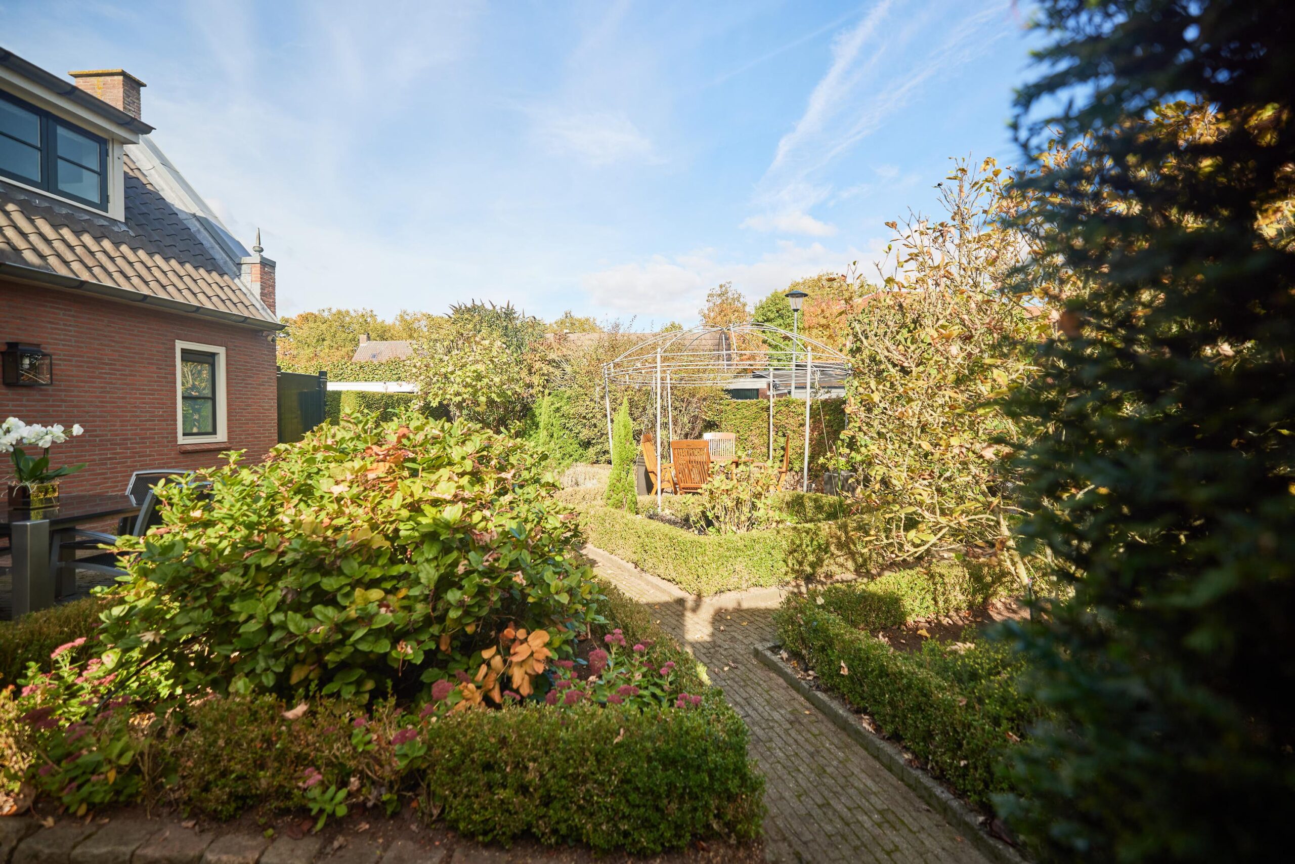 De verzorgde tuin ligt rondom de woning en biedt diverse terrassen, zodat er altijd wel een plekje in de zon of schaduw te vinden is. Achter in de tuin staat een vrijstaande schuur, ideaal voor opslag of fietsen. De tuin is vanuit verschillende entree bereikbaar en op de privé oprit is plek voor het parkeren van twee auto’s op eigen terrein.