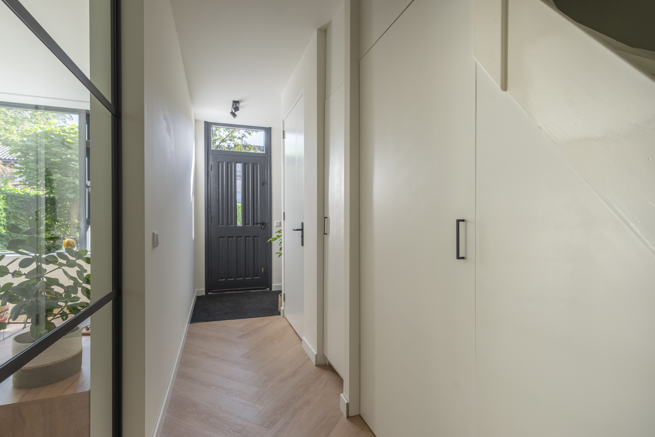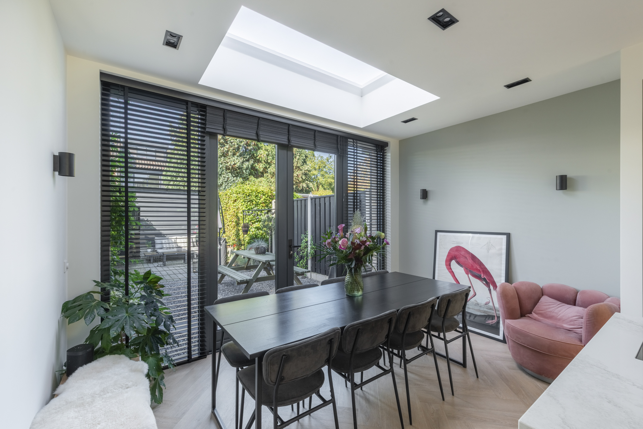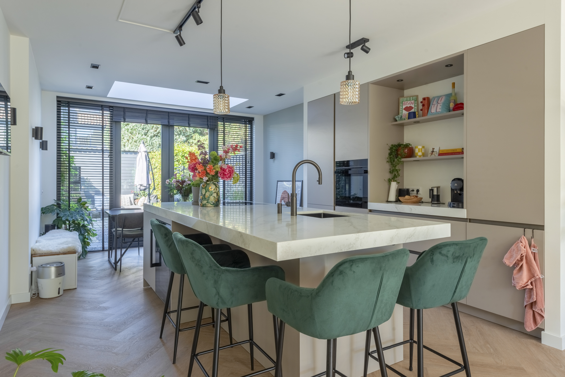 Entrance, hallway with wardrobe, modern toilet, and storage cupboard under the stairs. Spacious living room with a beautiful herringbone PVC floor with underfloor heating, Hue lighting, and Sonos sound system. The extended open-plan kitchen adjoins the living room and is equipped with a cooking and sink island, plenty of storage space, and luxury built-in appliances including a Quooker with chilled and sparkling water, Bora induction hob with integrated extractor, wine cooler, etc. A large skylight provides abundant natural light, and French doors open onto the sunny, private garden.