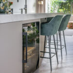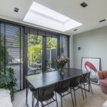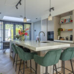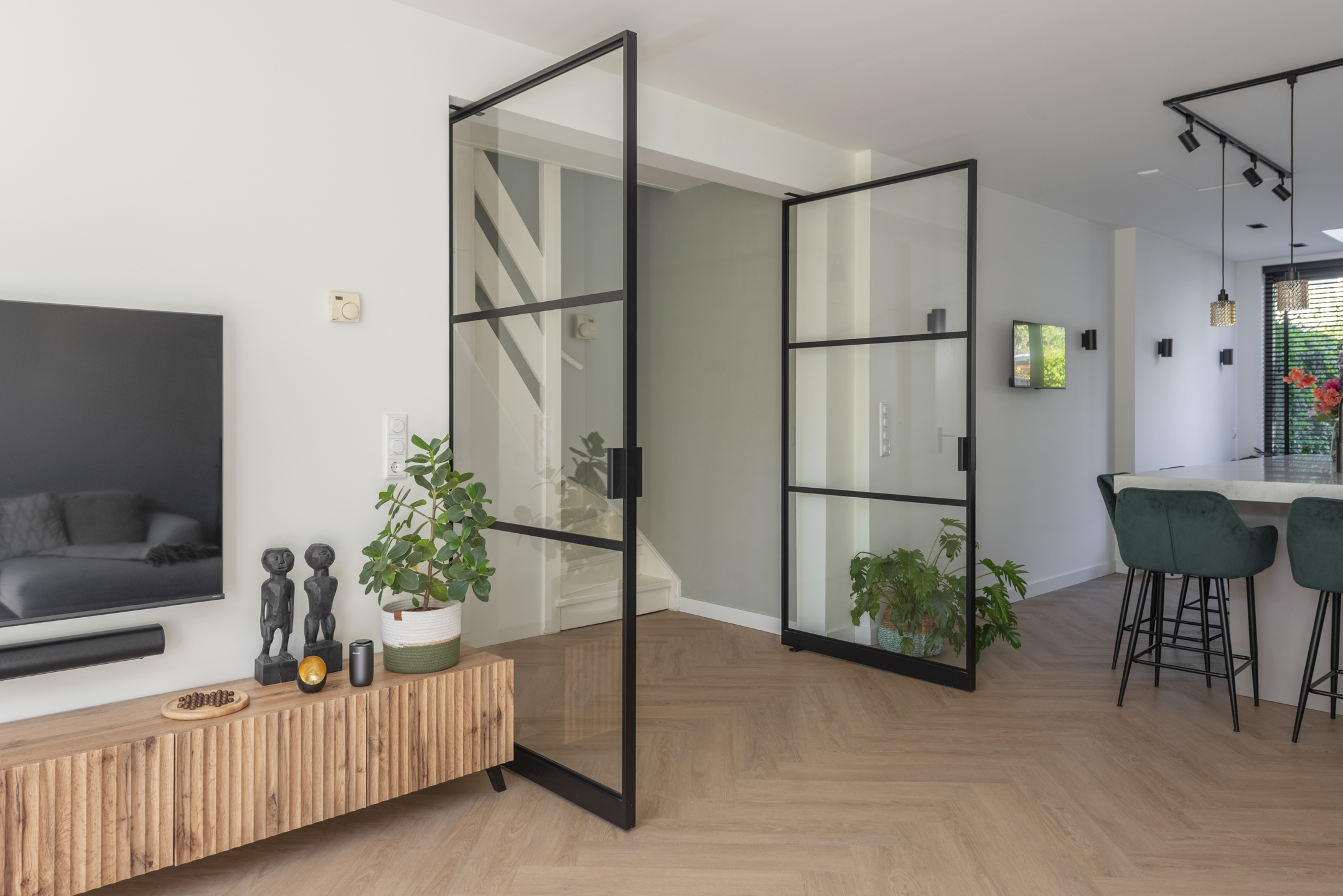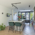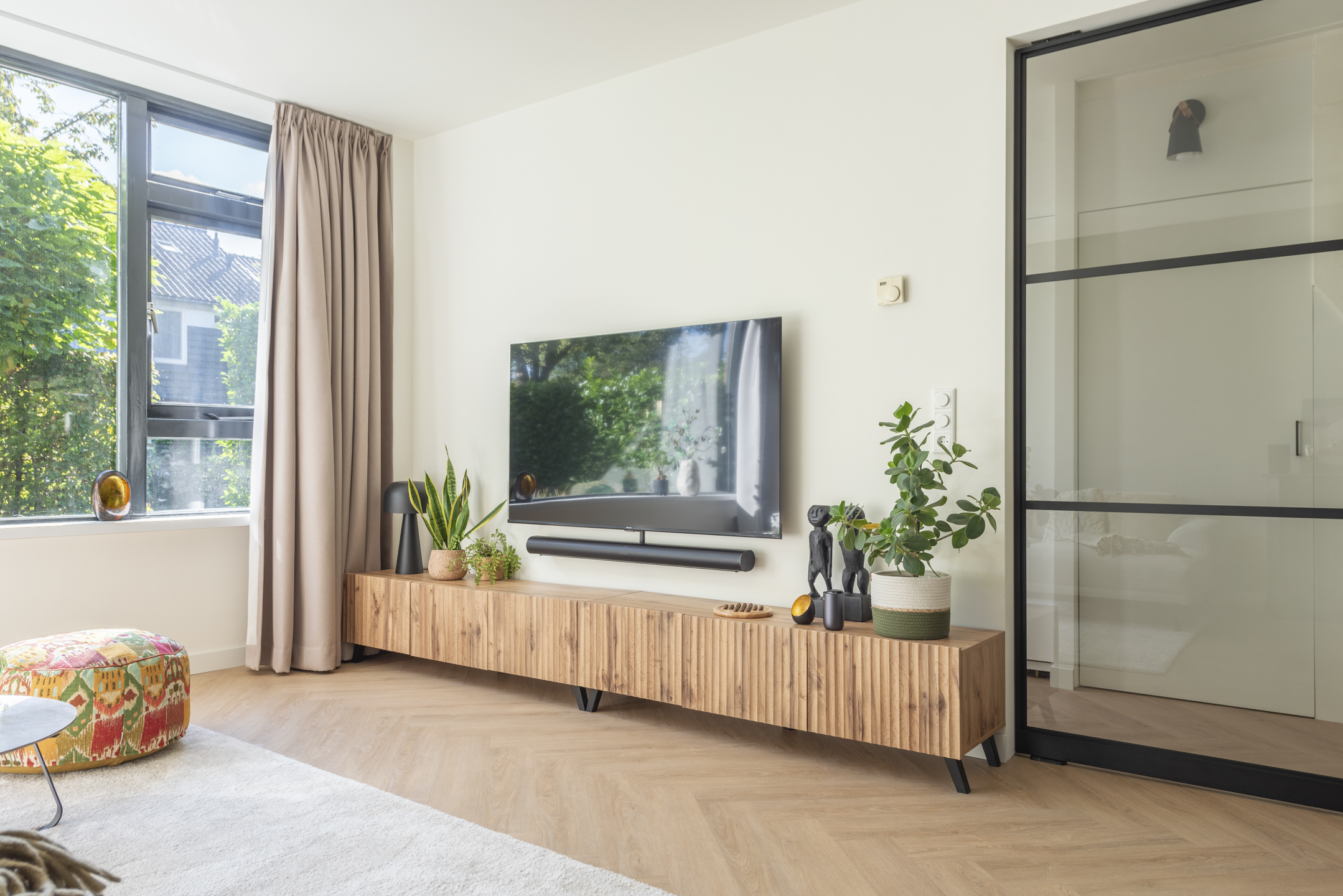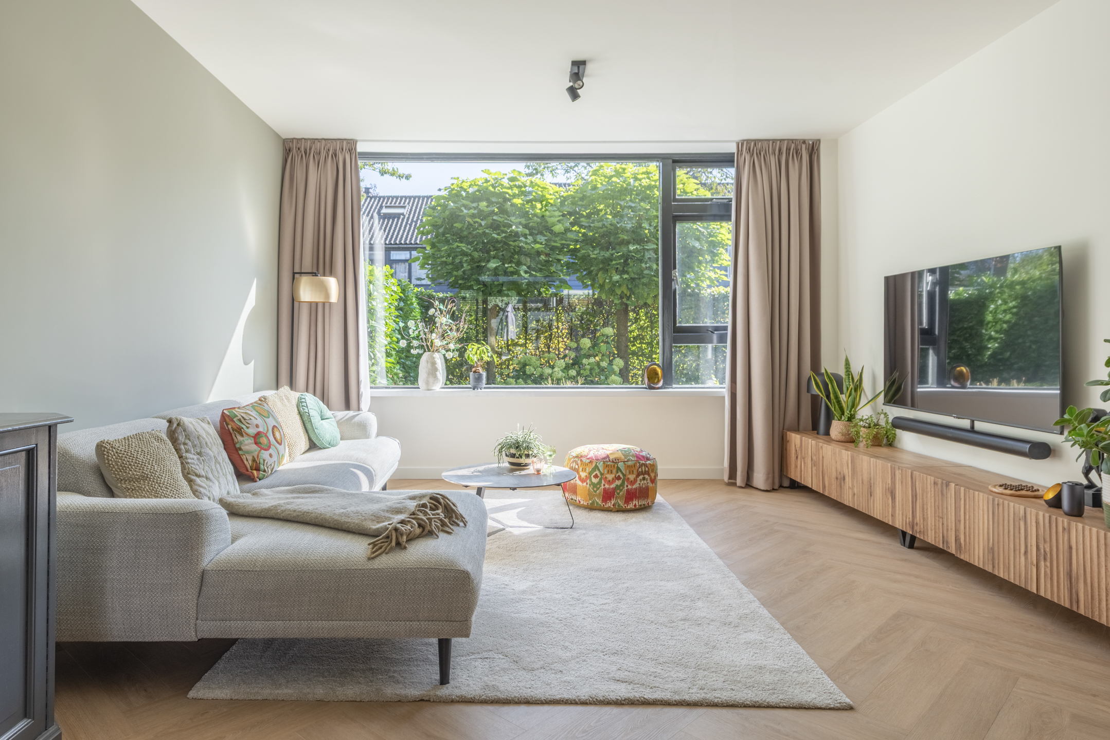 Entrance, hallway with wardrobe, modern toilet, and storage cupboard under the stairs. Spacious living room with a beautiful herringbone PVC floor with underfloor heating, Hue lighting, and Sonos sound system. The extended open-plan kitchen adjoins the living room and is equipped with a cooking and sink island, plenty of storage space, and luxury built-in appliances including a Quooker with chilled and sparkling water, Bora induction hob with integrated extractor, wine cooler, etc. A large skylight provides abundant natural light, and French doors open onto the sunny, private garden.