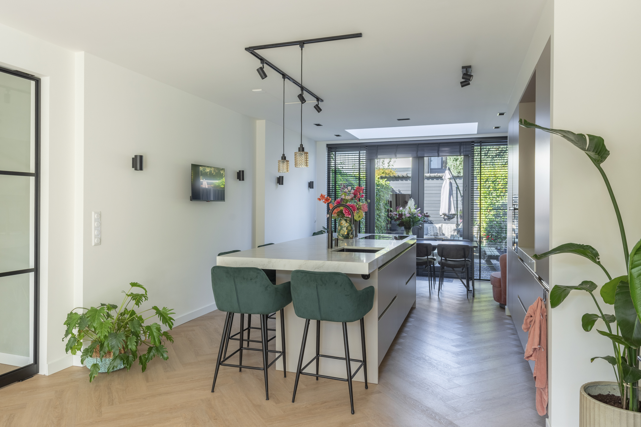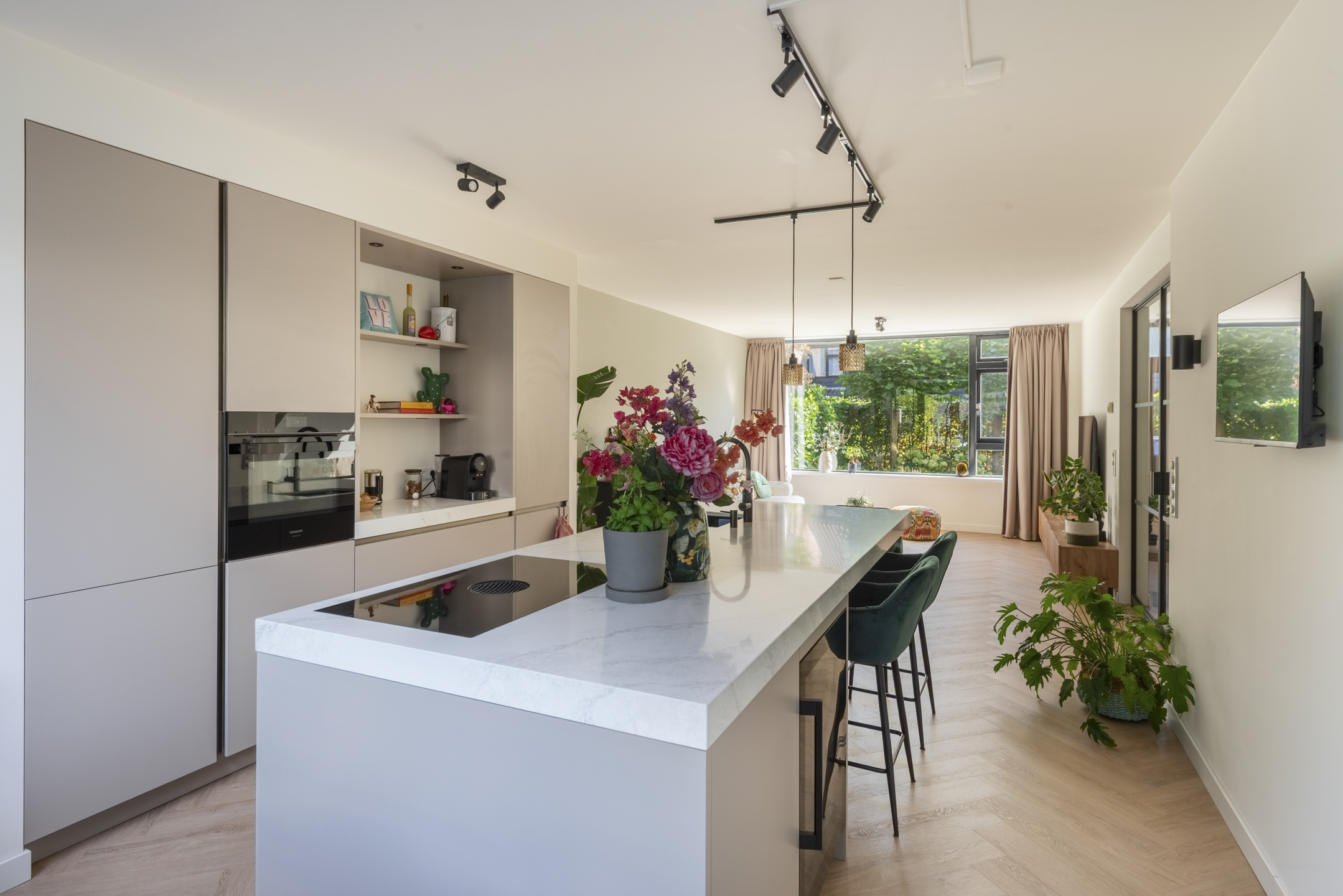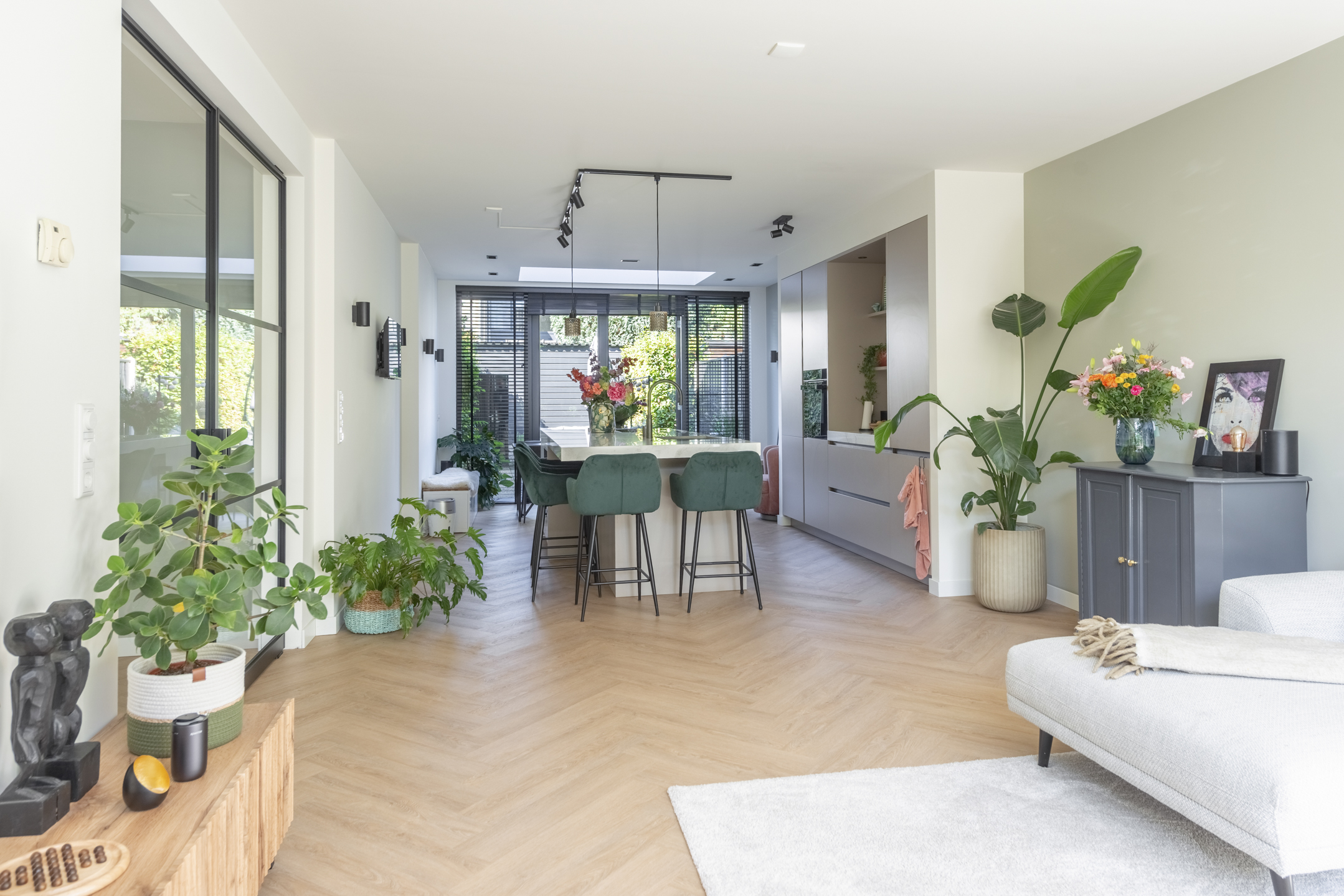 Entree, hal met garderobe, modern toilet en trapkast. Ruime woonkamer met een prachtige visgraat PVC vloer met vloerverwarming, Hue verlichting en Sonos geluidsinstallatie. Aansluitend bevindt zich de uitgebouwde woonkeuken, voorzien van kook- en spoeleiland, volop bergruimte en luxe inbouwapparatuur zoals o.a. een quooker met koel- en bruiswater, Bora inductiekookplaat met afzuiging, wijnklimaatkast e.d. Dankzij de grote lichtkoepel is er veel natuurlijke lichtinval en de openslaande deuren bieden toegang tot de zonnige besloten achtertuin.