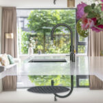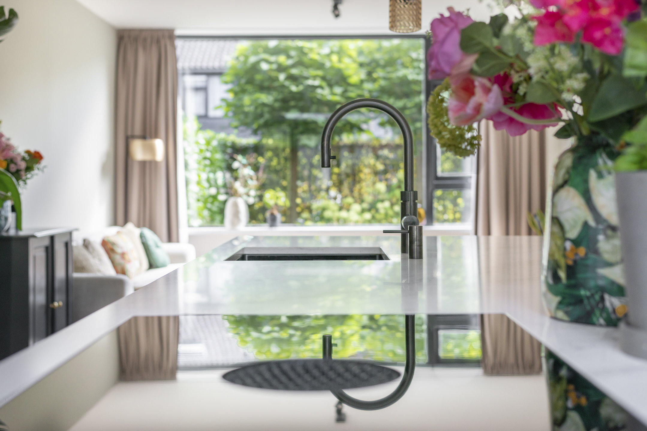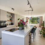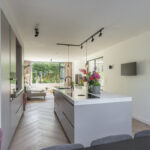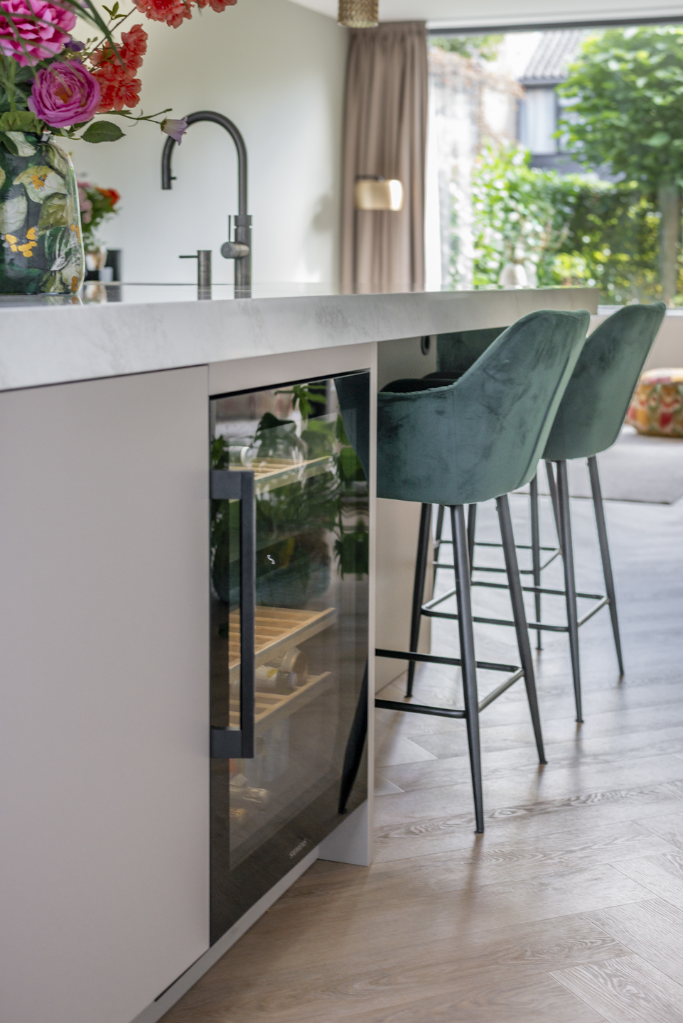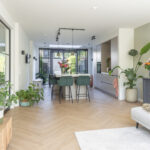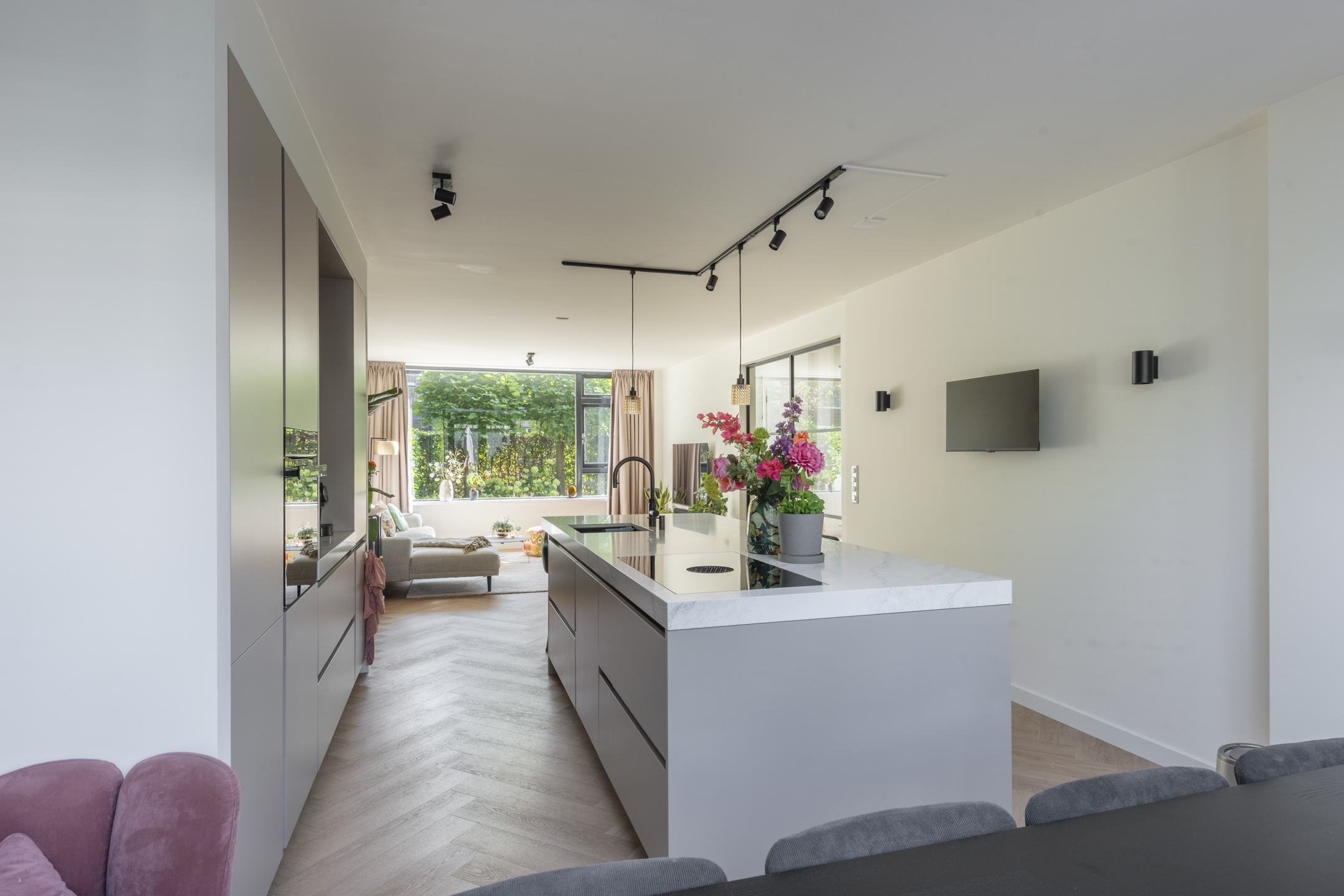 Entree, hal met garderobe, modern toilet en trapkast. Ruime woonkamer met een prachtige visgraat PVC vloer met vloerverwarming, Hue verlichting en Sonos geluidsinstallatie. Aansluitend bevindt zich de uitgebouwde woonkeuken, voorzien van kook- en spoeleiland, volop bergruimte en luxe inbouwapparatuur zoals o.a. een quooker met koel- en bruiswater, Bora inductiekookplaat met afzuiging, wijnklimaatkast e.d. Dankzij de grote lichtkoepel is er veel natuurlijke lichtinval en de openslaande deuren bieden toegang tot de zonnige besloten achtertuin.