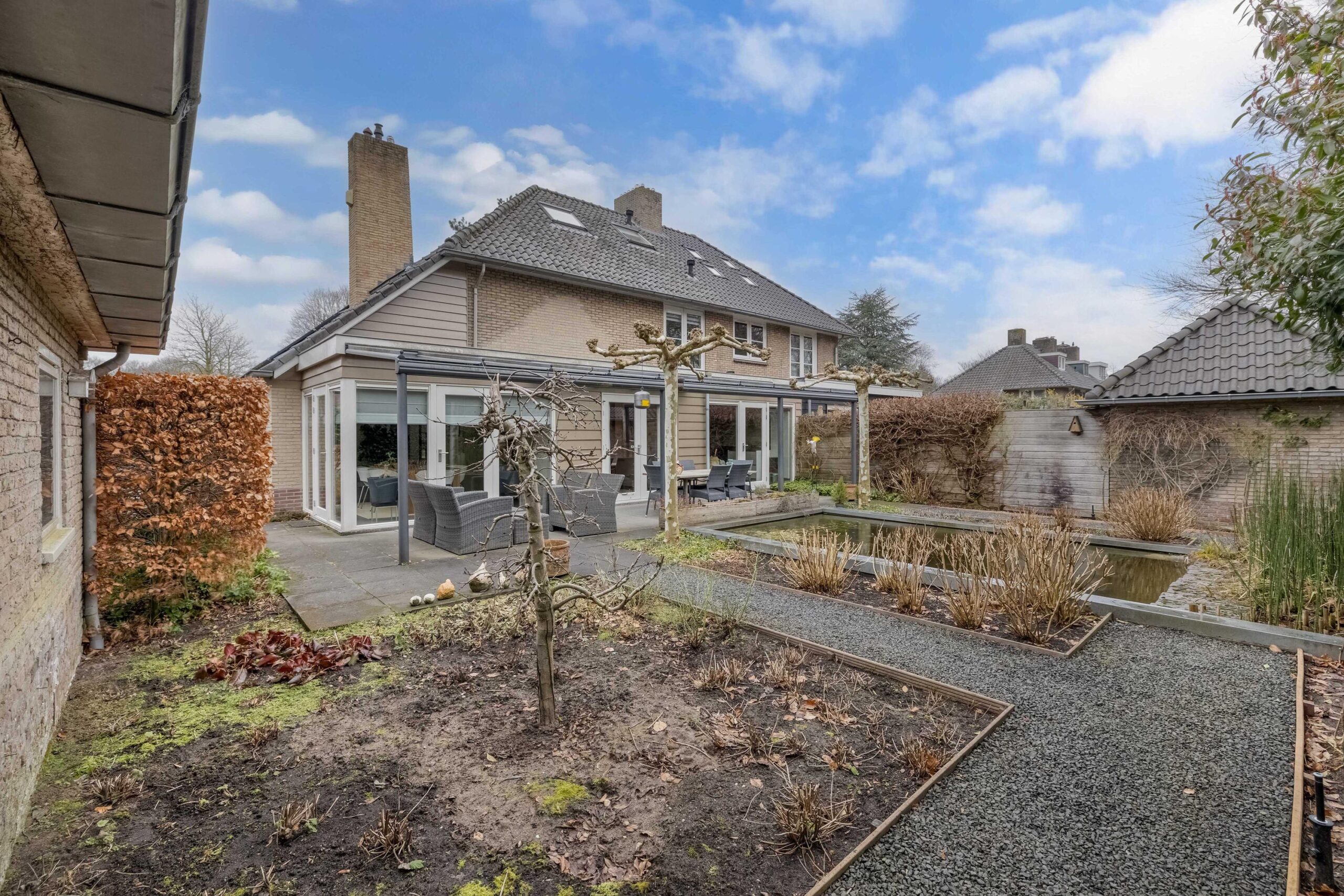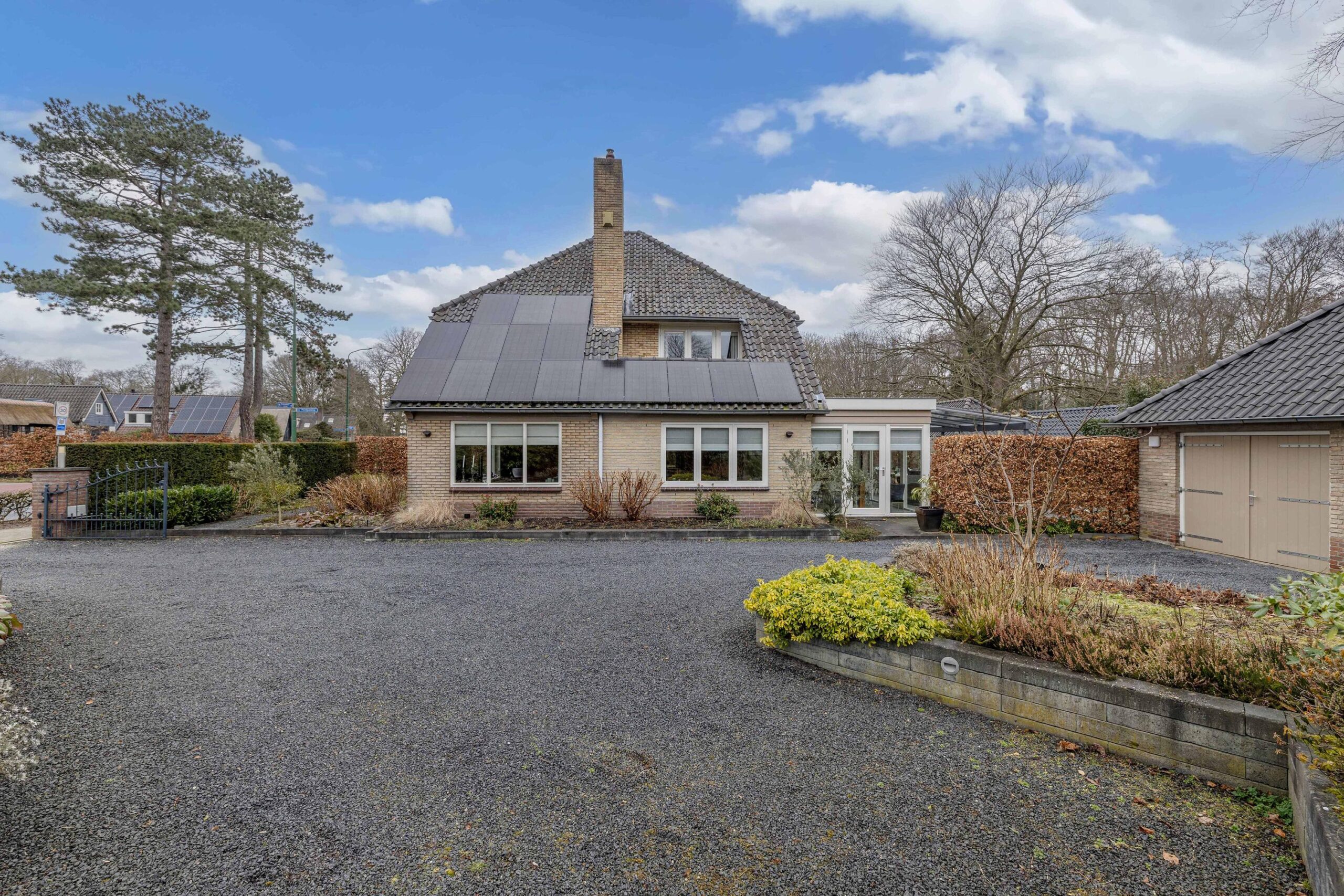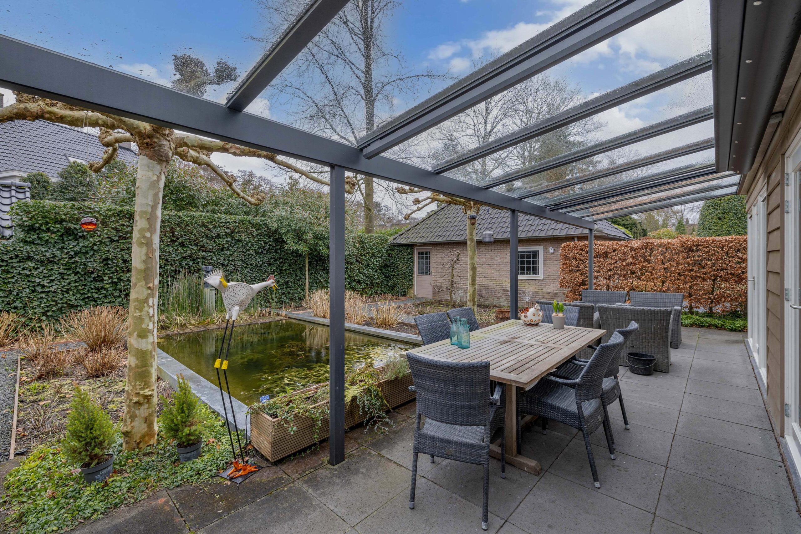 Er is een royale voor, zij en achtertuin. De zijtuin beschikt over meerdere parkeerplaatsen op eigen terrein en een vrijstaande stenen garage en een separate berging. De achtertuin is besloten met een groene haag beschikt over een fantastische glazen overkapping en veel privacy. U kunt hier heerlijk in de zon toeven. ook vanuit de achtertuin is de garage bereikbaar.