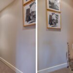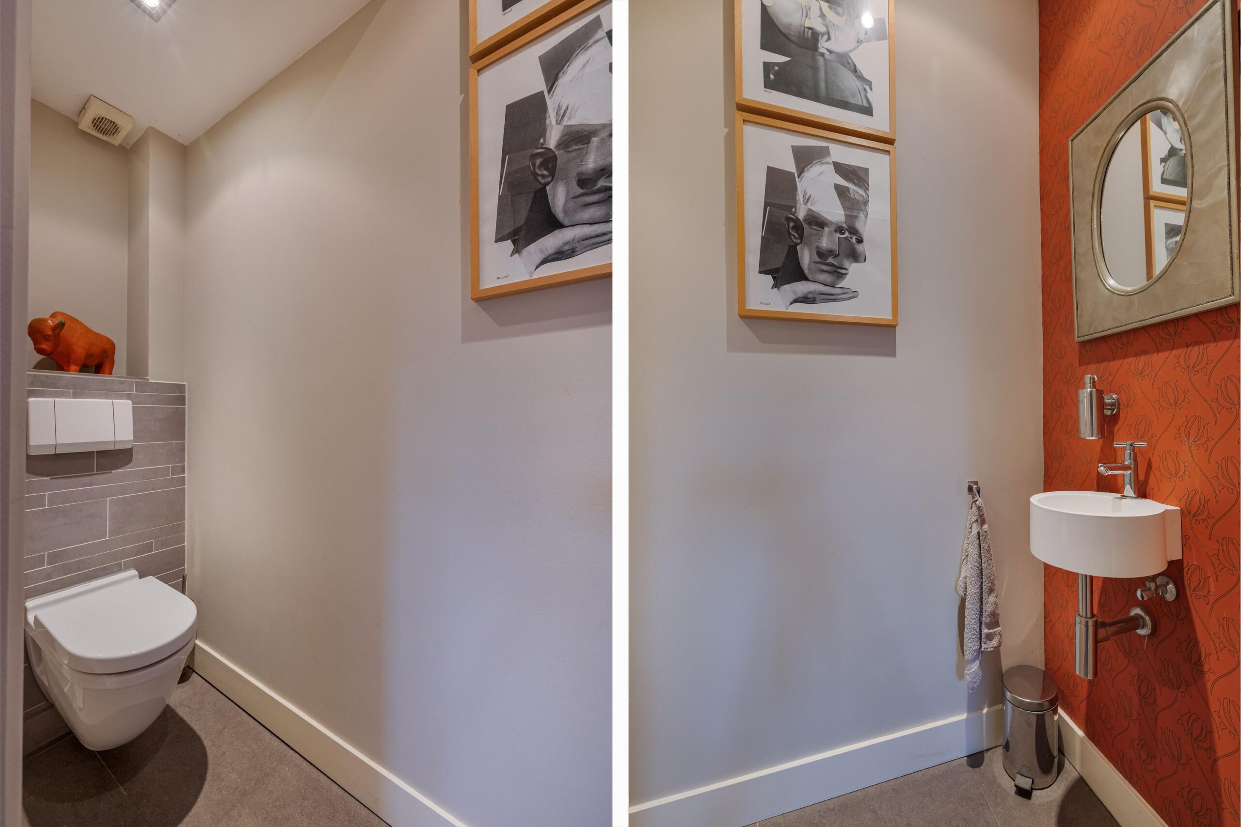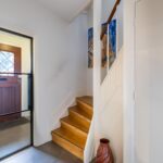 Entree, hal, trap naar de kelder, modern royaal toilet met fontein, deur naar de woonkamer.