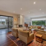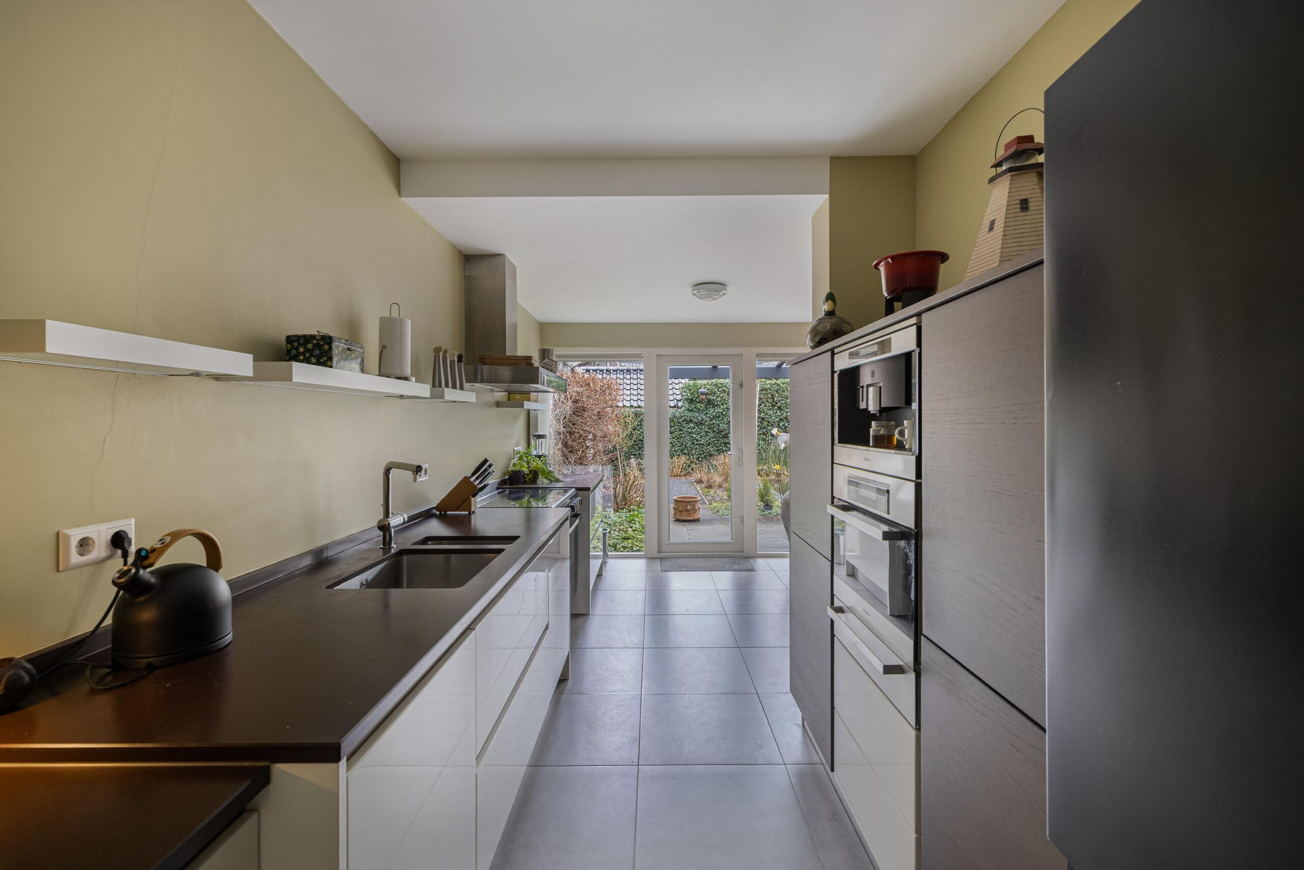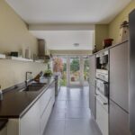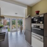 Gezellige woonkamer met gashaard waar u heerlijk kunt zitten, separate tv hoek, eetgedeelte met openslaande deuren naar de achtertuin, half open moderne keuken met inbouwapparatuur en deur naar de achtertuin.
