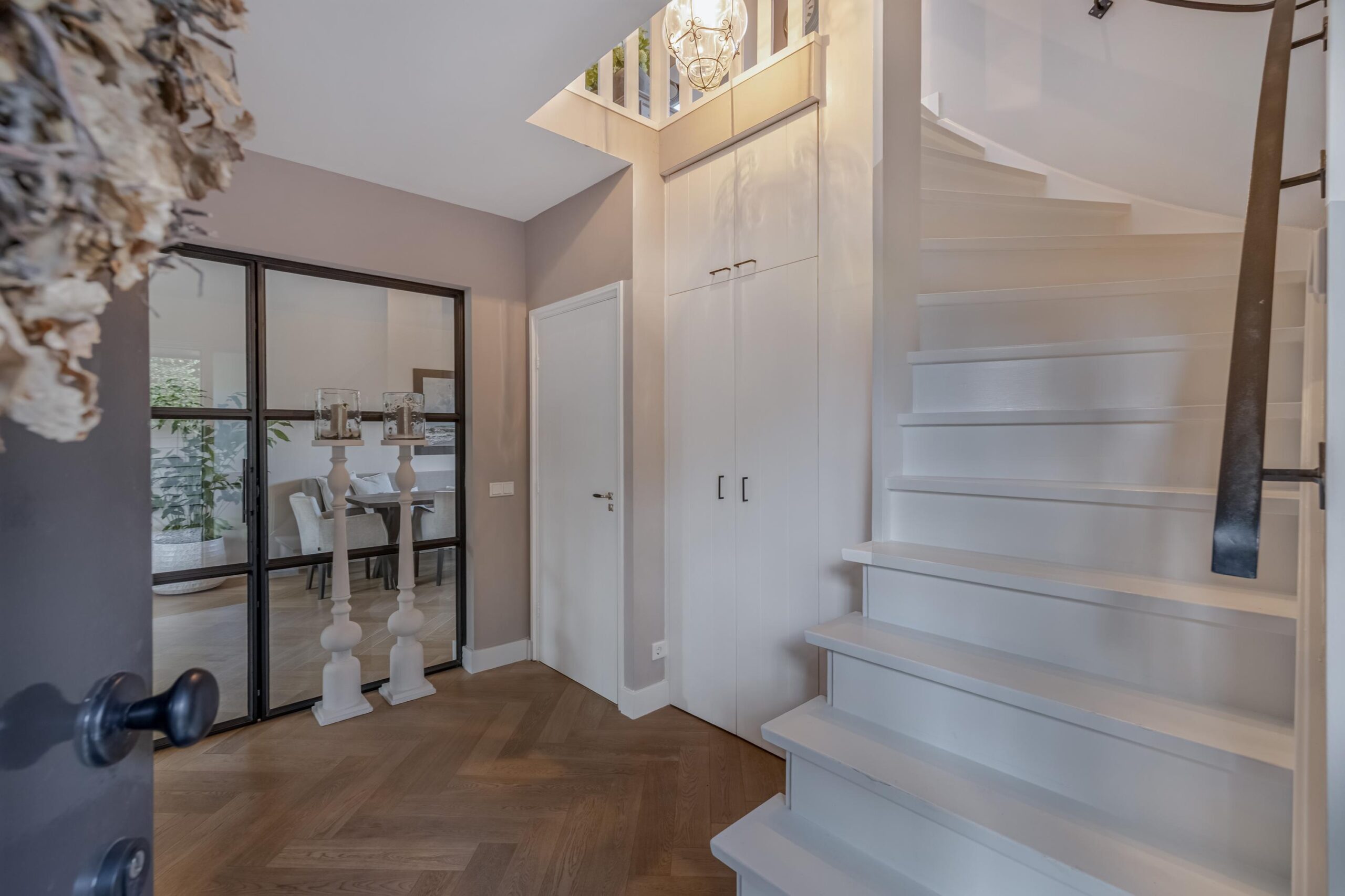 Ruime entree met garderobekasten, modern toilet, toegang tot de stahoogte kelder en trapopgang naar de eerste verdieping. Via de stalen deur in de hal betreedt je het woongedeelte met aan de voorzijde een ruim zitgedeelte met open haard. De woning heeft een tuingerichte open keuken met openslaande deuren naar de achtertuin.