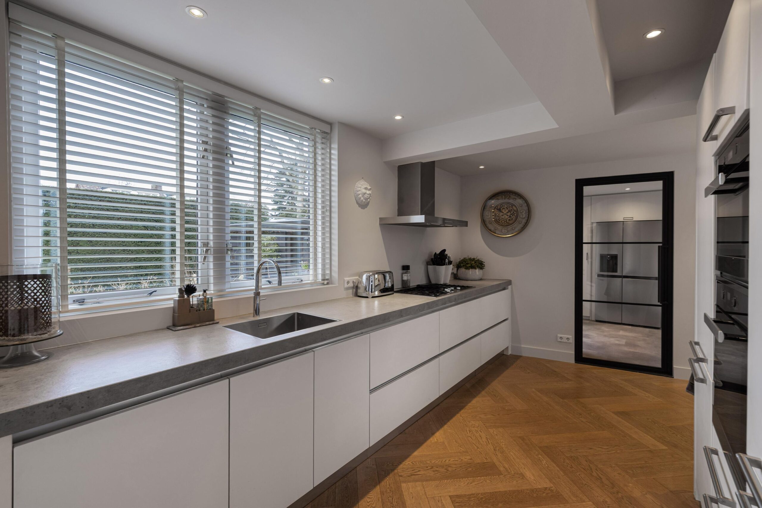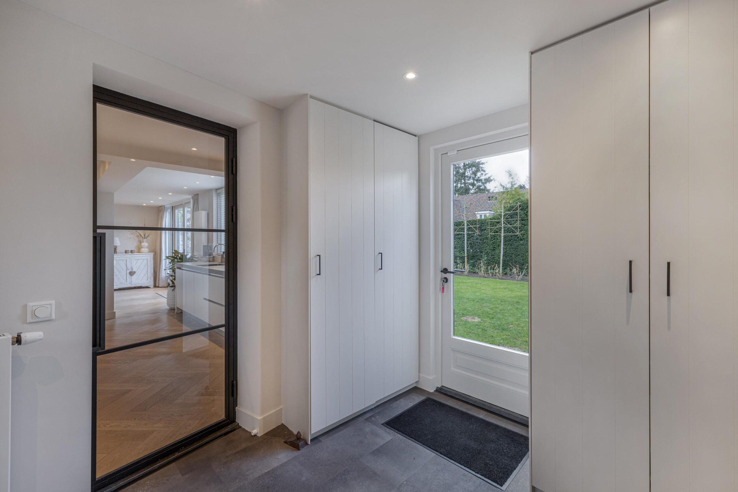 Naast de keuken is er een doorloop naar de bijkeuken met aparte toegangsdeur, extra koelkast, gootsteen, veel bergruimte voor schoenen en jassen, ruimte voor de cv-opstelling (2025) en achterdeur naar de tuin.