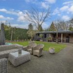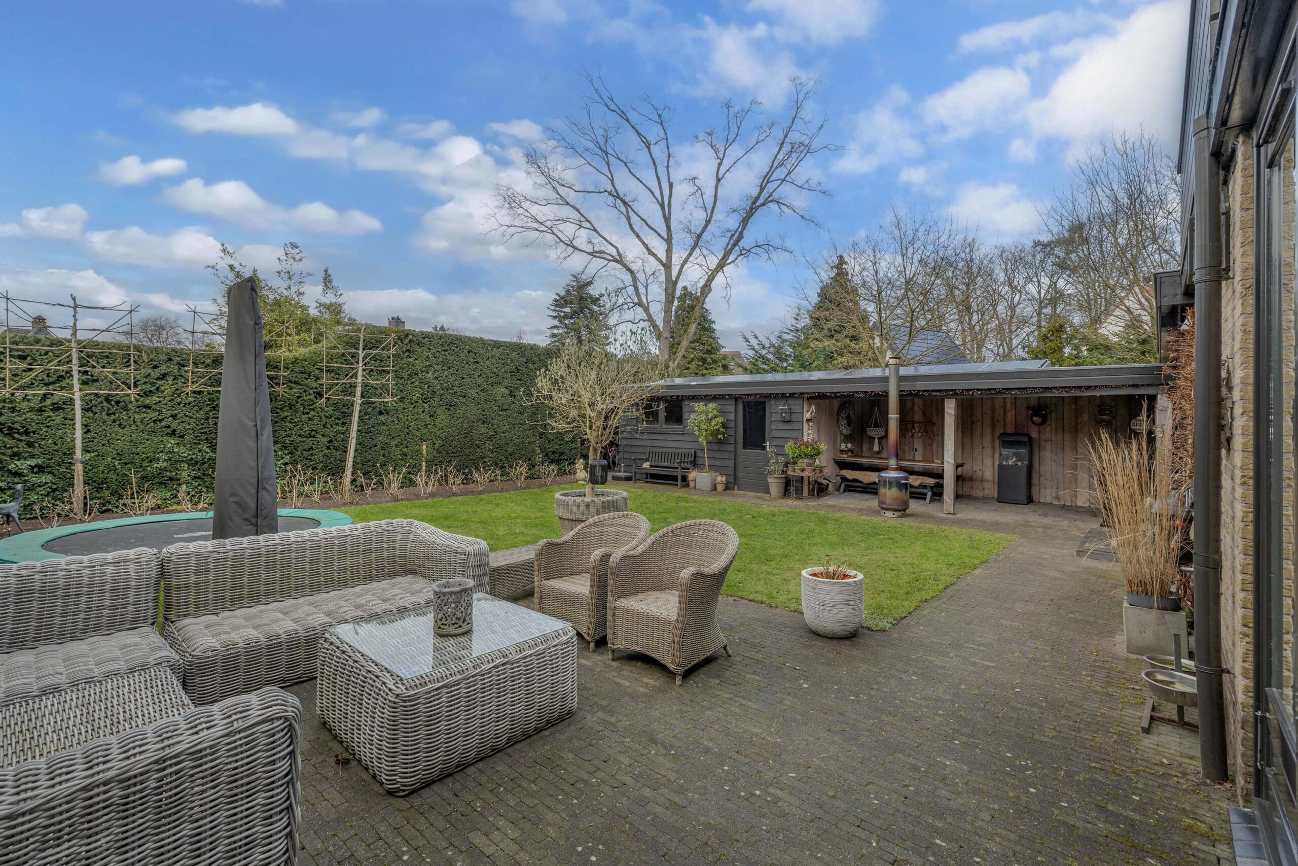 De prachtig aangelegde achtertuin biedt veel privacy en heeft nog een aparte berging en houten veranda met zitgedeelte inclusief heaters.