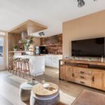 De woonkamer staat in open verbinding met de moderne keuken. Deze keuken, geplaatst in 2015, is uitgevoerd met een stijlvol kookeiland en biedt veel werk- en bergruimte. De keuken is voorzien van…