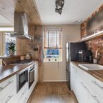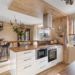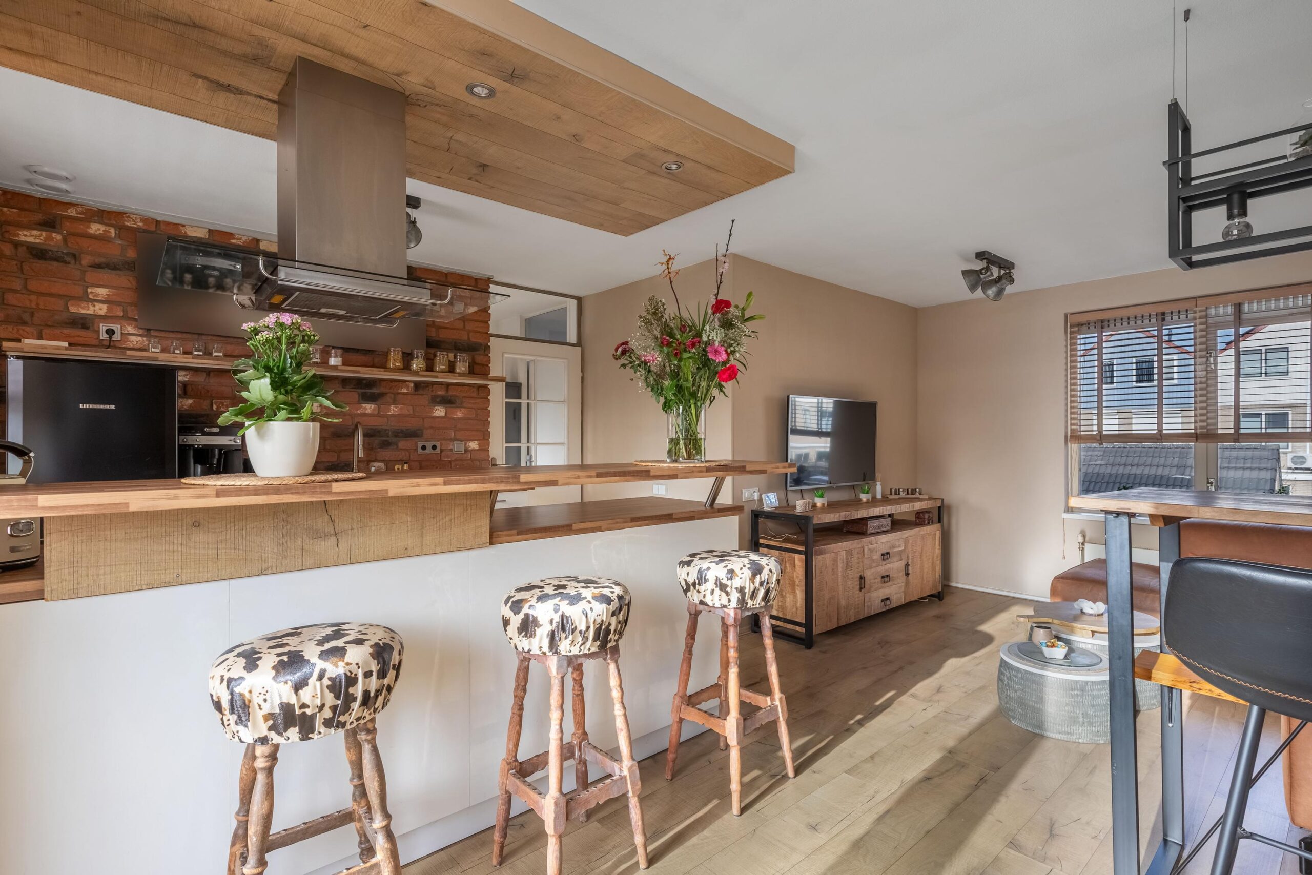 De woonkamer staat in open verbinding met de moderne keuken. Deze keuken, geplaatst in 2015, is uitgevoerd met een stijlvol kookeiland en biedt veel werk- en bergruimte. De keuken is voorzien van diverse inbouwapparatuur, waaronder een vaatwasser, gaskookplaat, afzuigkap en een koel-vriescombinatie.