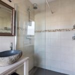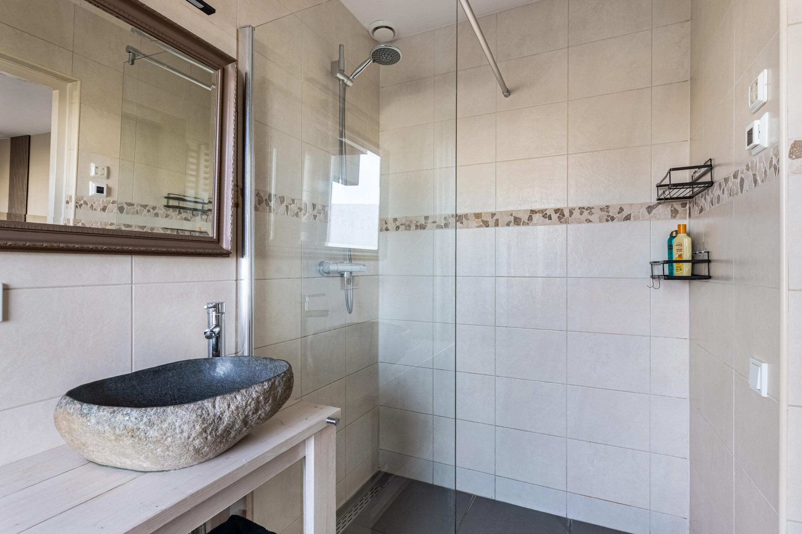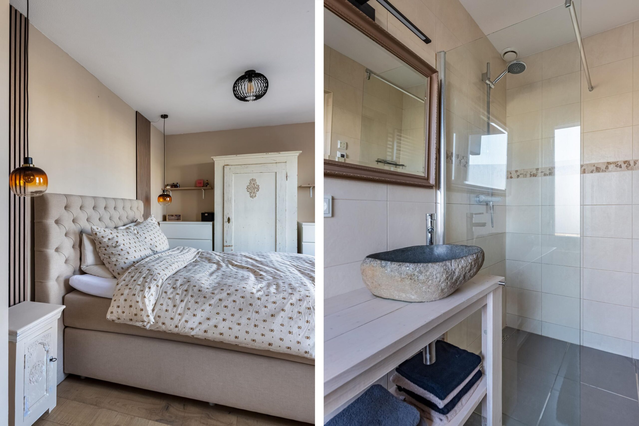 De slaapkamer is ruim van opzet en beschikt over een ensuite badkamer. Deze badkamer is eveneens vernieuwd in 2015 en uitgevoerd met een inloopdouche en een wastafel.