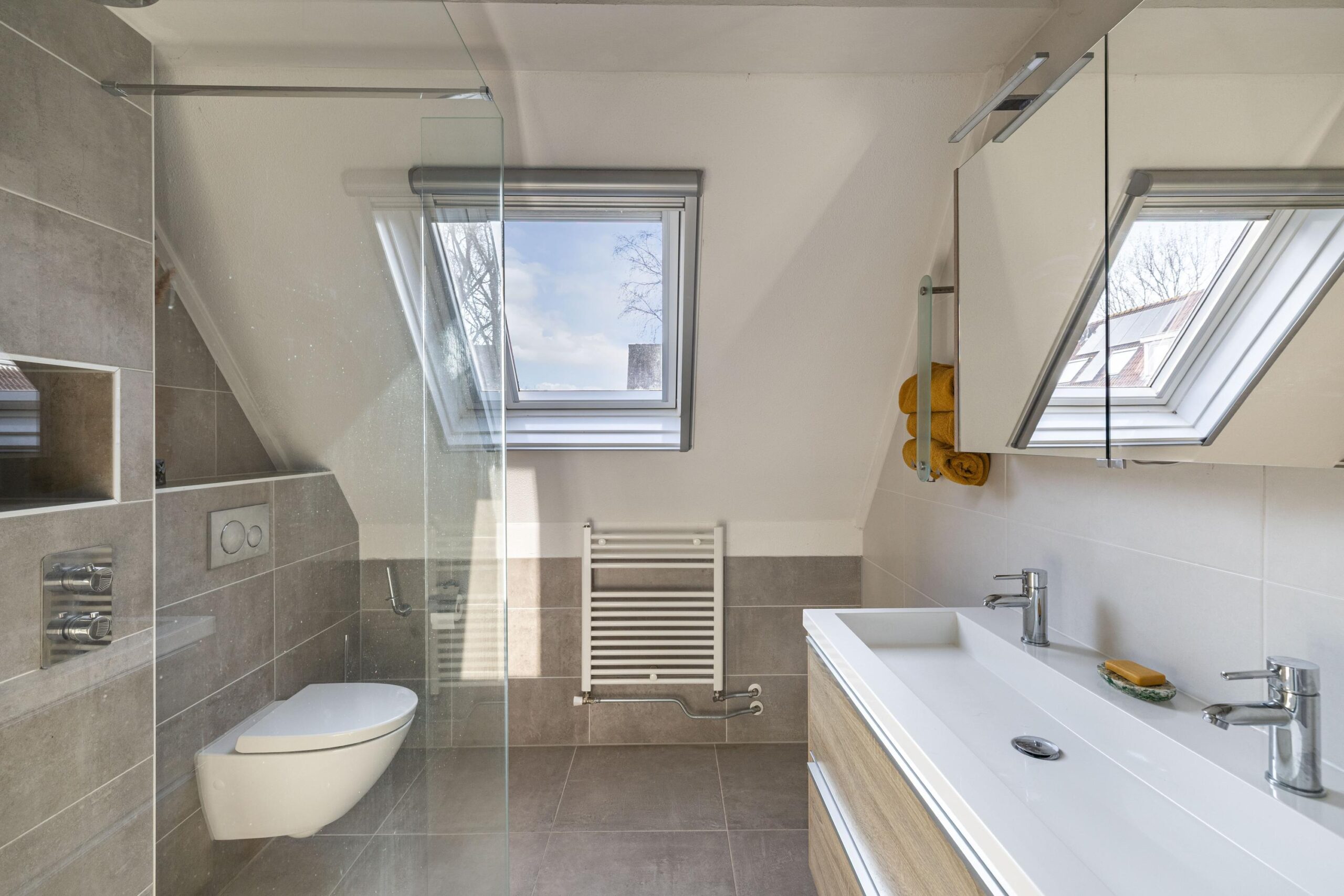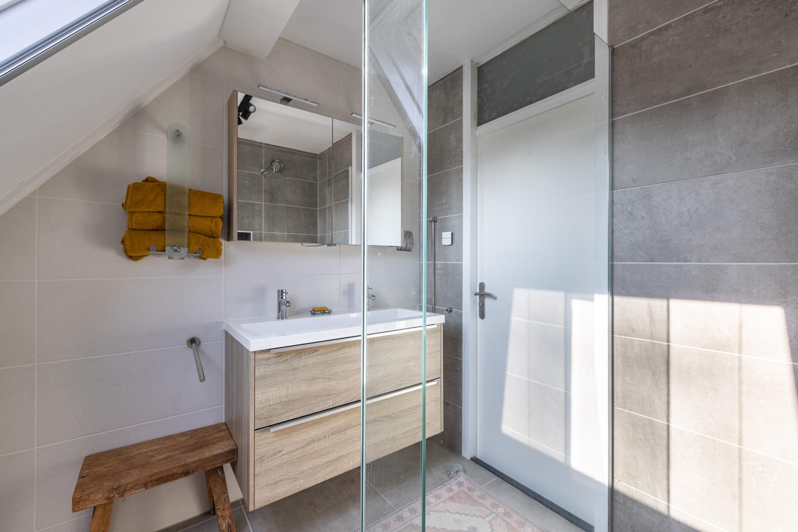 De moderne badkamer, vernieuwd in 2018, is strak afgewerkt en voorzien van een comfortabele inloopdouche, een dubbele wastafel met meubel en een tweede toilet.