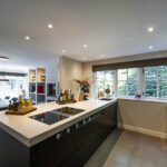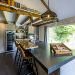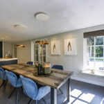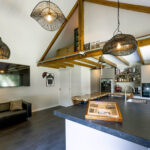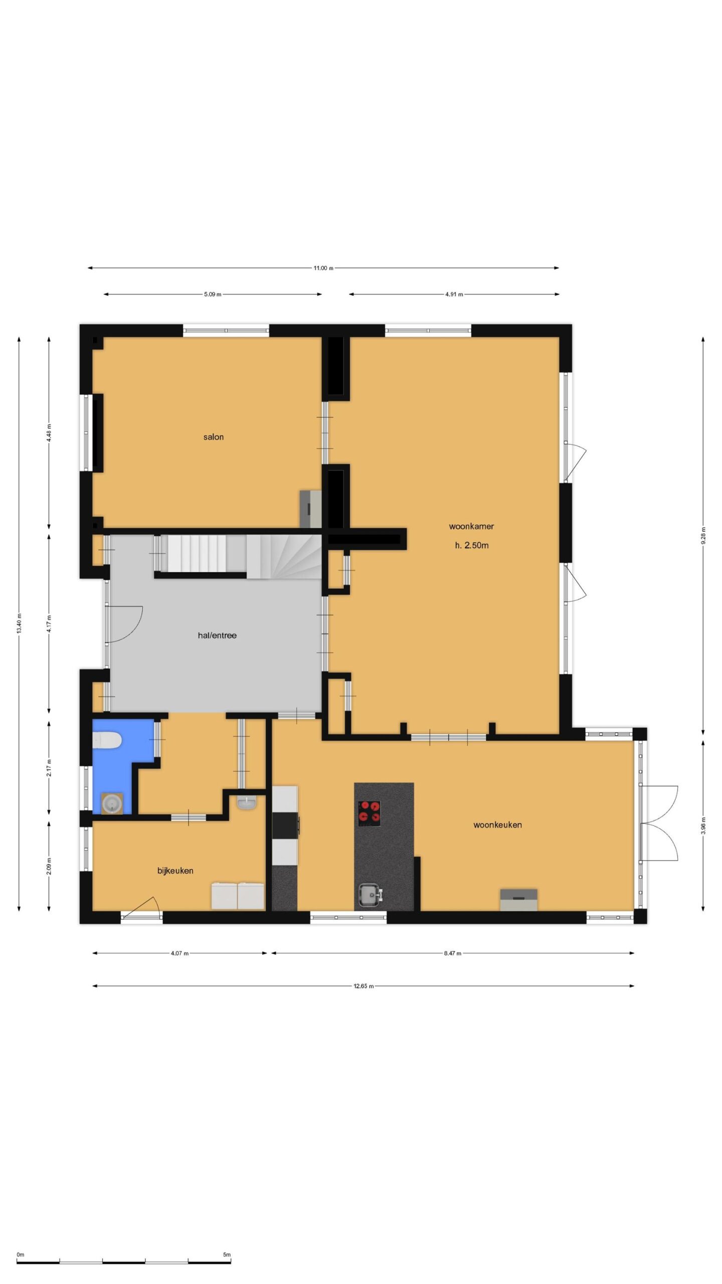De ruime woon-/eetkeuken, eveneens met openslaande deuren naar het terras en de tuin, vormt het hart van de woning. Deze moderne keuken is voorzien van hoogwaardige inbouwapparatuur en nodigt direct uit tot culinaire avonden met familie en vrienden. Via de centrale hal bereikt u tevens de bijkeuken met veel kastruimte en een praktische zijingang.