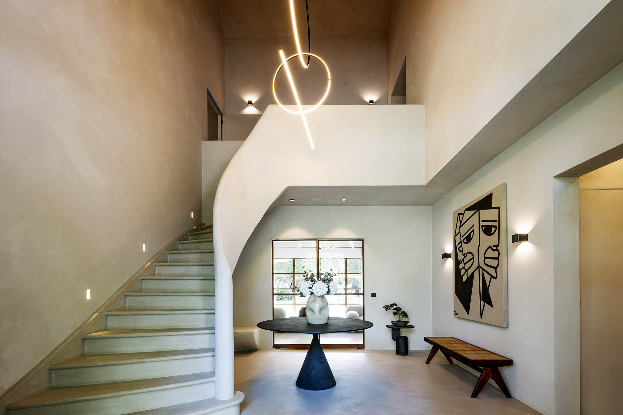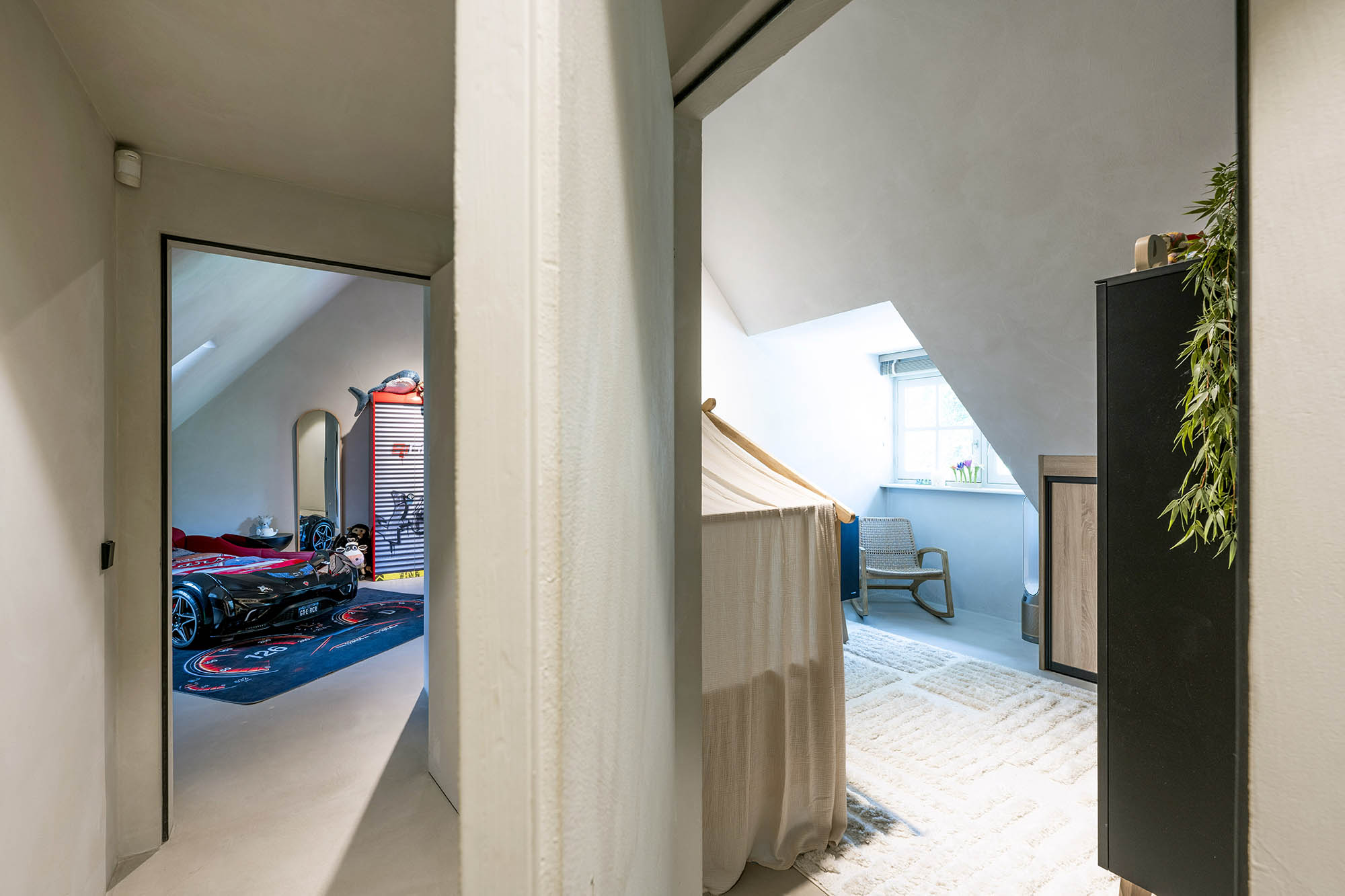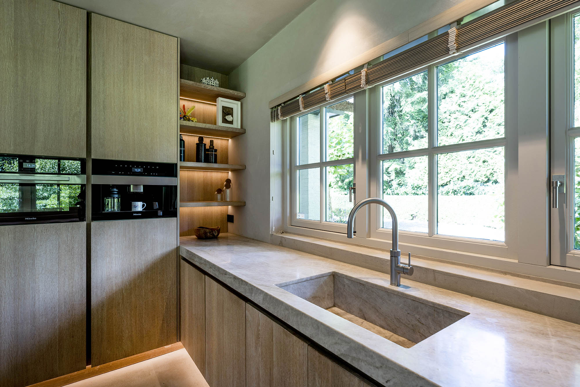 Bij binnenkomst omarmt de royale hal u met haar lichte sfeer en de uitnodigende vide. Vanuit hier leidt een dubbele deur u naar het hart van het huis: een magnifieke woonkeuken met een adembenemend Taj Mahal marmeren eiland, uitgerust met een PITT cooking systeem en een slim verzonken tv-mechaniek. De warme haard en openslaande deuren openen de ruimte naar de riante tuin, alsof binnen en buiten in perfecte harmonie samensmelten.