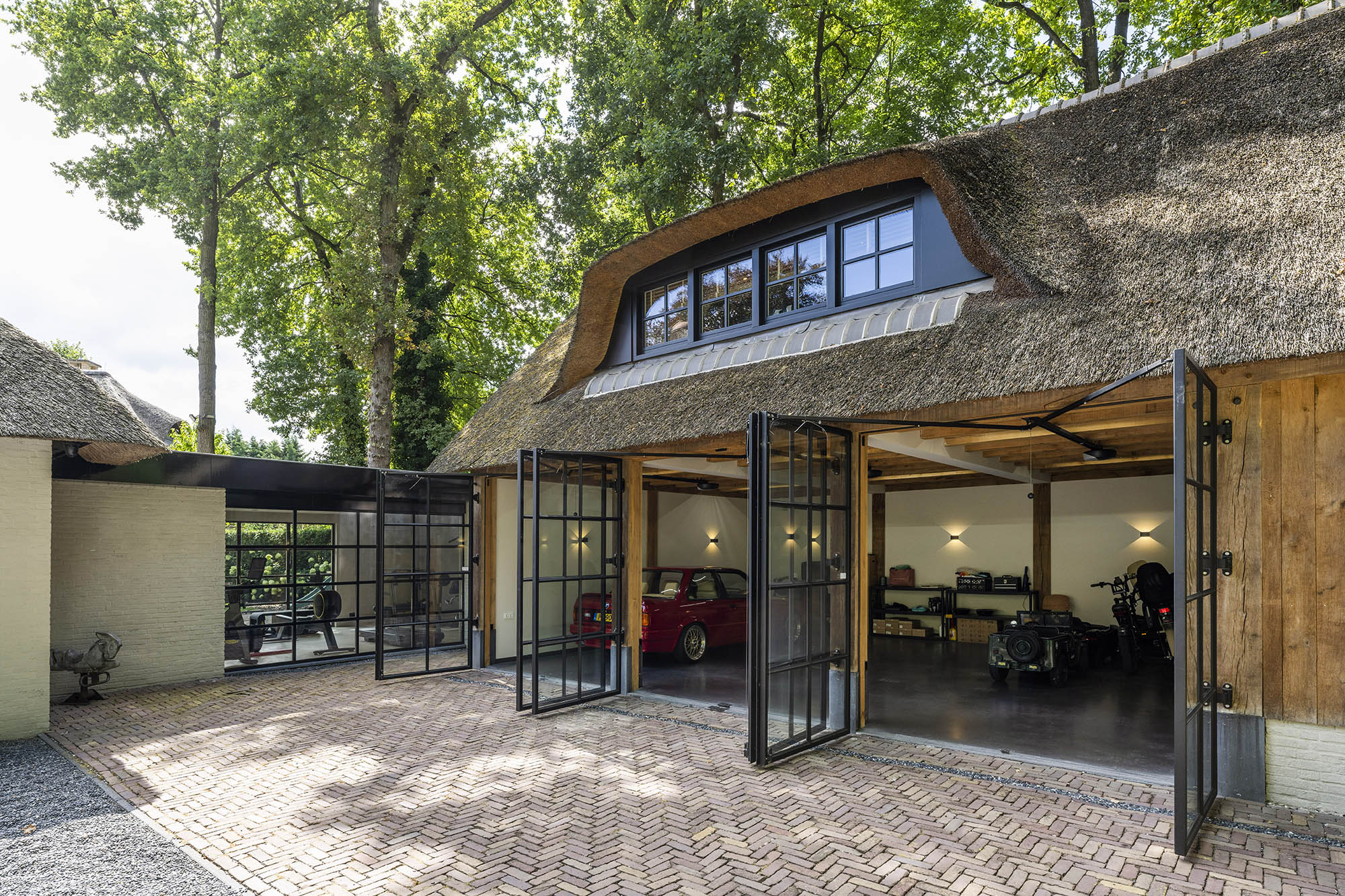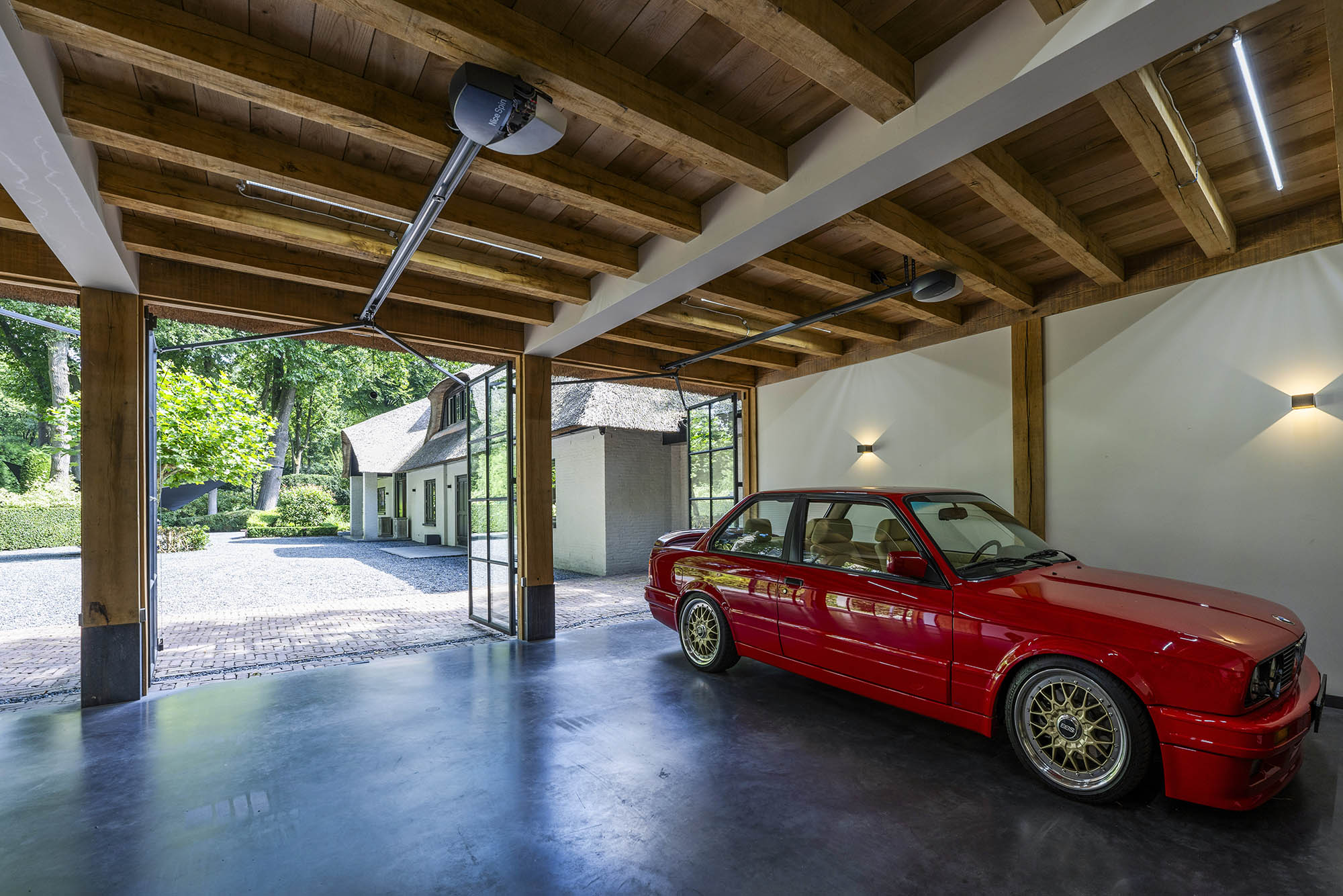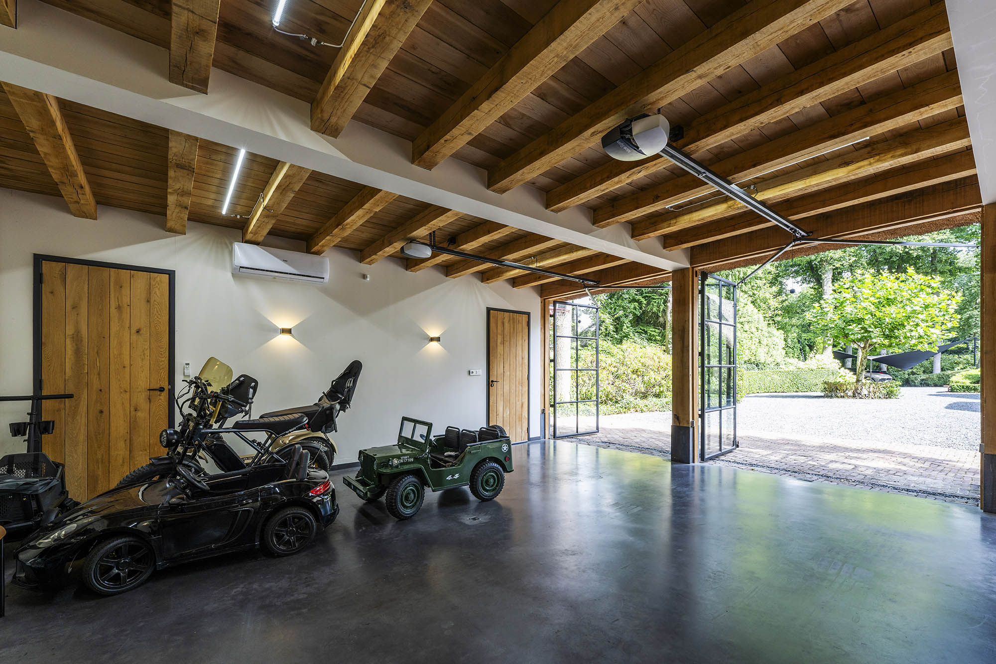 Naast de royale slaapkamers en badkamers, biedt het landhuis praktische luxe met een inpandige garage en een bijzondere driedubbele vrijstaande garage van 60m2, inclusief gastenverblijf van 56m2 – perfect voor vrienden, familie of als inspirerende werkruimte.