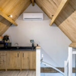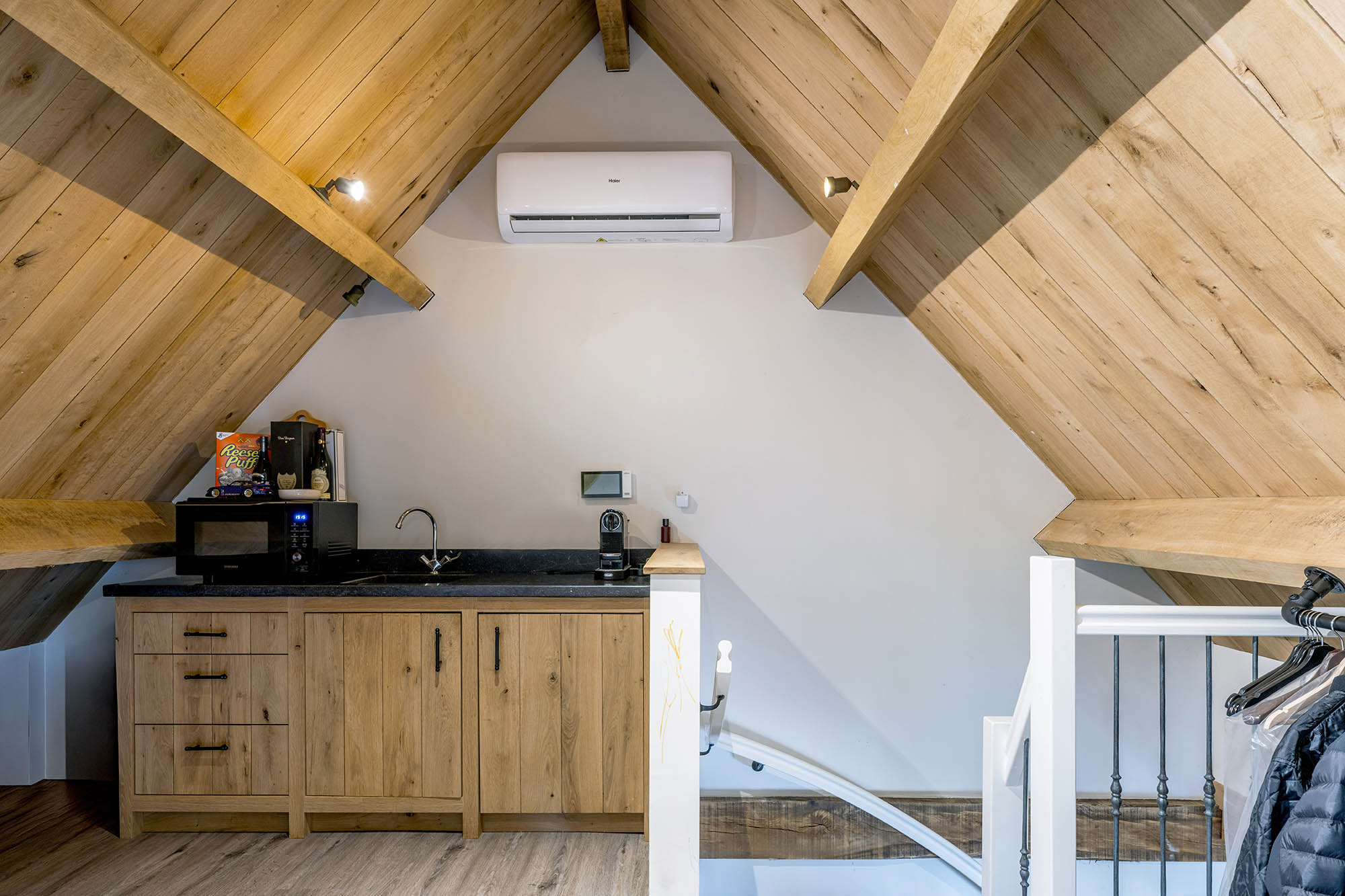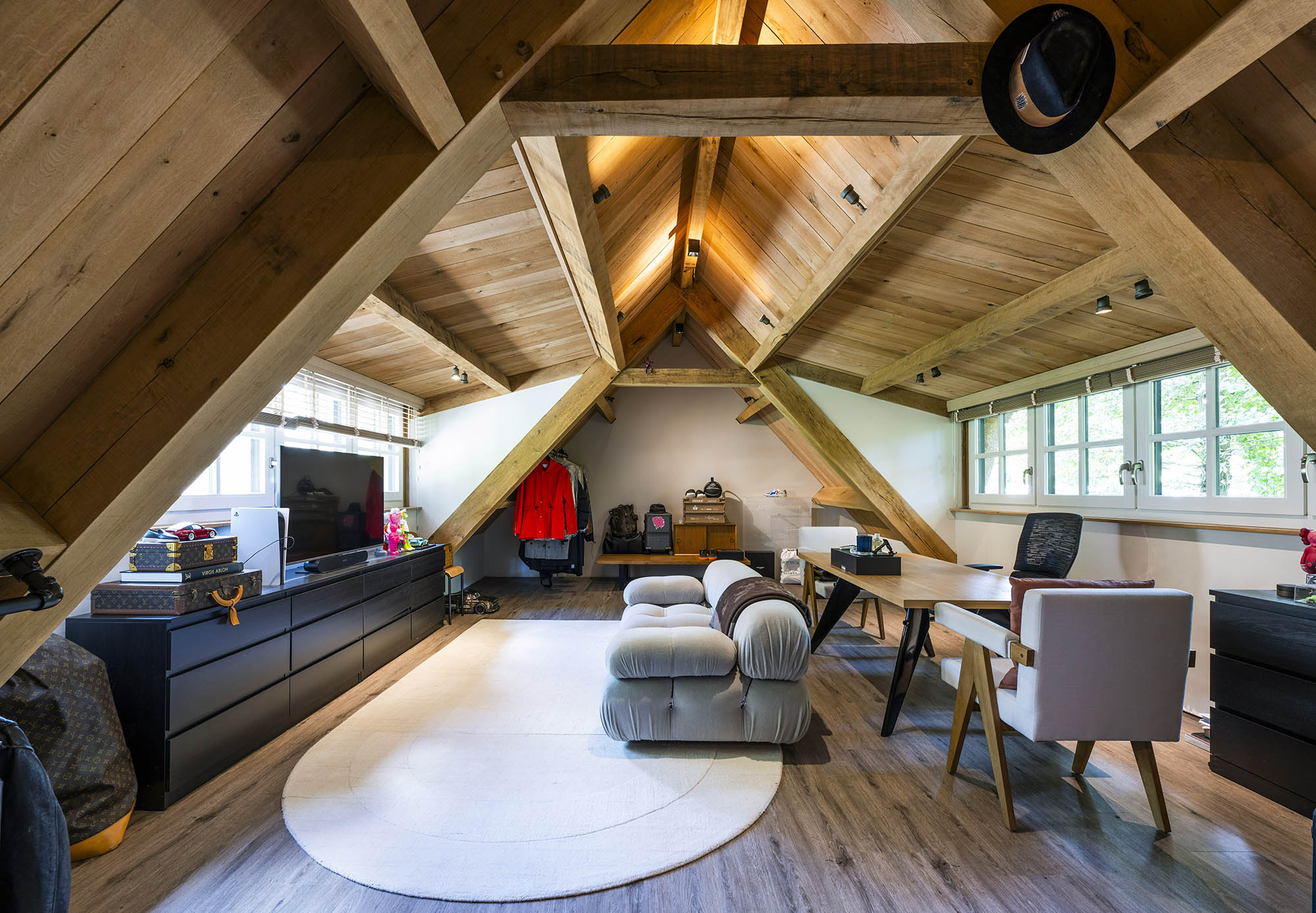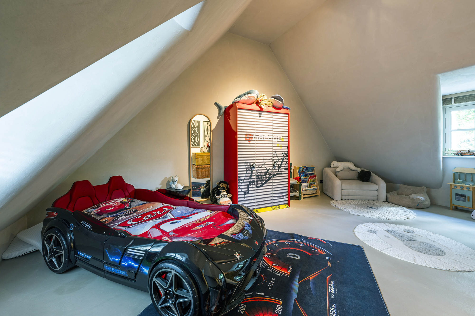 Naast de royale slaapkamers en badkamers, biedt het landhuis praktische luxe met een inpandige garage en een bijzondere driedubbele vrijstaande garage van 60m2, inclusief gastenverblijf van 56m2 – perfect voor vrienden, familie of als inspirerende werkruimte.