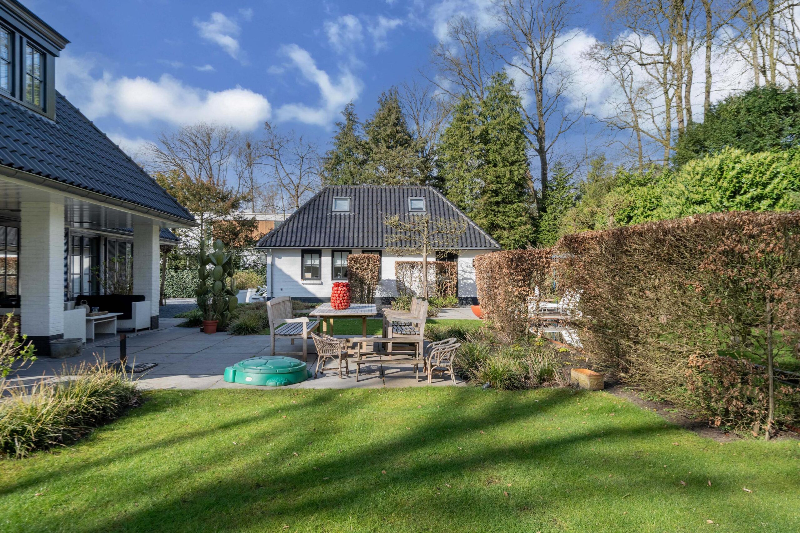 De villa staat op een riant perceel van bijna 3.000m² met een fraai aangelegde, goed op de zon en vrij gelegen royale tuin rondom, welke veel privacy biedt. Er zijn diverse plekken in de tuin waar u heerlijk van de zon kunt genieten. U kunt op eigen terrein meerdere auto's parkeren en er is een carport achter de schuur aanwezig voor 2 auto's.