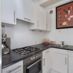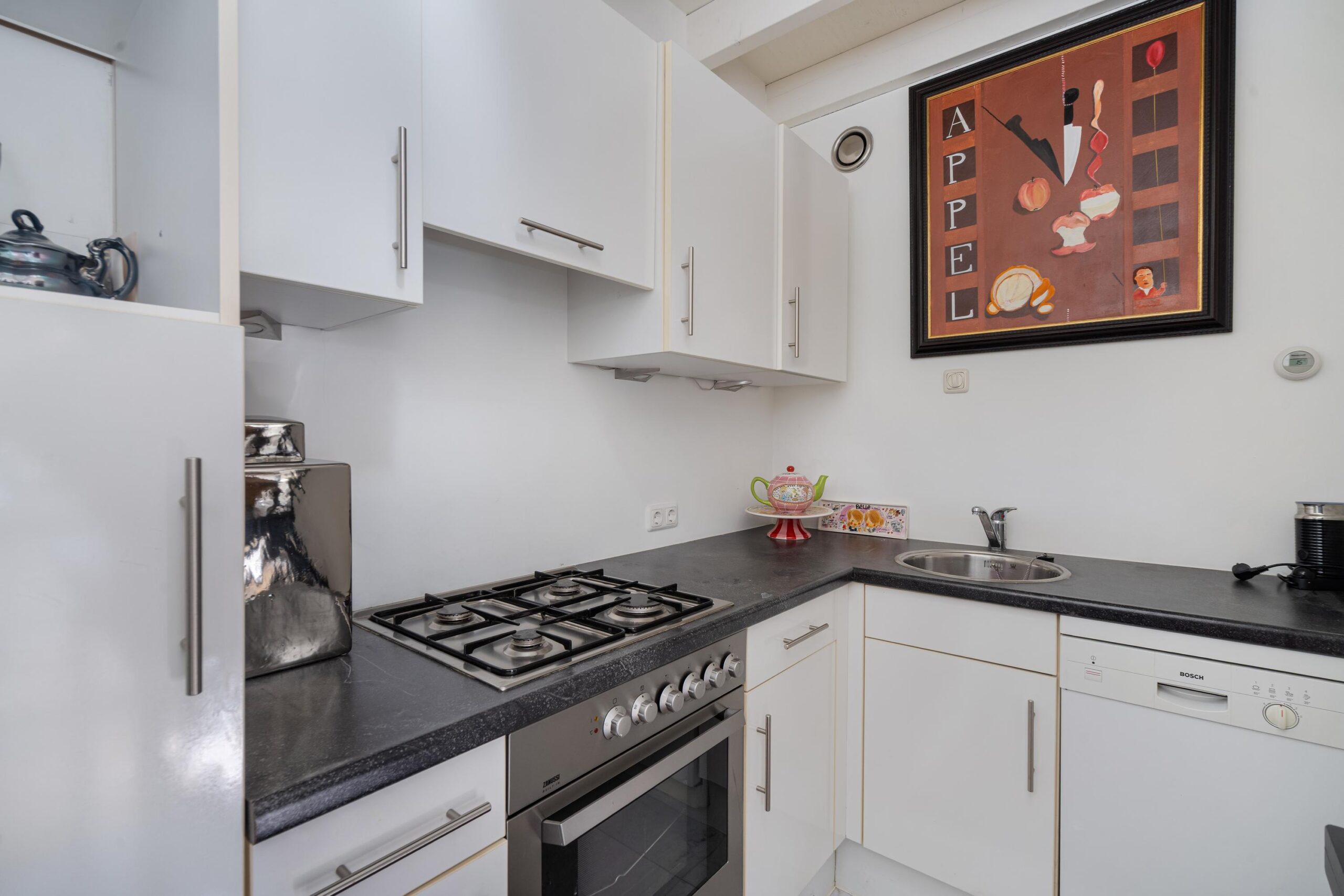 U treft hier een goede woonkamer met open keuken v.v. inbouwapparatuur, nette badkamer met douche, wastafek en toilet. Op de verdieping de slaapkamer.
