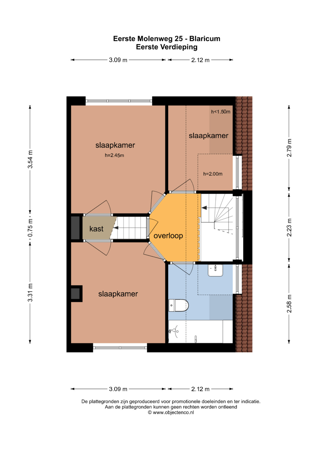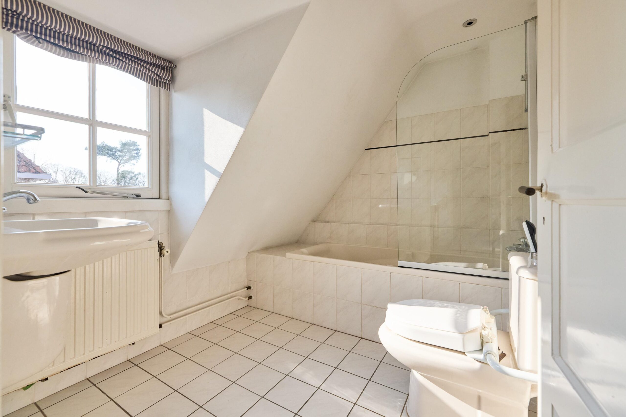 Eerste verdieping: overloop, eerste slaapkamer aan de voorzijde met vaste kast, tweede slaapkamer aan de achterzijde, derde slaapkamer met dakkapel. Badkamer met douche, wastafel, toilet en dakkapel.