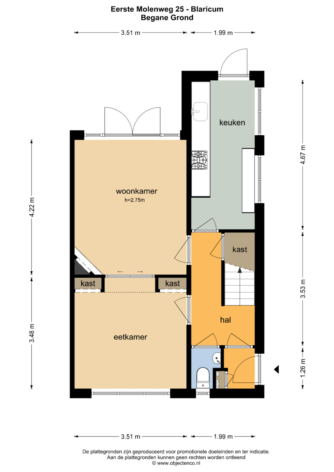 Begane grond: entree, vestibule, hal met toilet, trapopgang, trapkast en toegang tot de eetkamer, woonkamer en keuken. Dichte keuken met een tweetal grote ramen waardoor veel lichtinval en deur naar achtertuin. Aan de achterzijde van de woning de woonkamer met open haard, en suite schuifdeuren naar de eetkamer en openslaande deuren naar achtertuin. De eetkamer aan de voorzijde van de woning is toegankelijk middels en suite deuren vanuit de woonkamer en middels de hal en is voorzien van een tweetal vaste kasten.