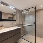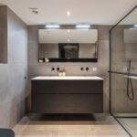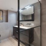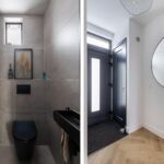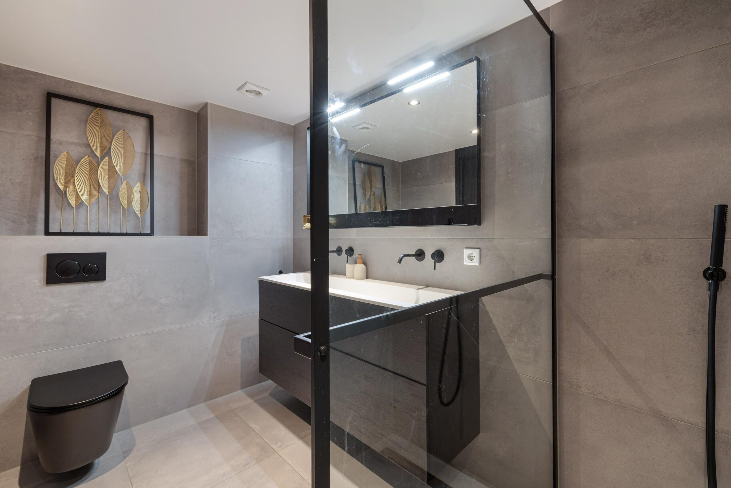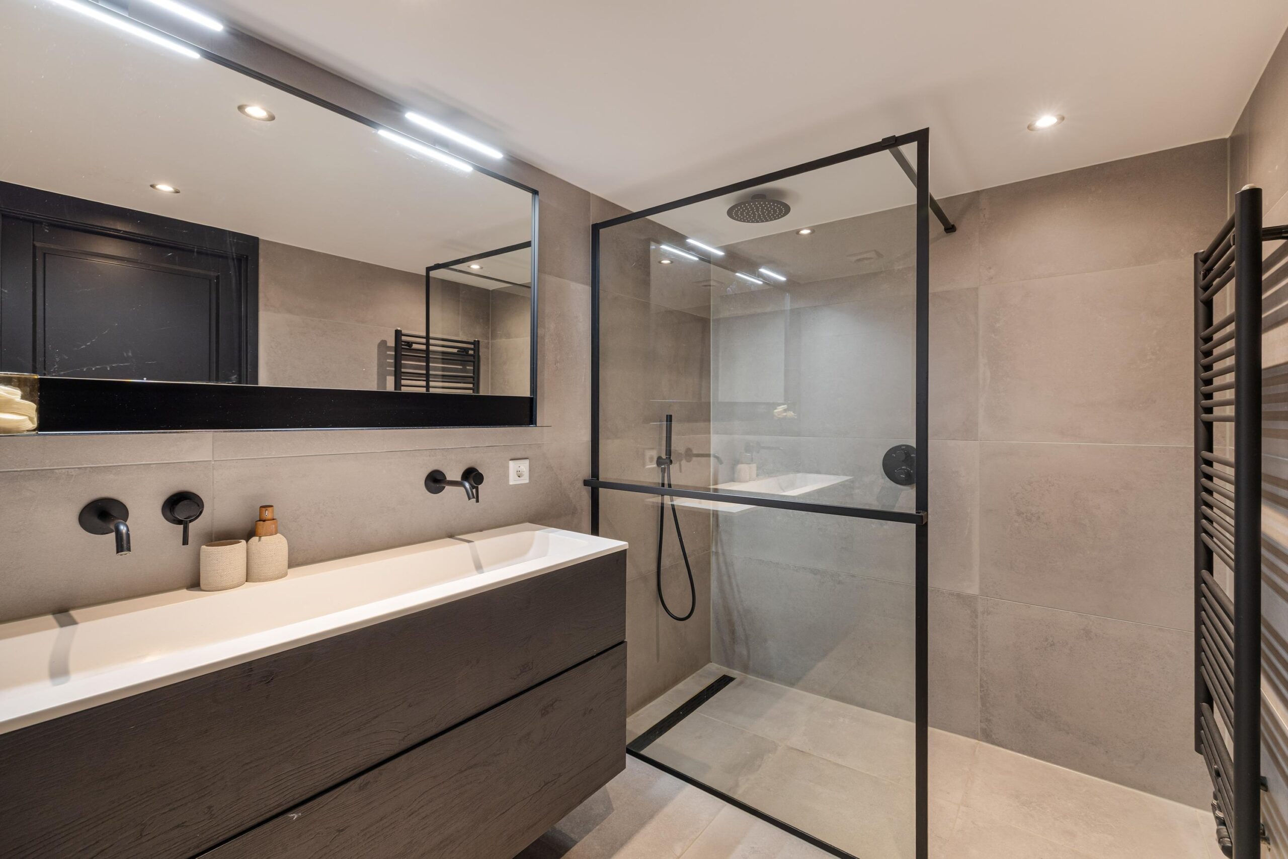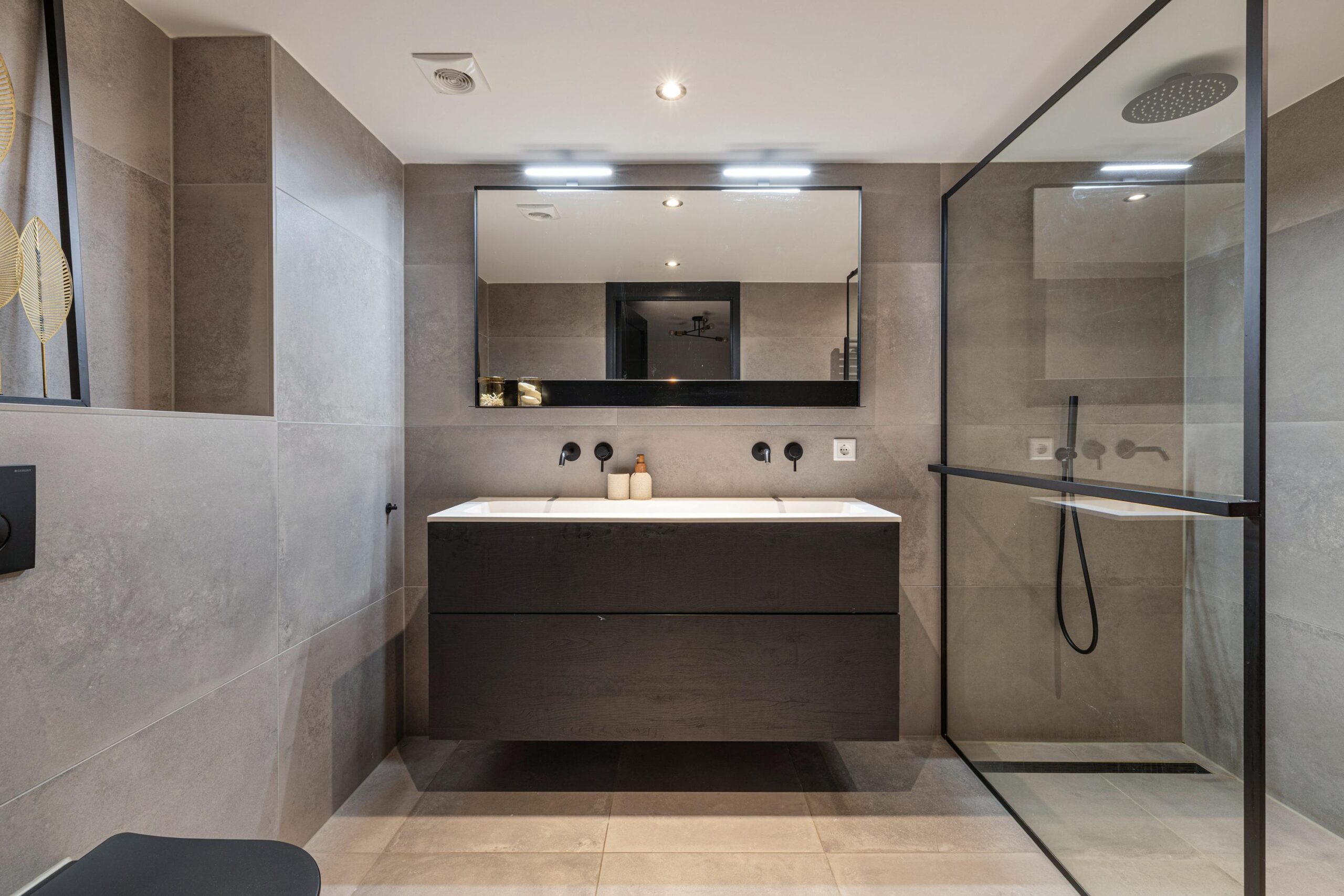 - Moderne badkamer (2021) met groot tegelwerk, zwart sanitair en dubbel wastafelmeubel;