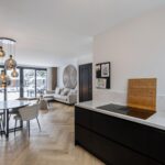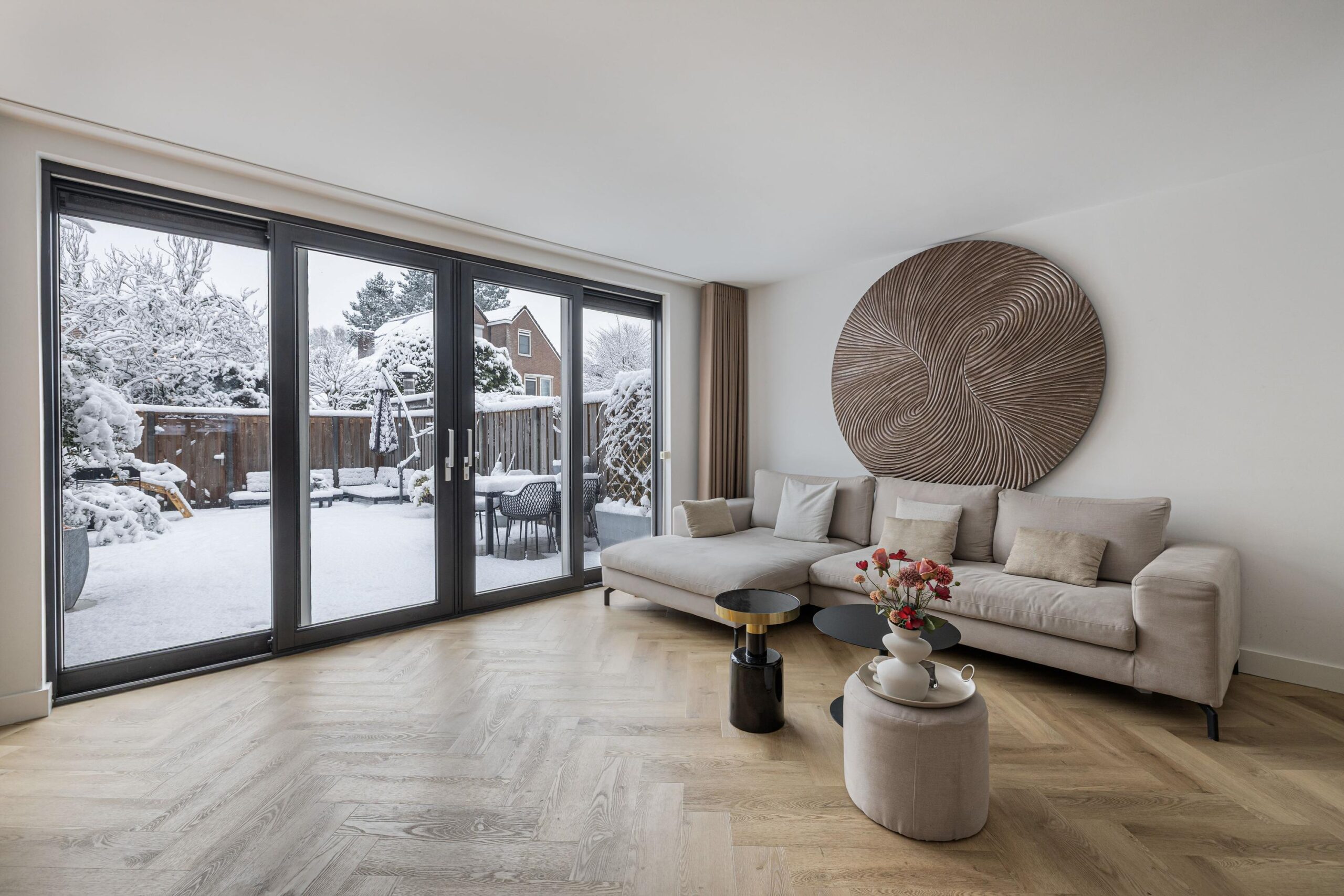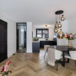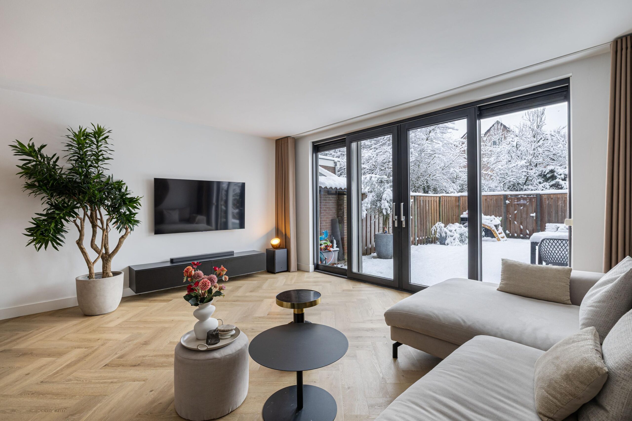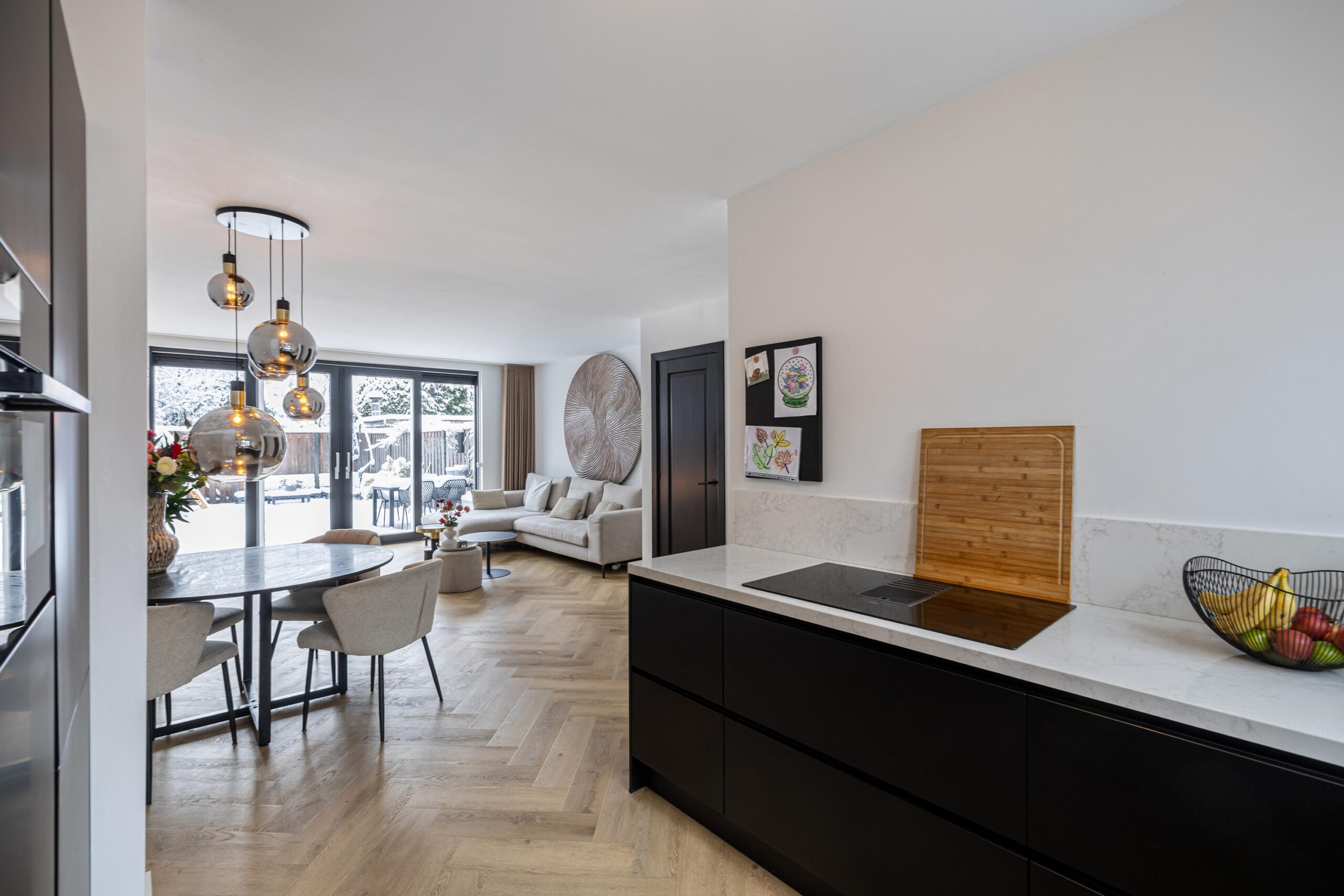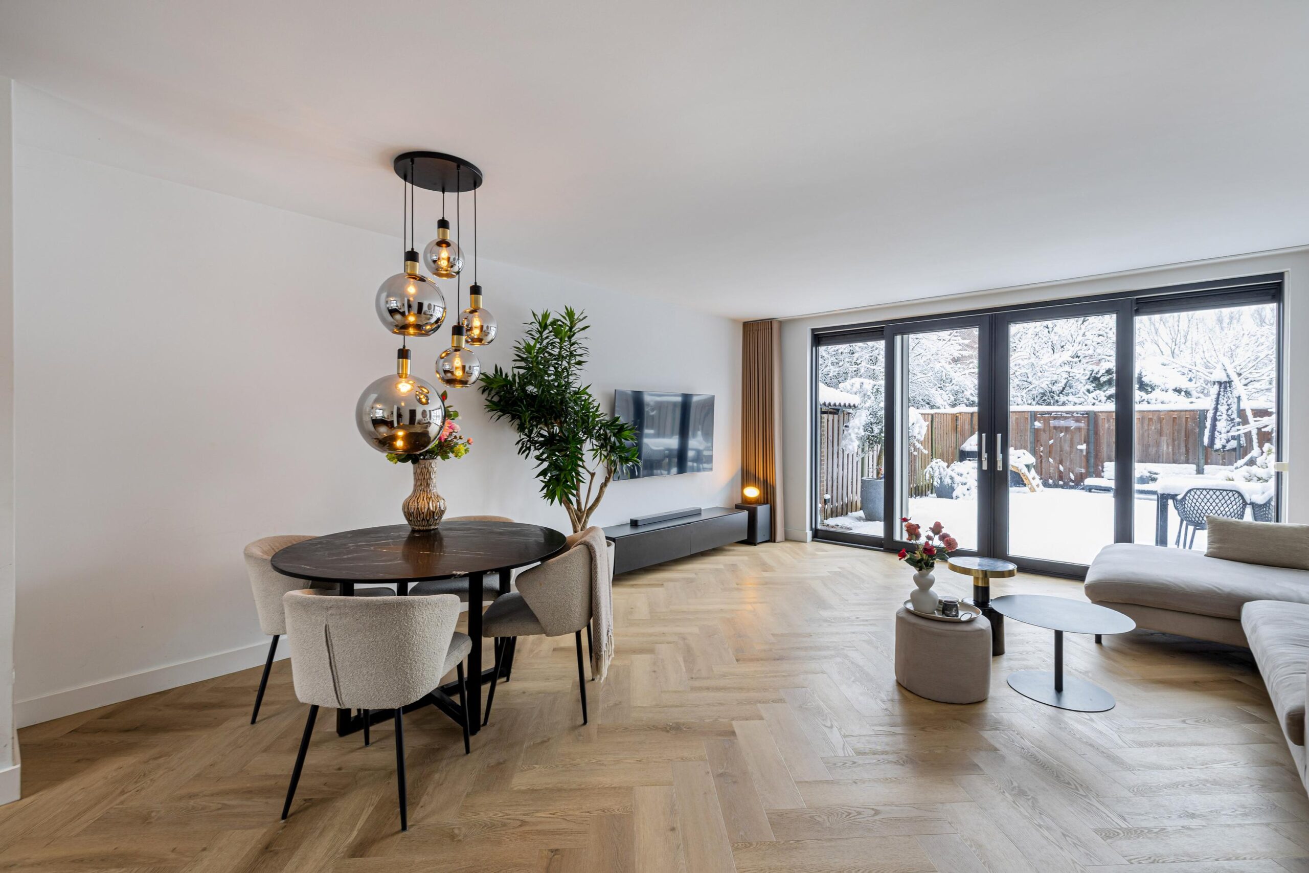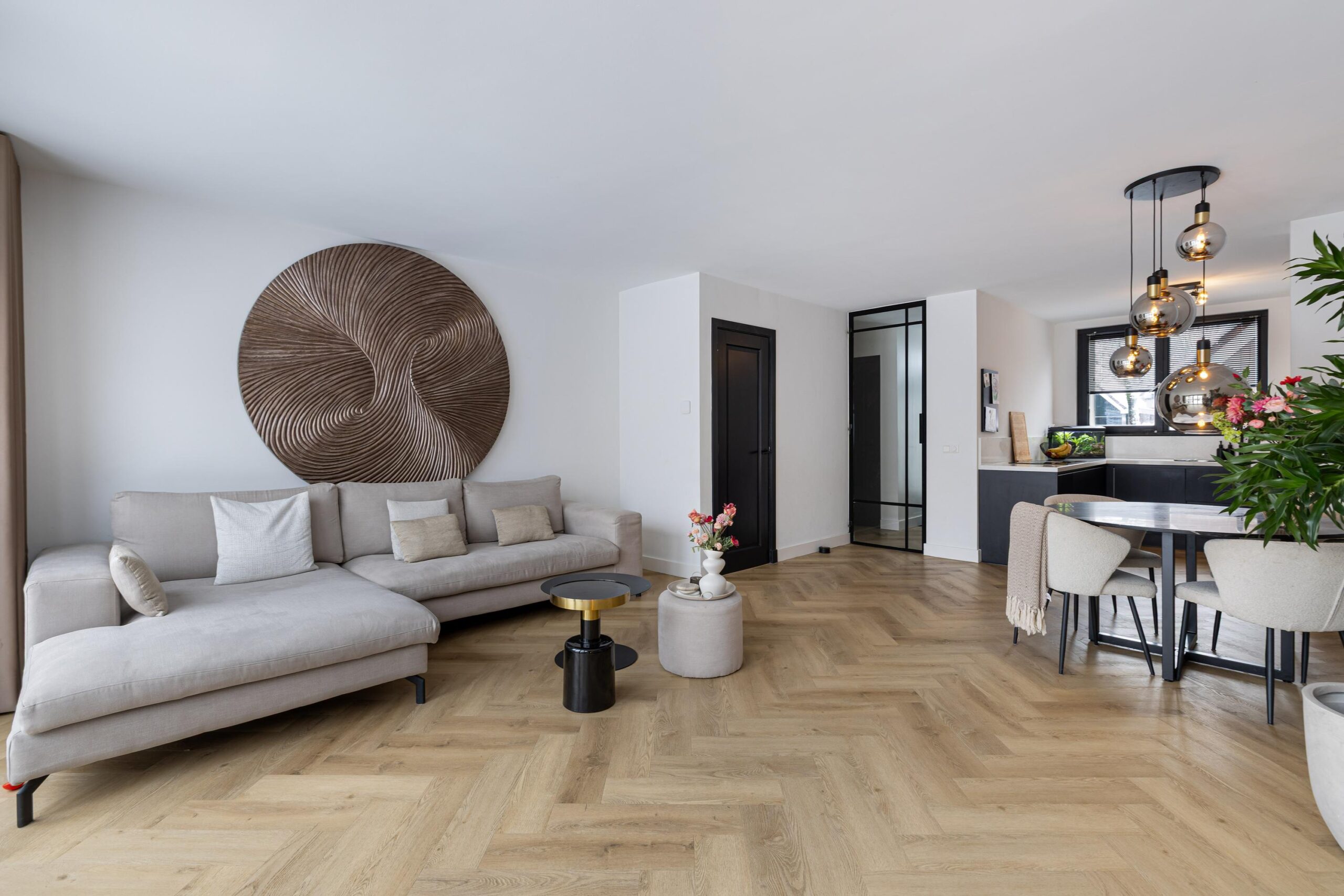 De tuingerichte woonkamer is ruim, licht en sfeervol, met strak gestucte wanden en plafonds en een prachtige visgraat PVC vloer met vloerverwarming. De grote schuifpui zorgt voor een naadloze verbinding met de zonnige achtertuin en laat het daglicht rijkelijk binnenstromen. Een heerlijke plek om te ontspannen en te genieten.
