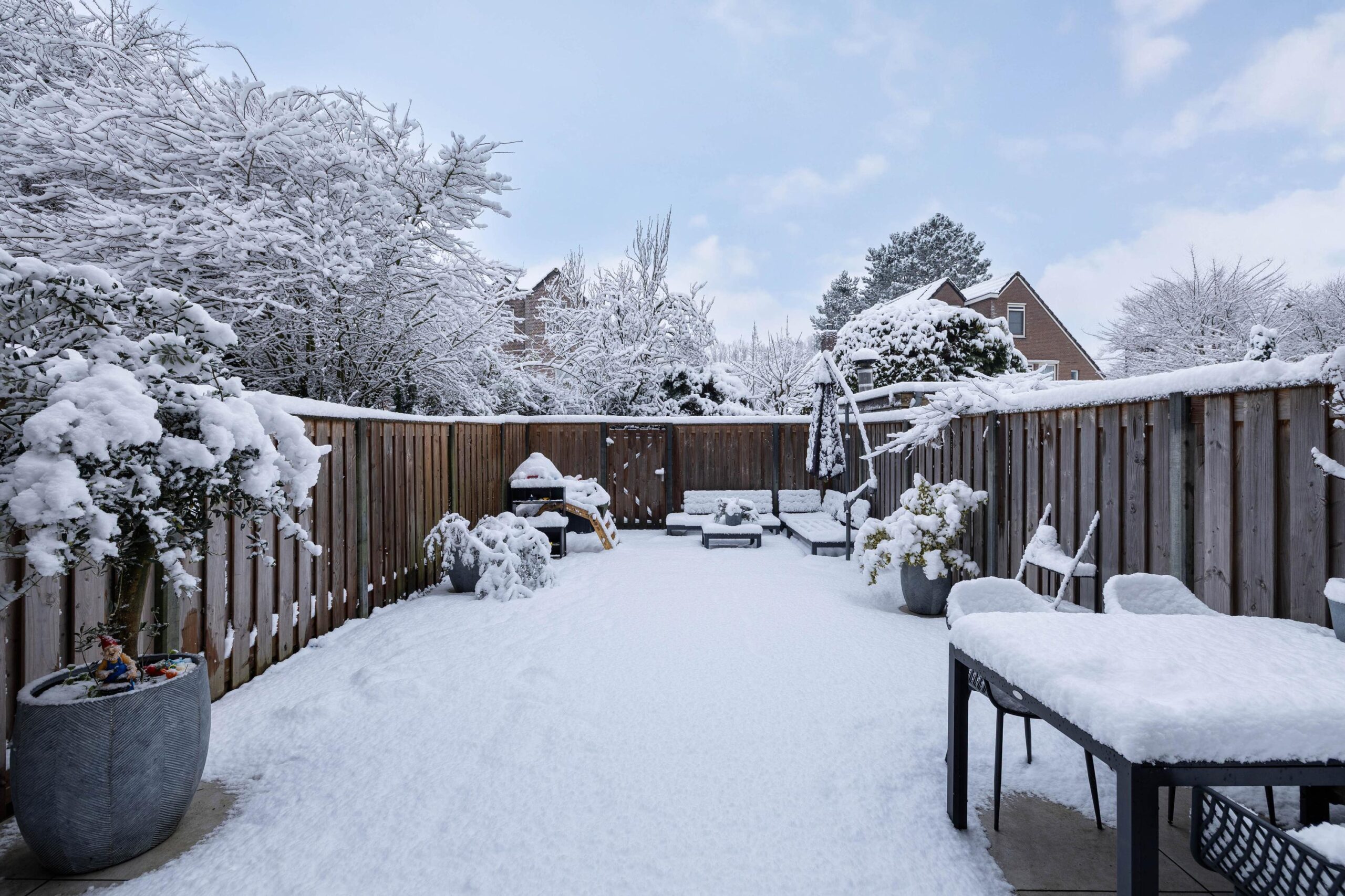 De zonnige en diepe achtertuin op het westen is stijlvol aangelegd en voorzien van grote 90x90 keramische tegels, wat zorgt voor een luxe, moderne uitstraling én onderhoudsgemak. Een heerlijke plek om tot in de avond van de zon te genieten. Dankzij de achterom is de tuin ook praktisch in gebruik. De voortuin beschikt over een ruime stenen berging en een parkeerplaats op eigen terrein.