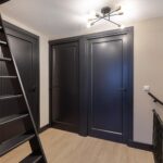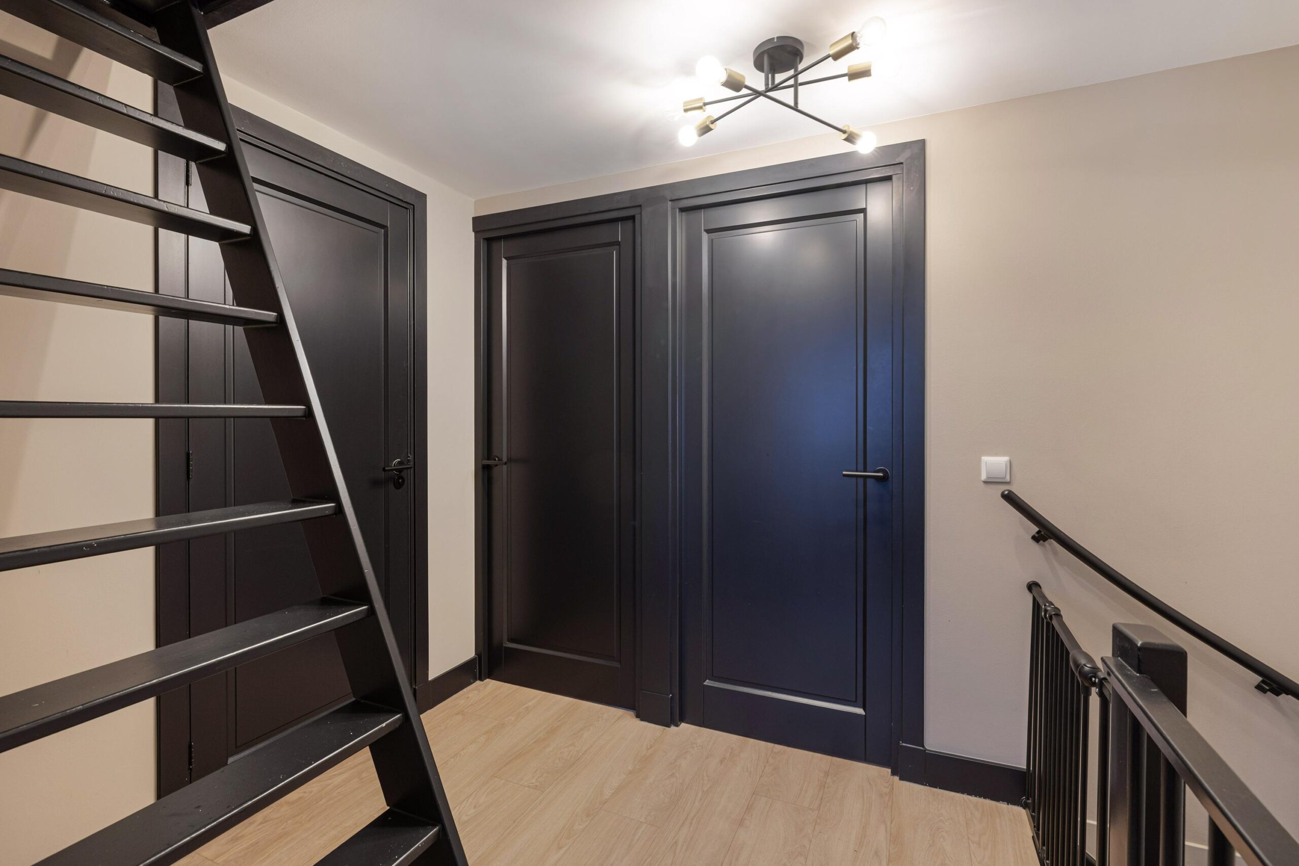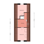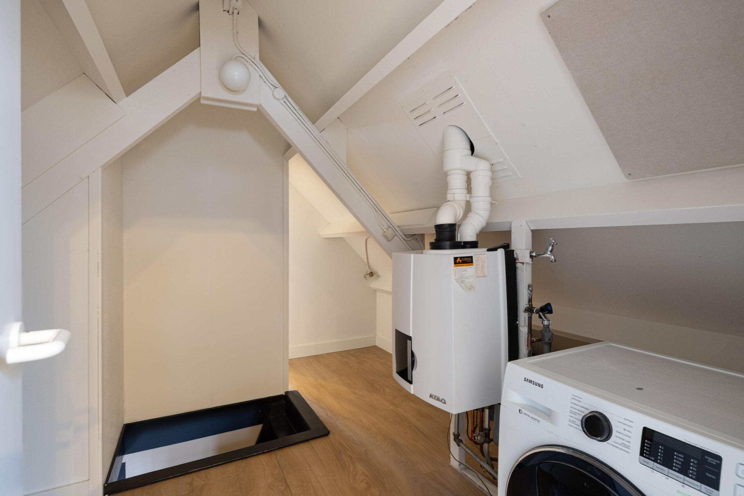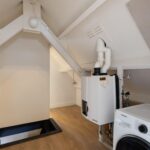 In het midden is de opstelling van de cv-installatie en bevinden zich de aansluitingen voor wasmachine en droger. Ook deze verdieping is afgewerkt met dezelfde hoogwaardige PVC vloer als op de eerste verdieping, wat zorgt voor een rustige en luxe uitstraling door de hele woning.