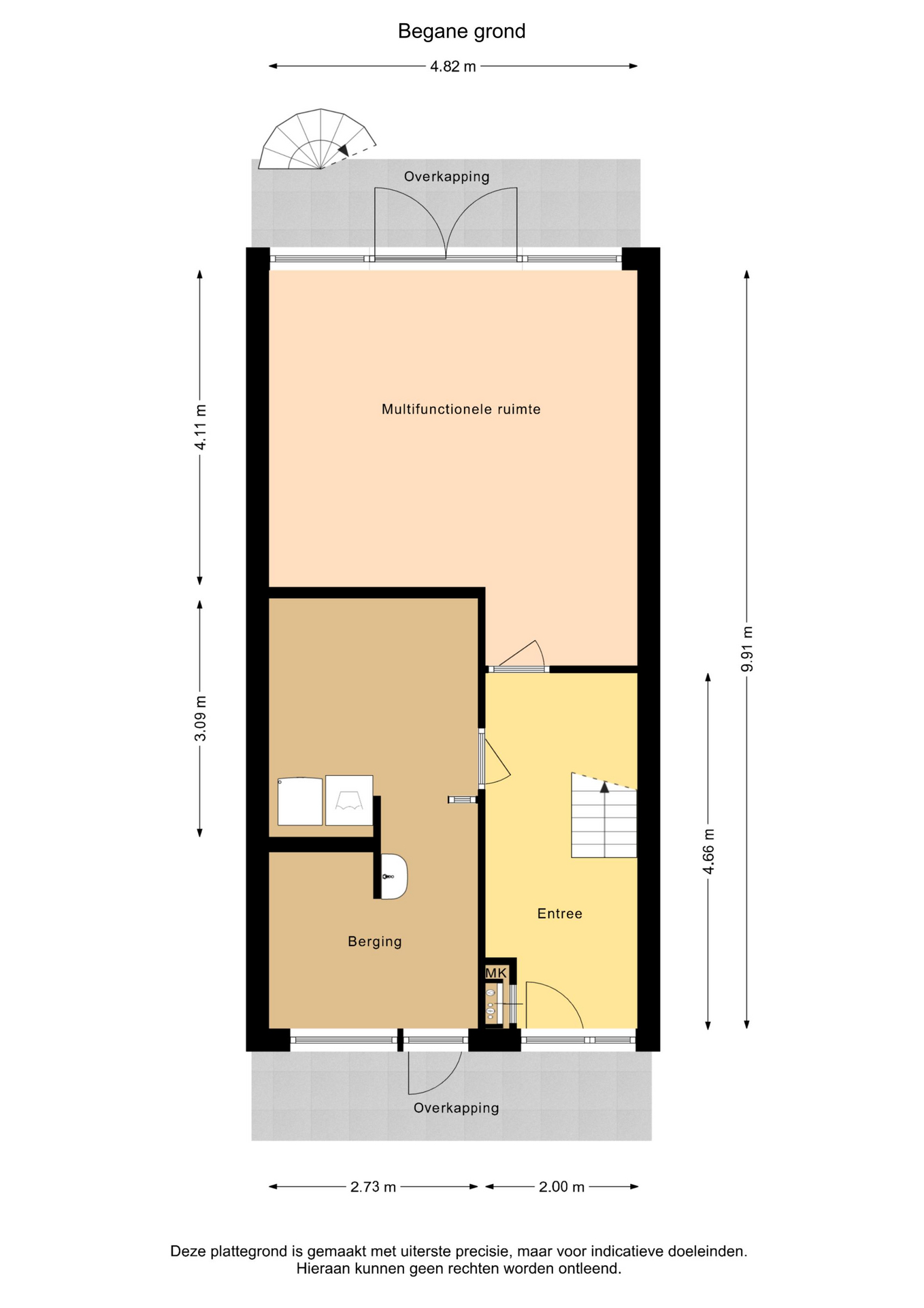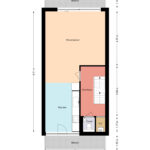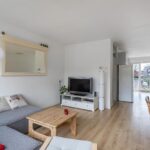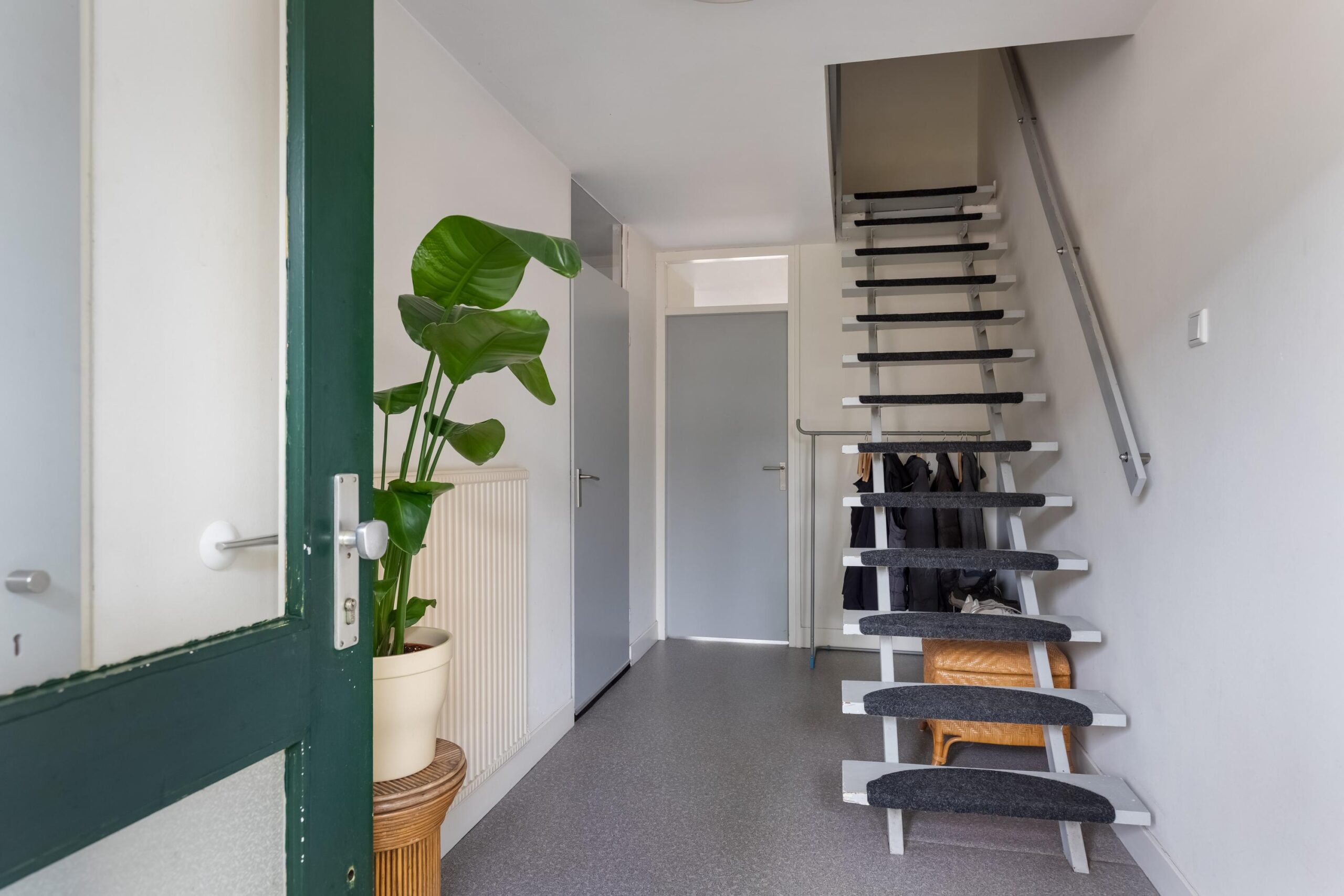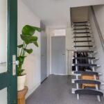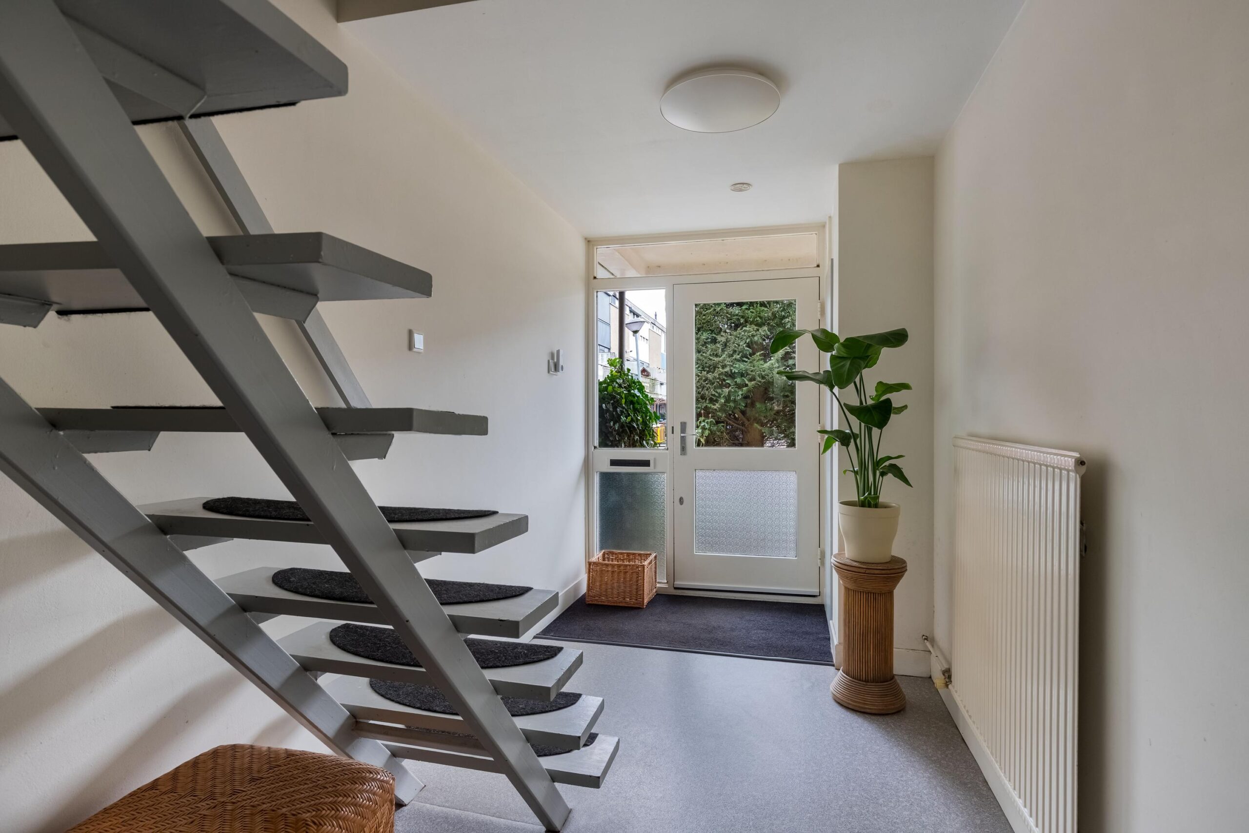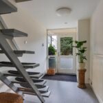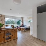 Entree, hal, garderobe, meterkast, deur naar de bijkeuken/berging, woning brede en lichte tuinkamer met openslaande deuren naar de achtertuin met een overkapping van het balkon.
