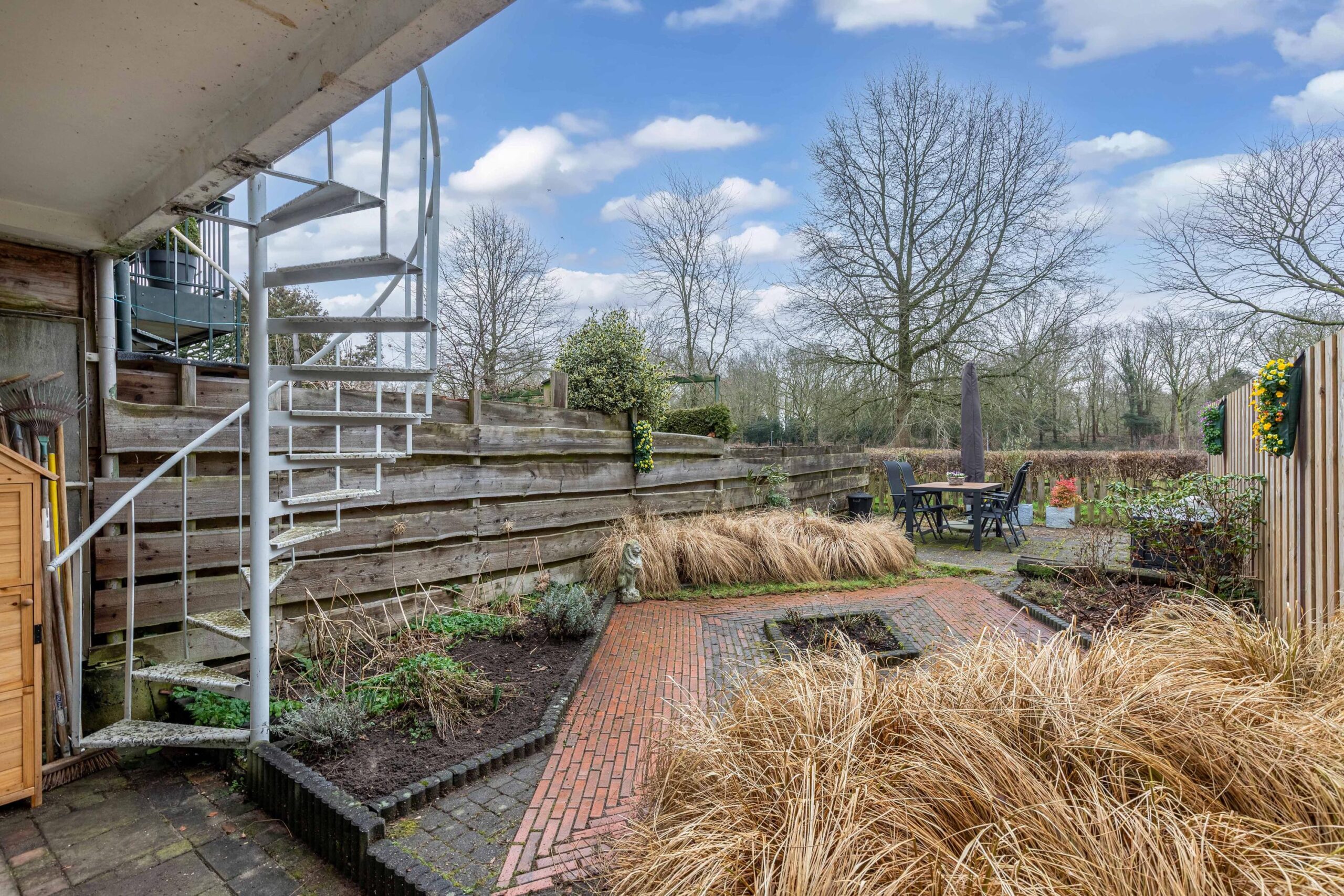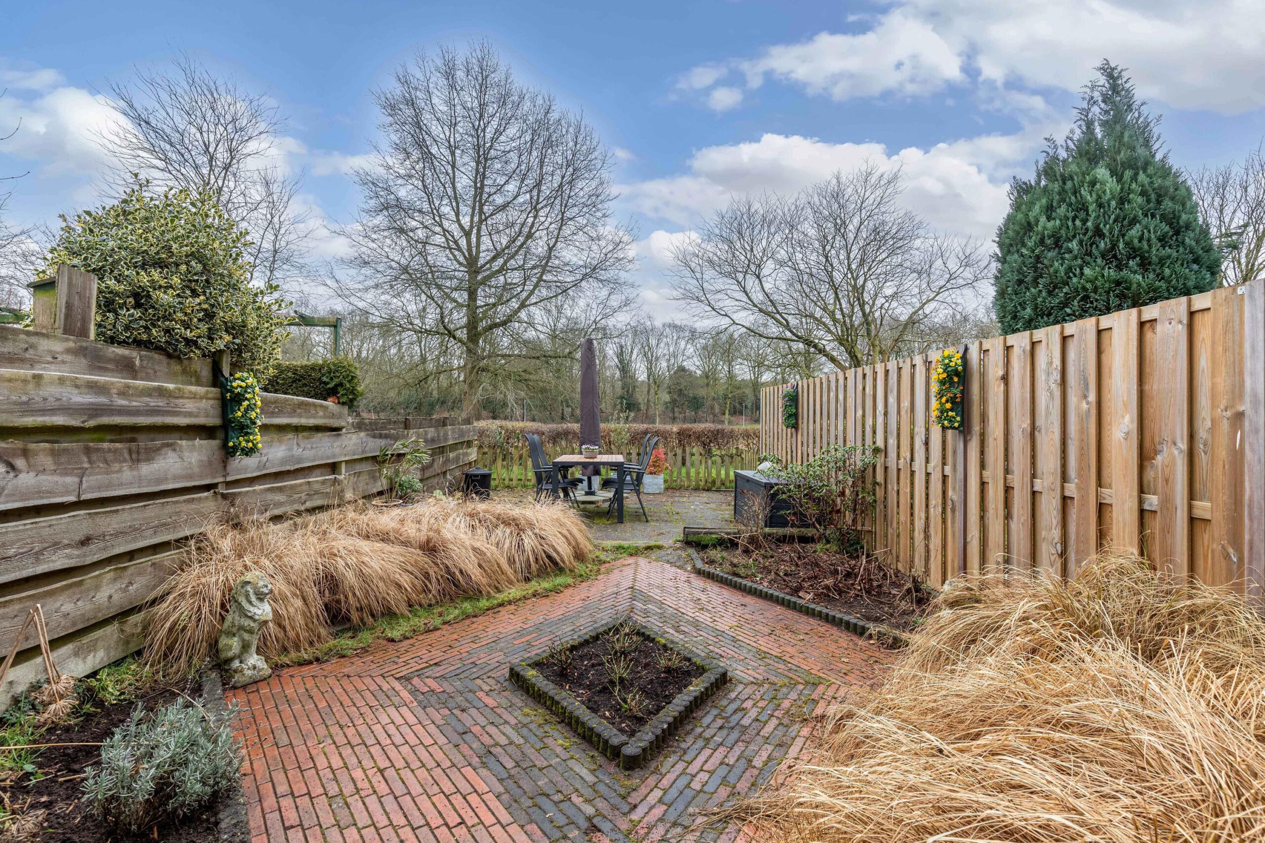 Voortuin (oprit) en ruime fantastische achtertuin met loop naar park.