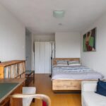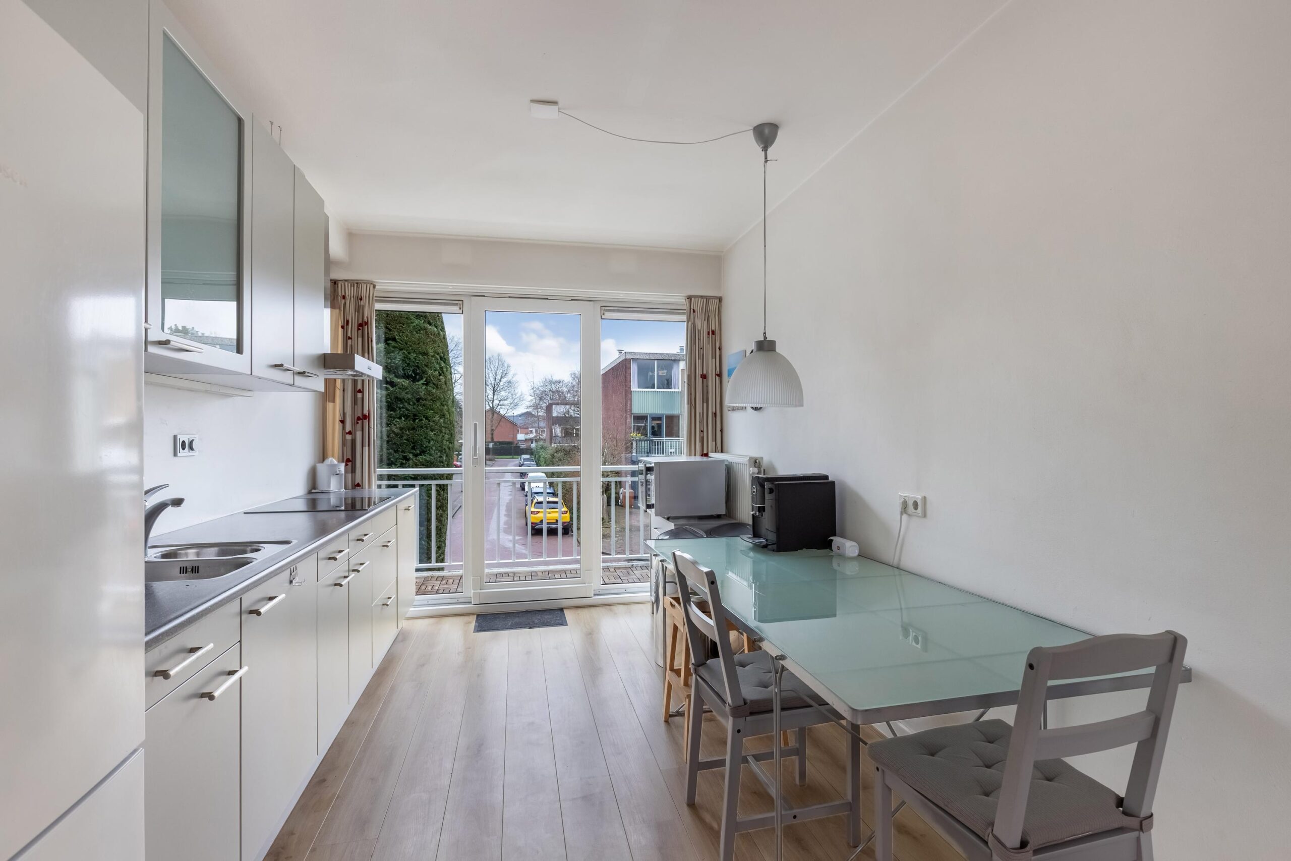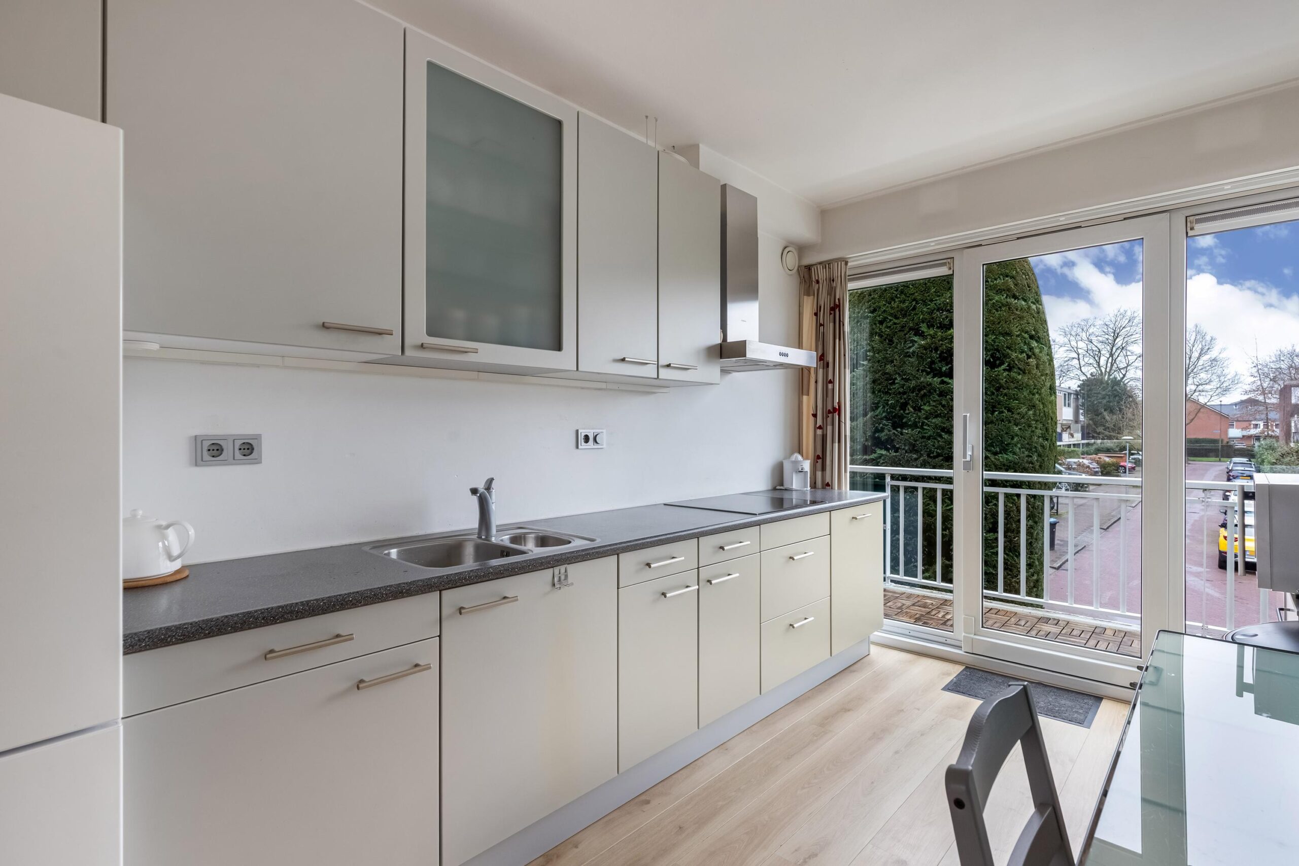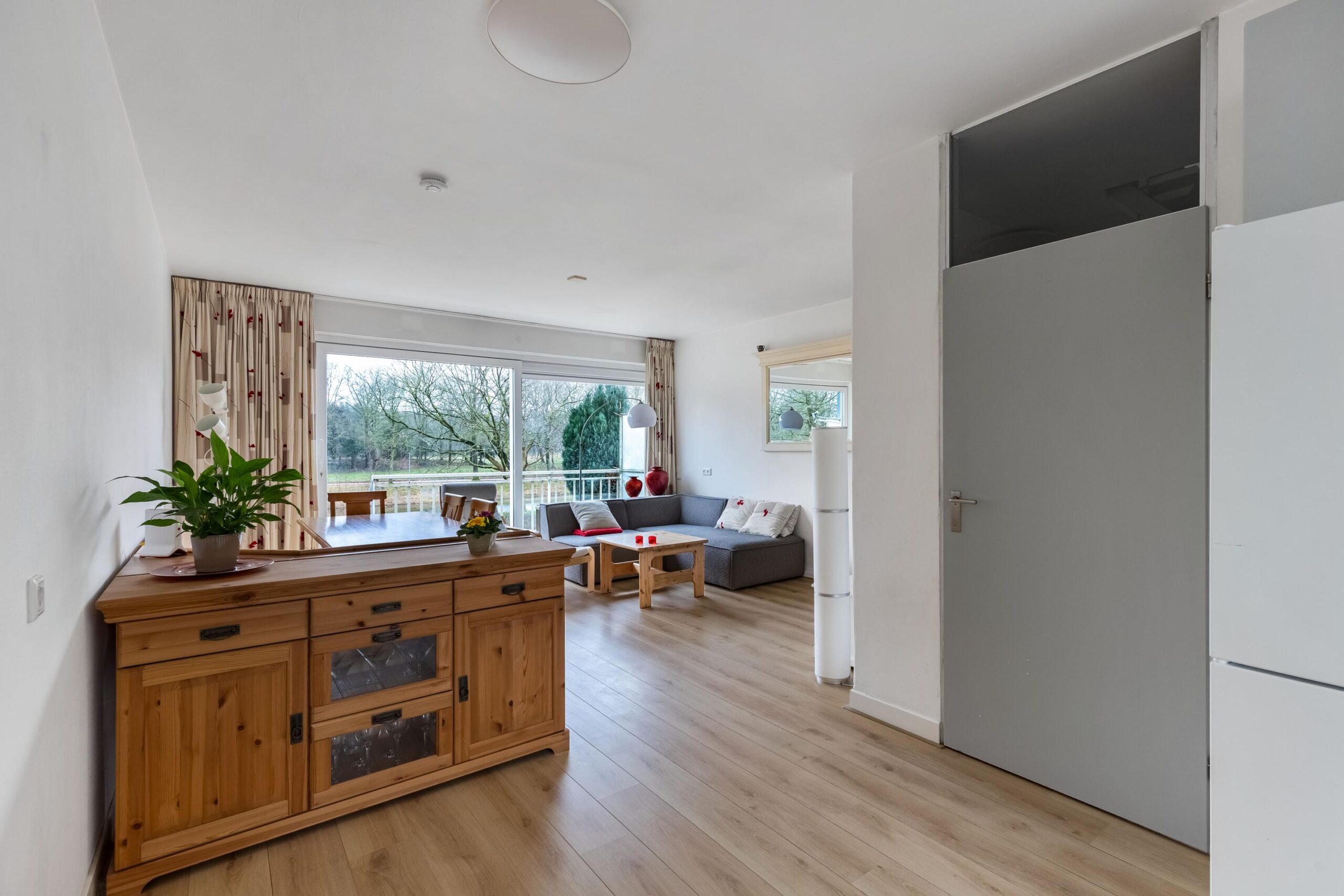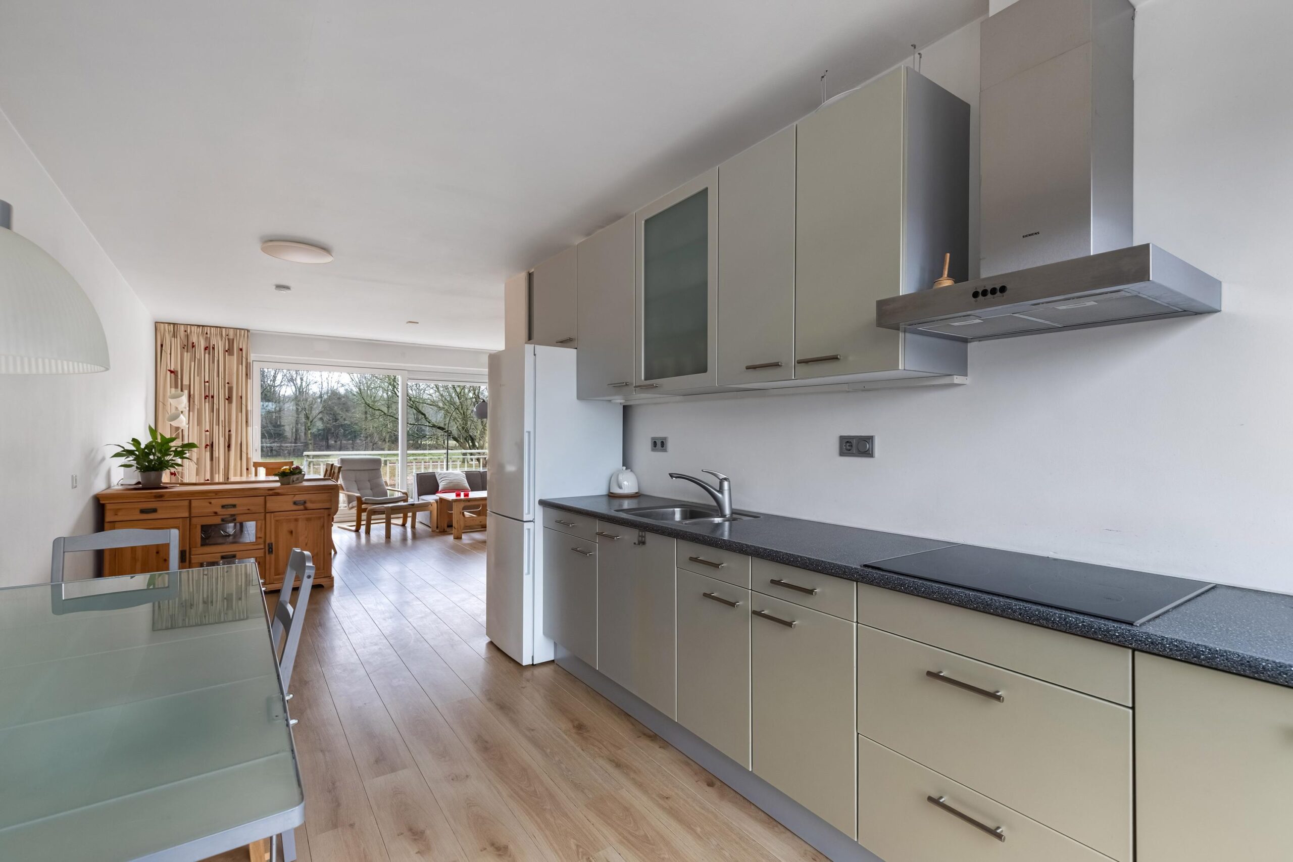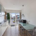 Overloop, toilet met fonteintje en CV kast met onderhouden Hr ketel uit 2022, lichte woonkamer met een schuifpui naar het balkon met geweldig uitzicht op het groene stadspark, open keuken voorzien van diverse (inbouw)apparatuur als een inductie kookplaat, afzuigkap, vaatwasser en toegang naar het balkon aan de voorzijde.