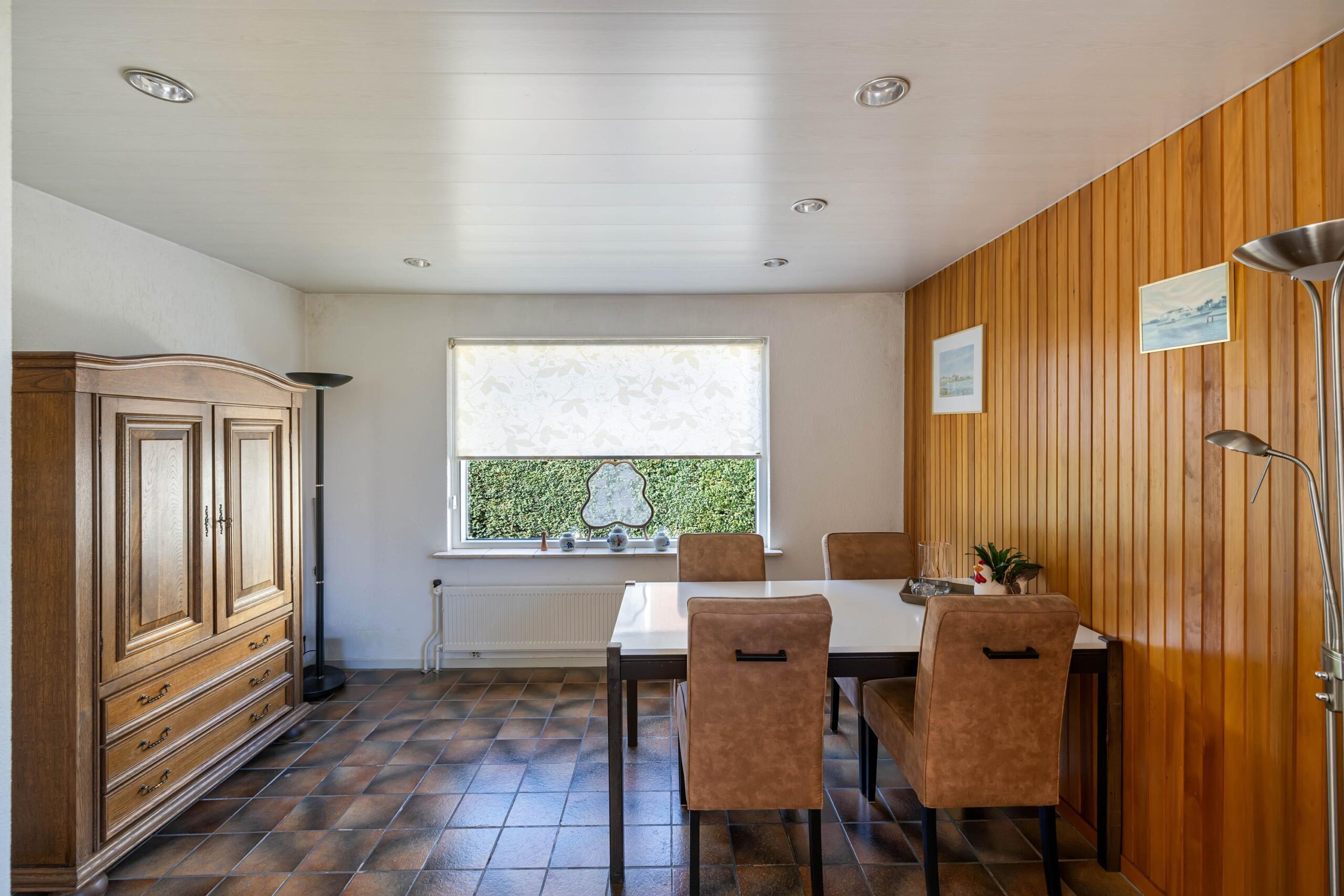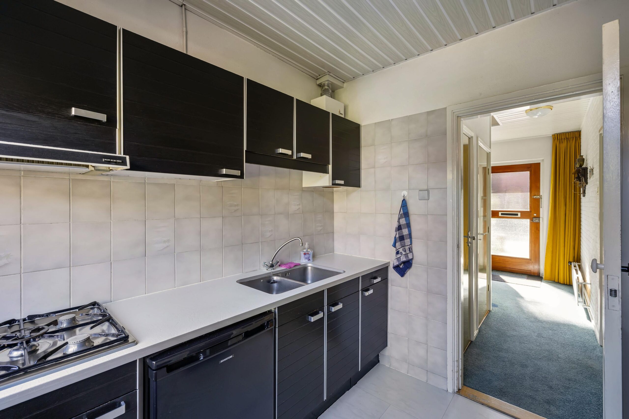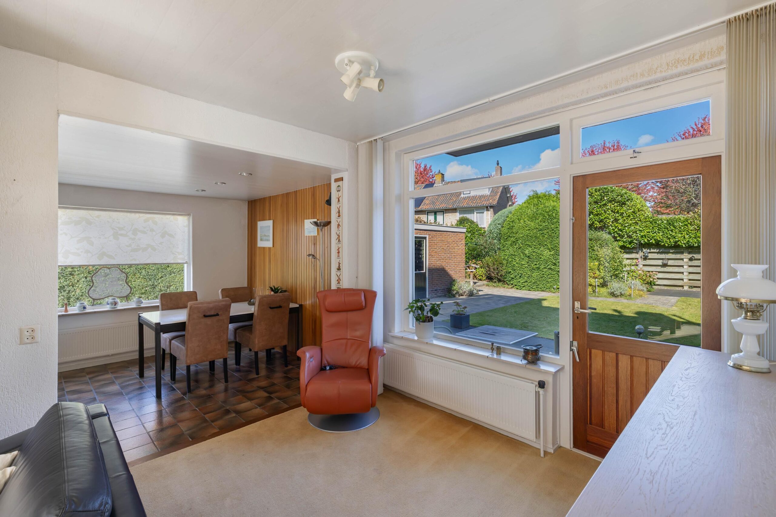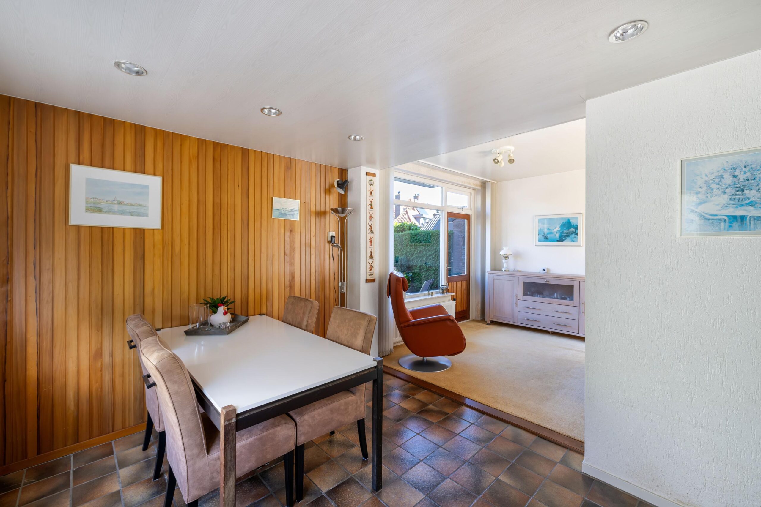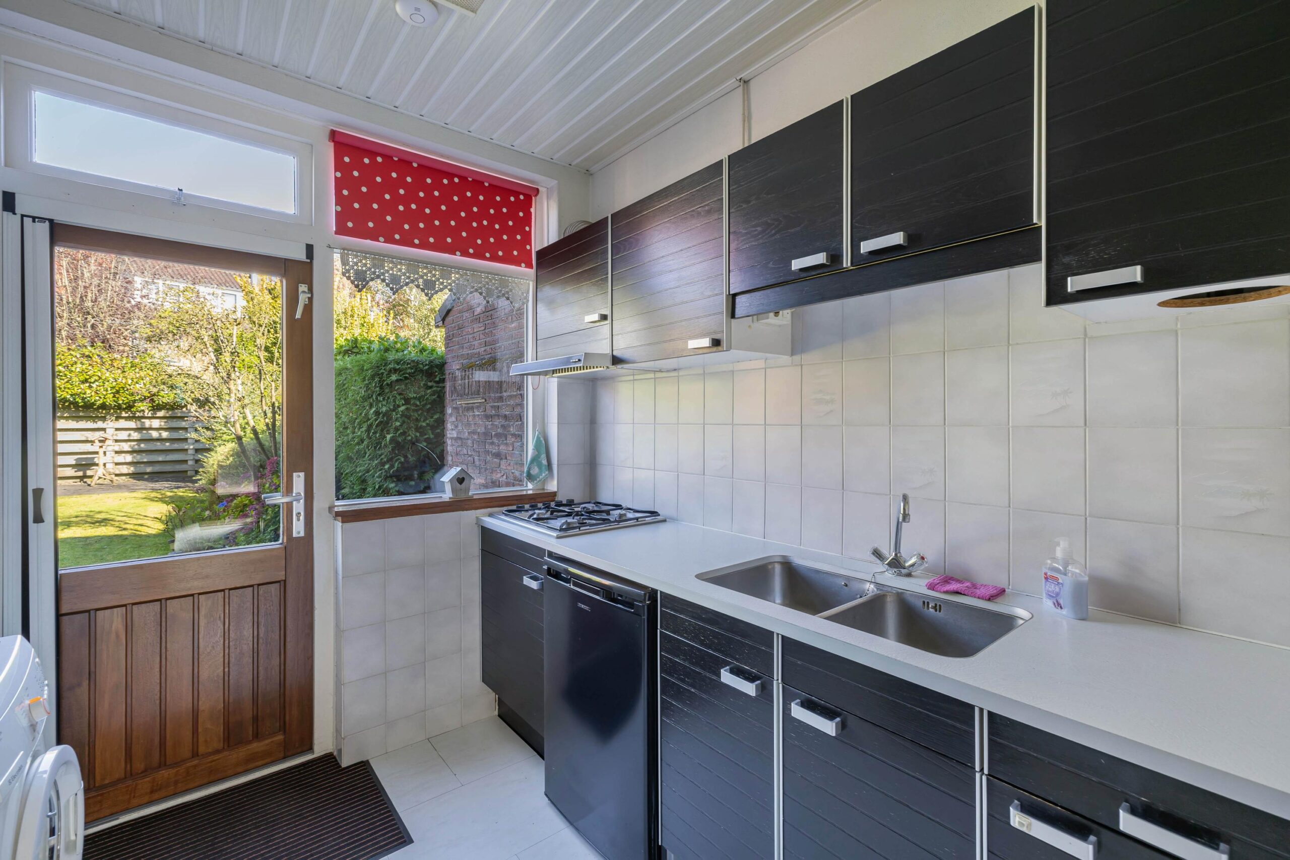 Entree, hal, meterkast, trapopgang naar 1e verdieping, toilet met fonteintje, toegang tot stahoge kelder middels een vaste trap, woonkamer met grote raampartij, open haard en deur naar de achtertuin. Aangrenzend is er een aparte eetkamer. De keuken is praktisch met een doorloop naar de achtertuin en voorzien van opstelling wasmachine/droger en diverse inbouwapparatuur.