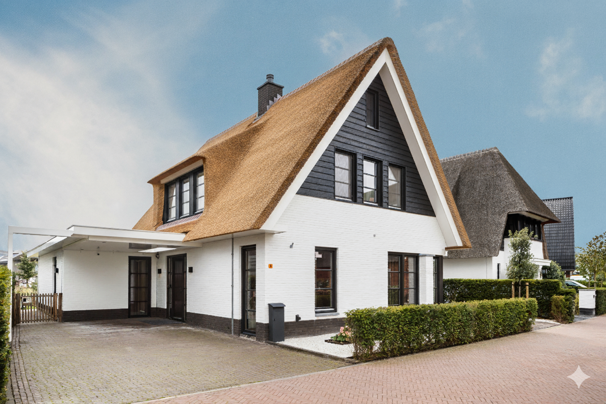 De afbeeldingen van de villa met een rietenkap dienen als impressie om een beeld te geven van de mogelijkheden en uitstraling. Verkopers hebben een offerte ontvangen voor het vervangen van het pannendak naar een rietenkap, de kosten hiervoor bedragen ca. € 60.000,- incl. btw.