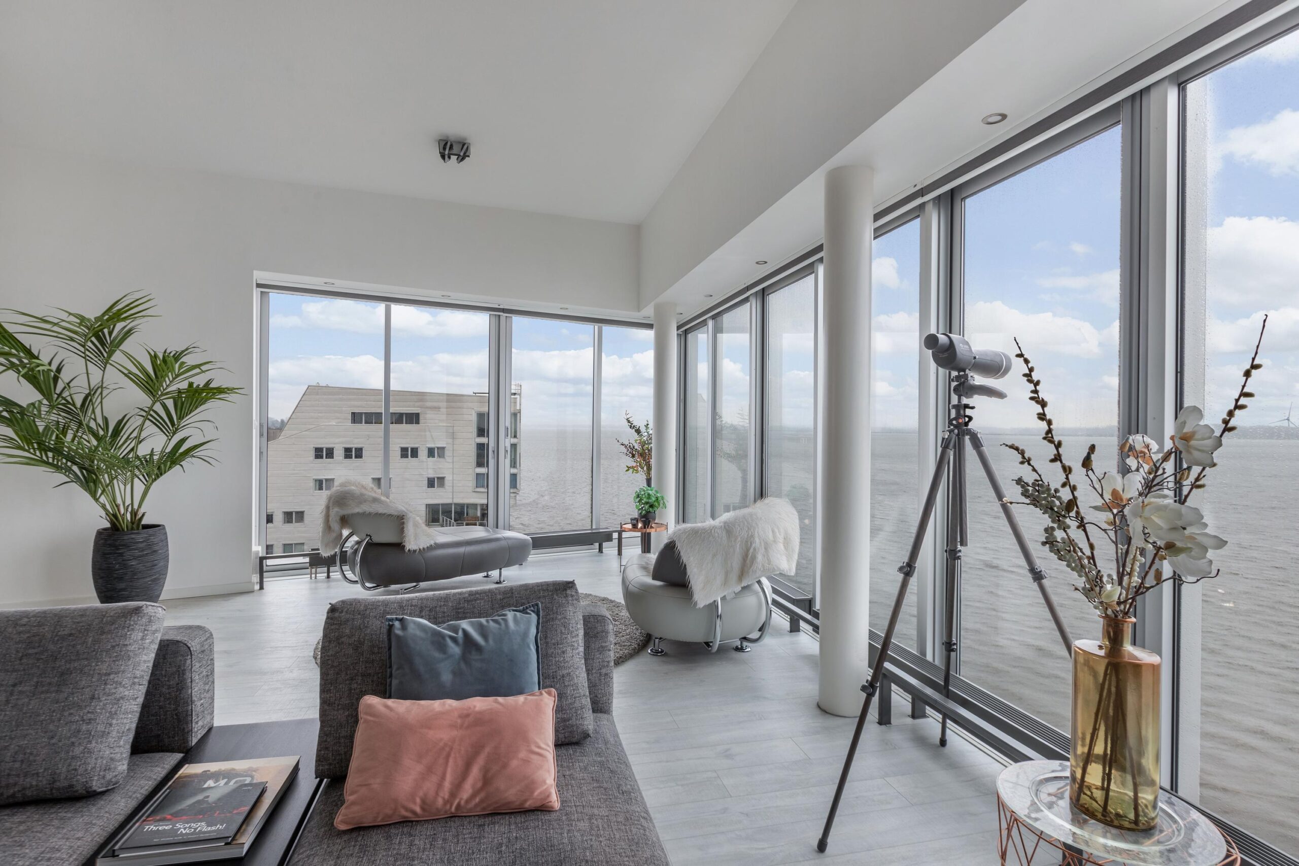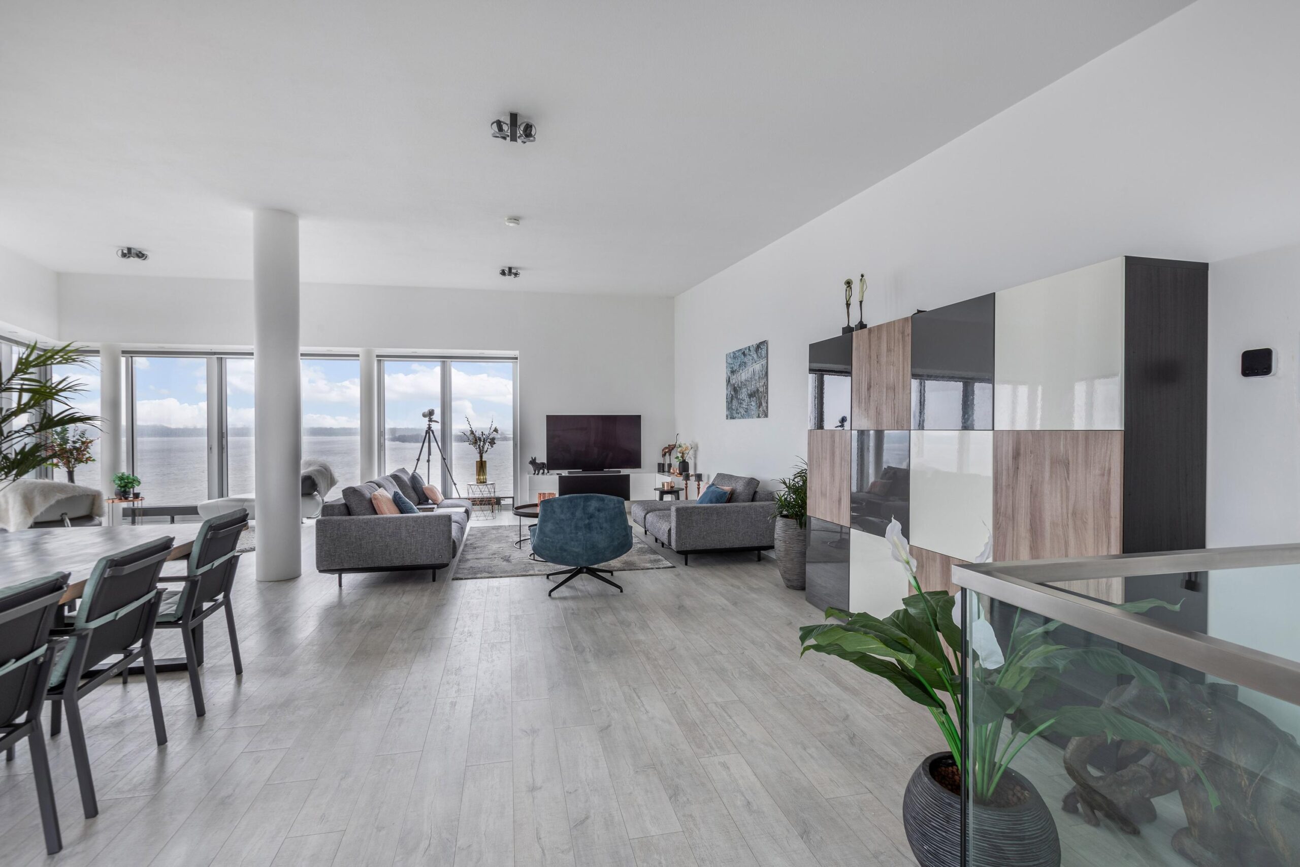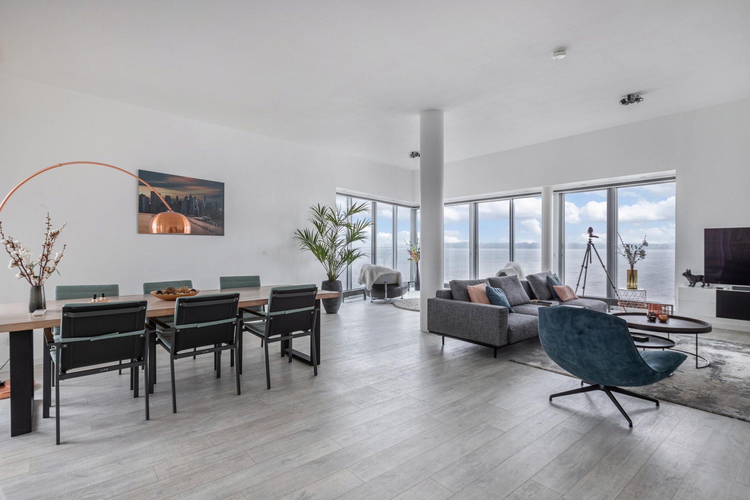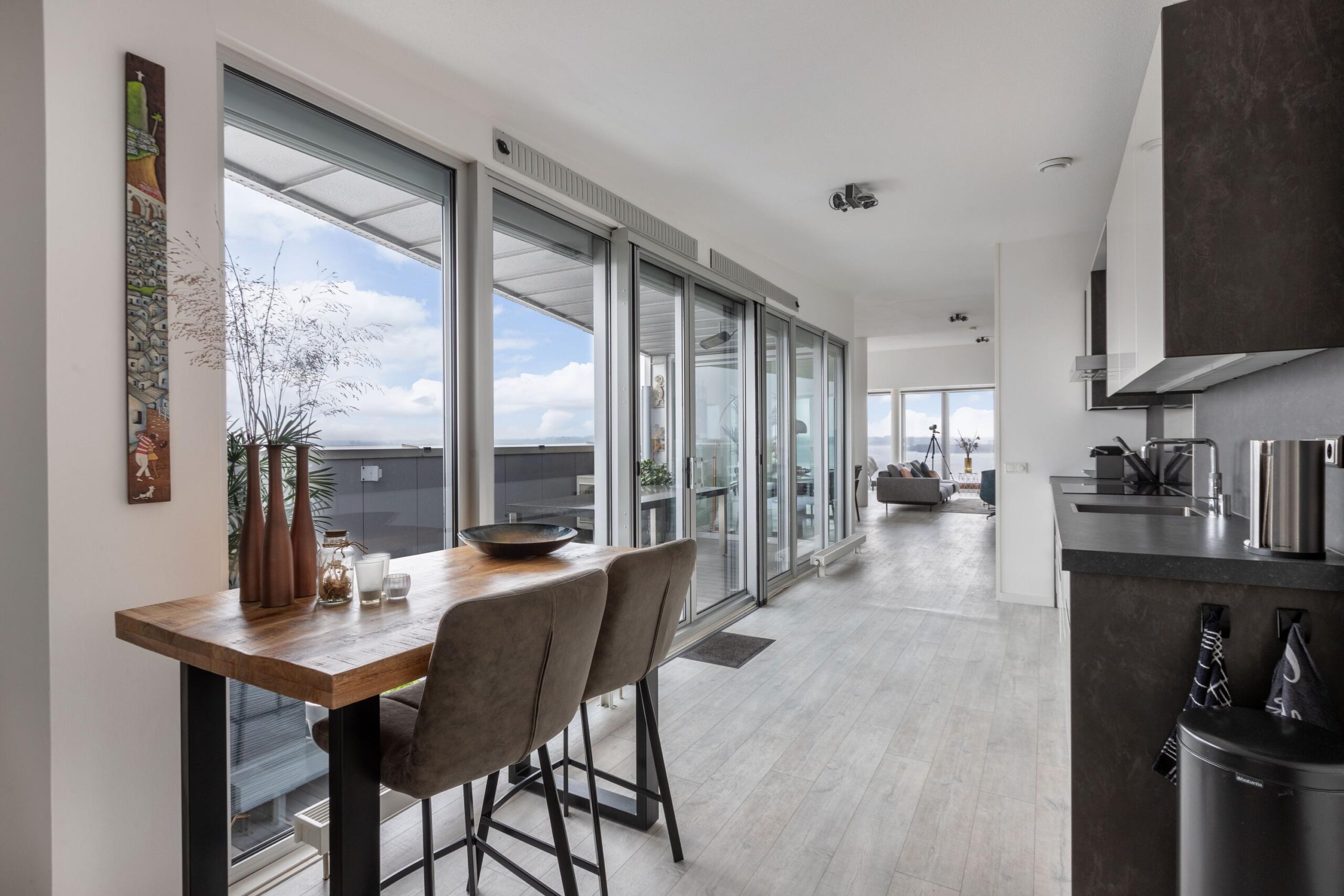 Via een vaste trap naar de riante leefruimte met werkelijk vanuit iedere hoek een schitterend panoramisch uitzicht. De leefruimte is sfeervol ingedeeld met een ruime dubbele zithoek, een eethoek en aangrenzend een luxe en complete keuken. De keuken is stijlvol en modern, uitgerust met divers luxe apparatuur zoals een combi-oven, vaatwasmachine, inductie kookplaat, afzuigkap, koelkast en een Quooker, berging/bijkeuken, toilet. Toegang via schuifpui tot het heerlijke ruime dakterras met een vorstvrije buitenkraan en verschillende contactdozen. Het appartement is volledig geïsoleerd (energielabel A) en voorzien van vaste muurafwerking.