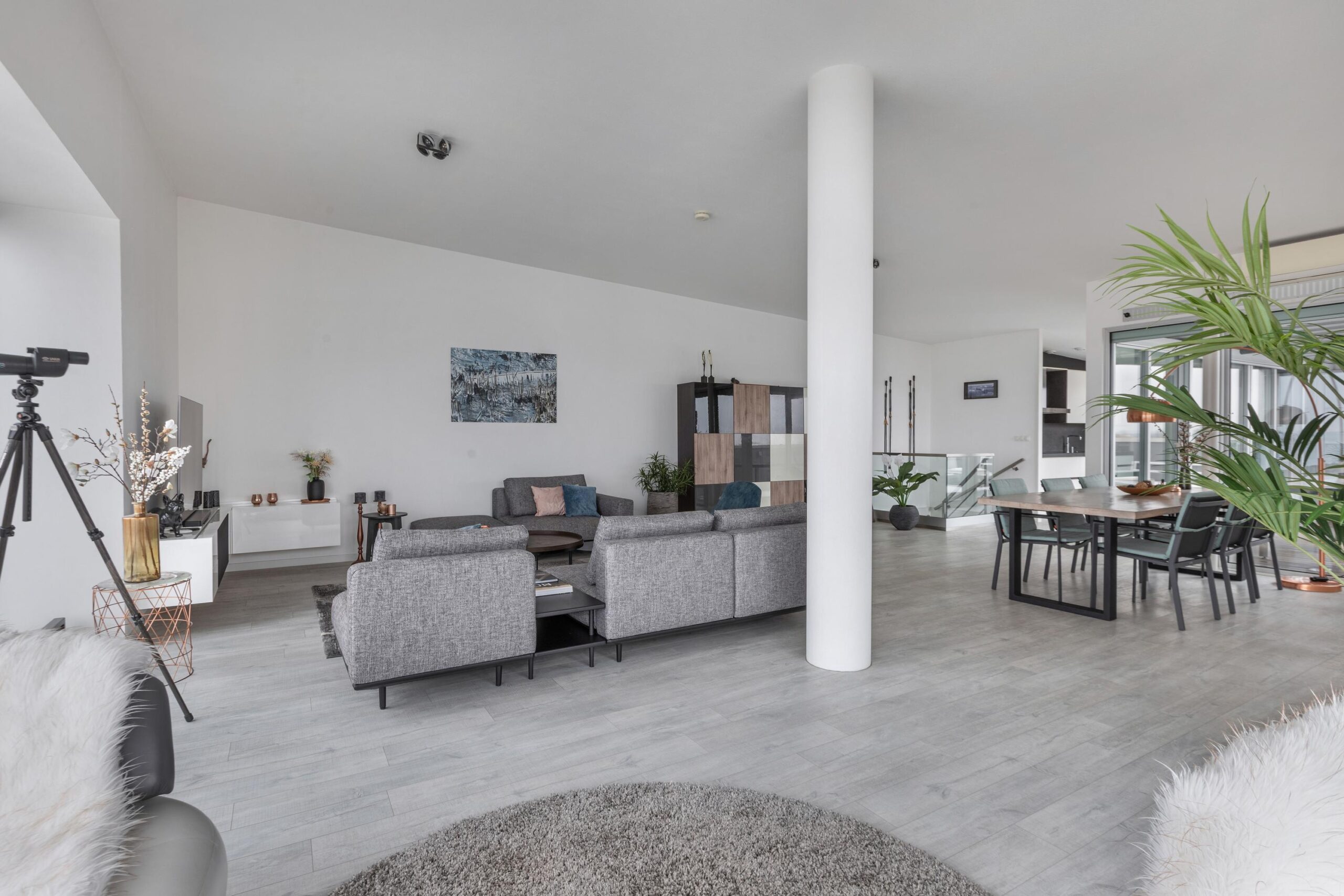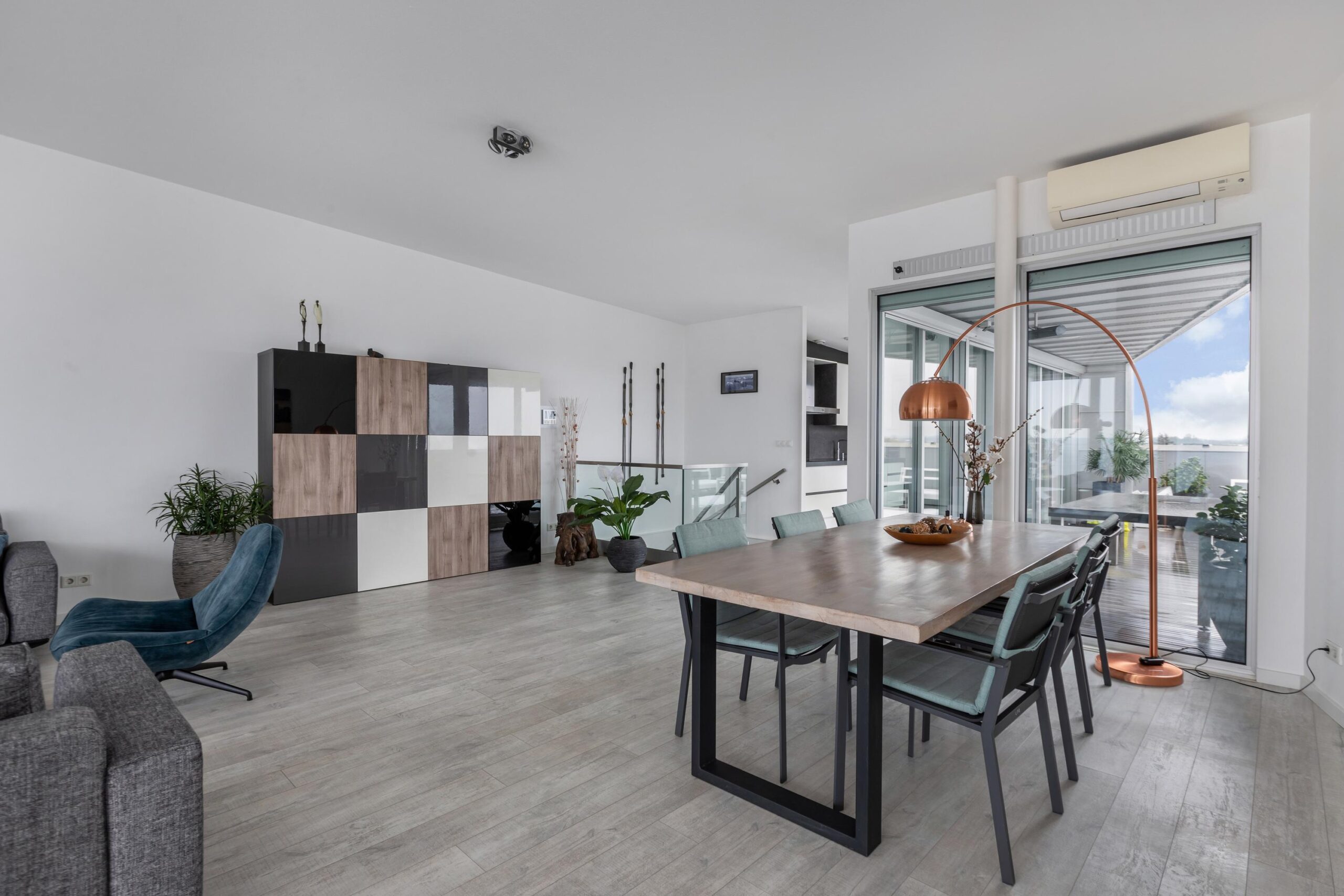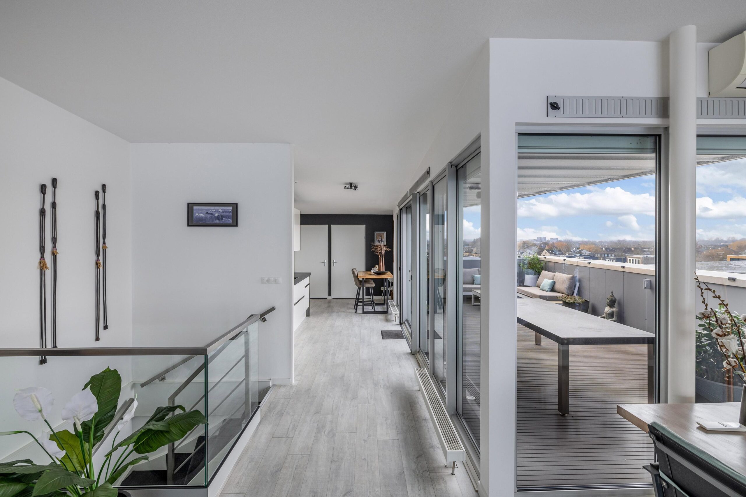 Via een vaste trap naar de riante leefruimte met werkelijk vanuit iedere hoek een schitterend panoramisch uitzicht. De leefruimte is sfeervol ingedeeld met een ruime dubbele zithoek, een eethoek en aangrenzend een luxe en complete keuken. De keuken is stijlvol en modern, uitgerust met divers luxe apparatuur zoals een combi-oven, vaatwasmachine, inductie kookplaat, afzuigkap, koelkast en een Quooker, berging/bijkeuken, toilet. Toegang via schuifpui tot het heerlijke ruime dakterras met een vorstvrije buitenkraan en verschillende contactdozen. Het appartement is volledig geïsoleerd (energielabel A) en voorzien van vaste muurafwerking.