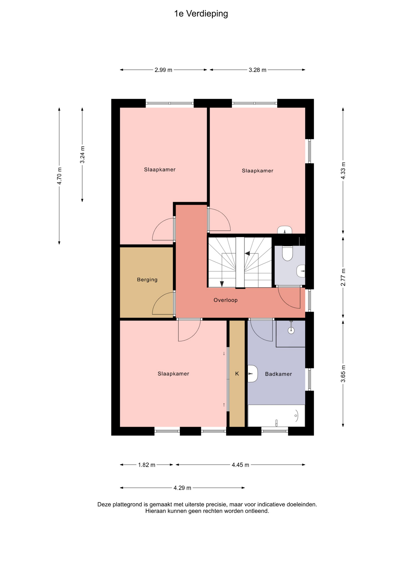 Op de eerste verdieping bevinden zich drie goed bemeten slaapkamers, een badkamer met ligbad, douche en wastafelmeubel, een separaat toilet en een grote berging. De grootste slaapkamer beschikt over een ruime inbouwkast, ideaal voor extra opbergruimte.