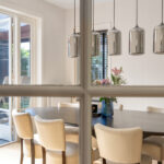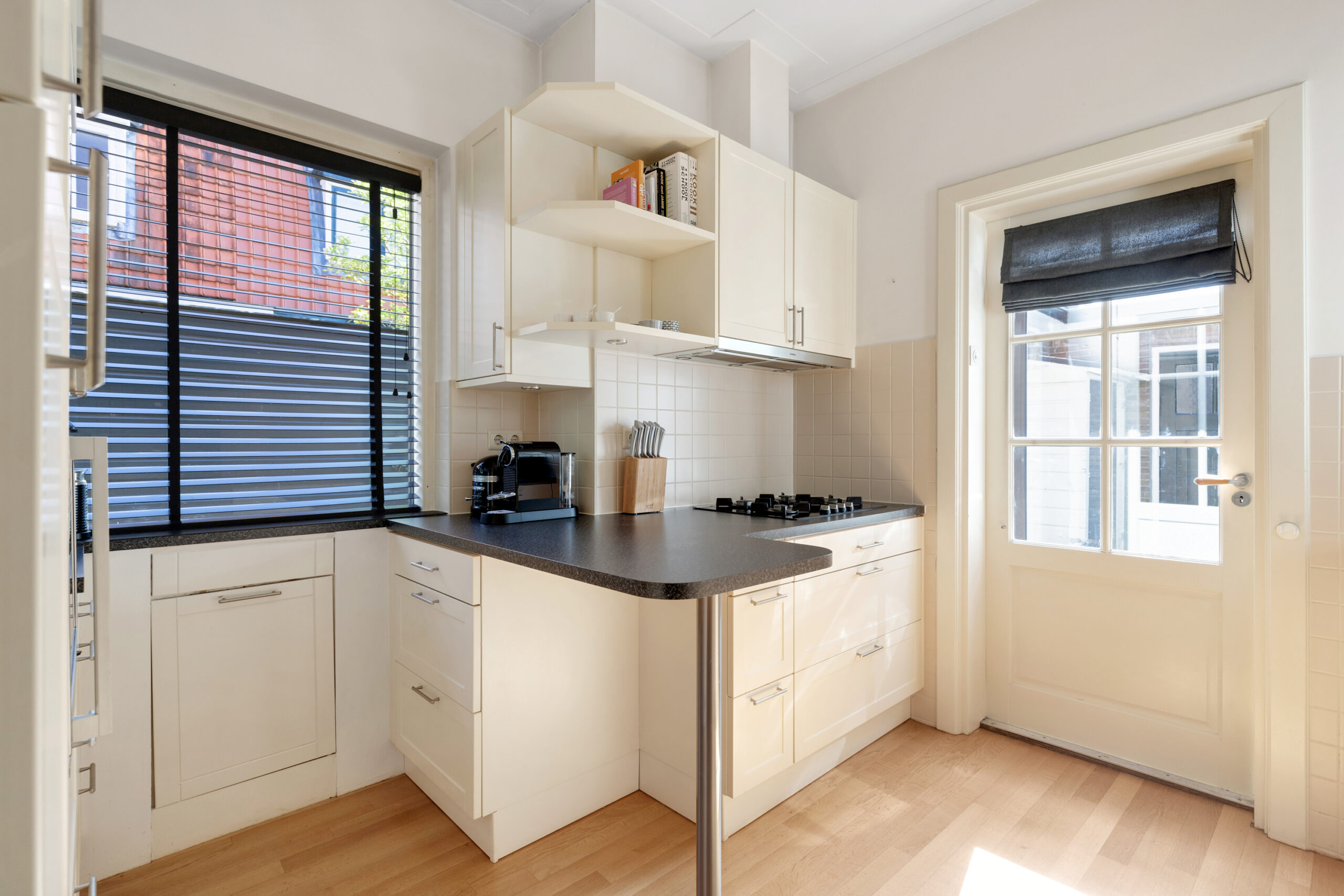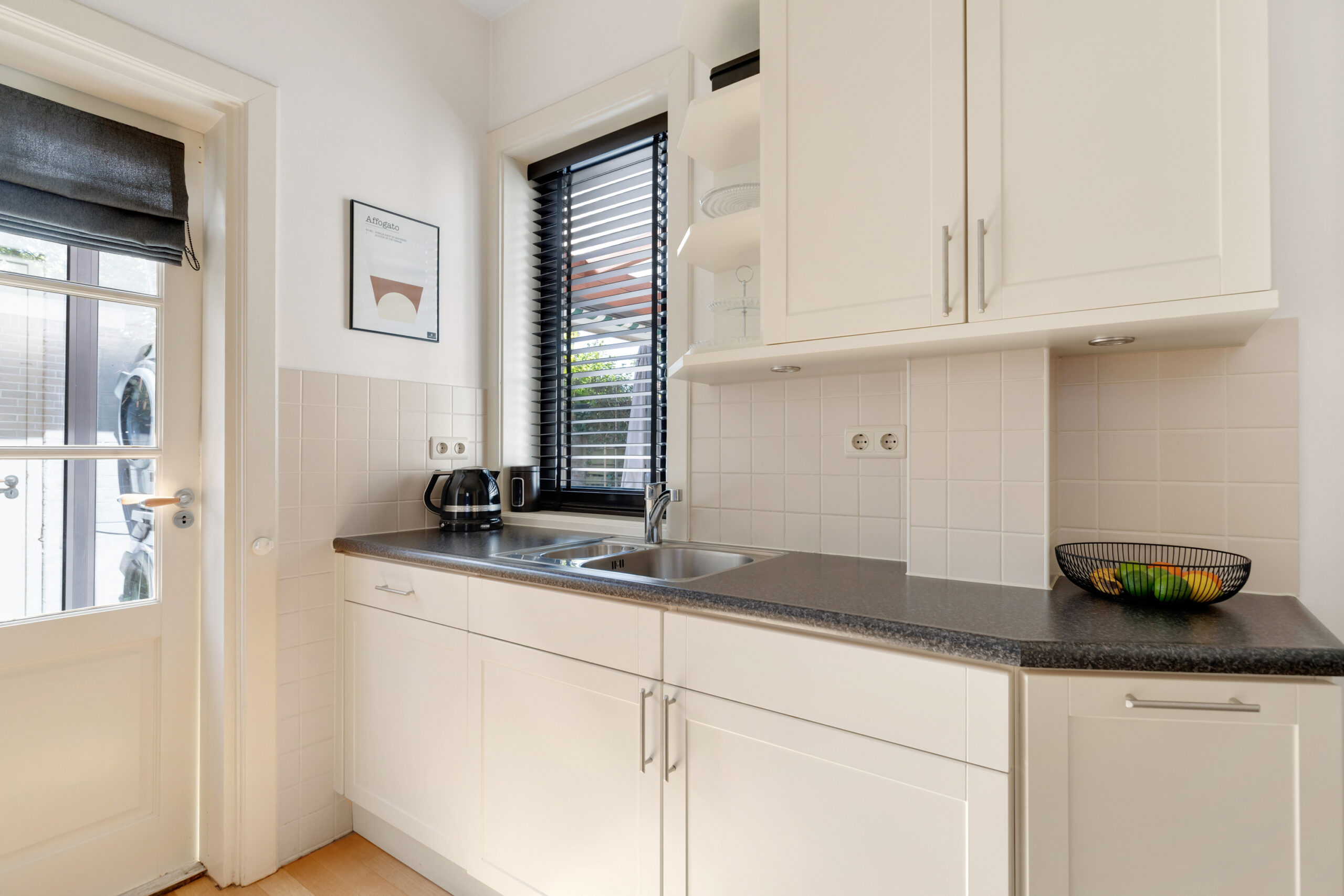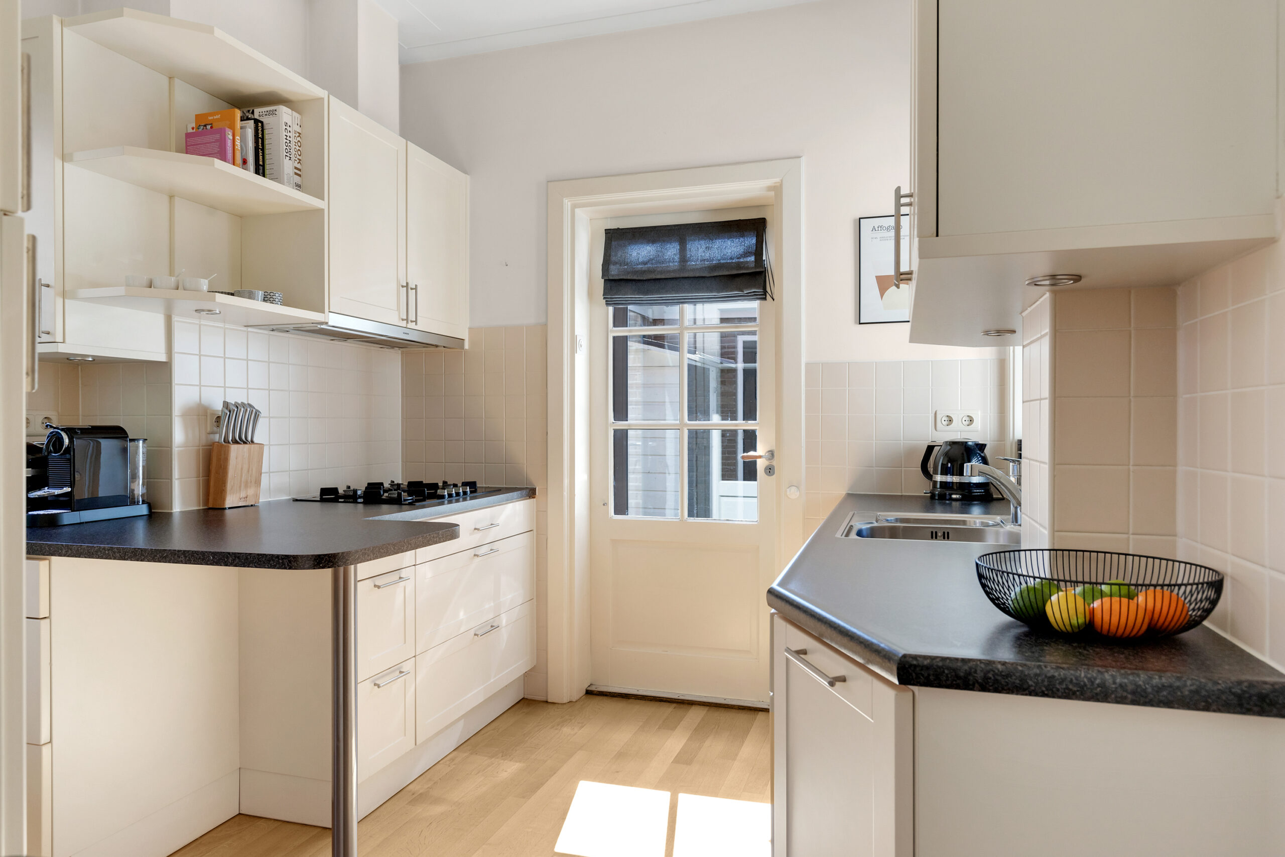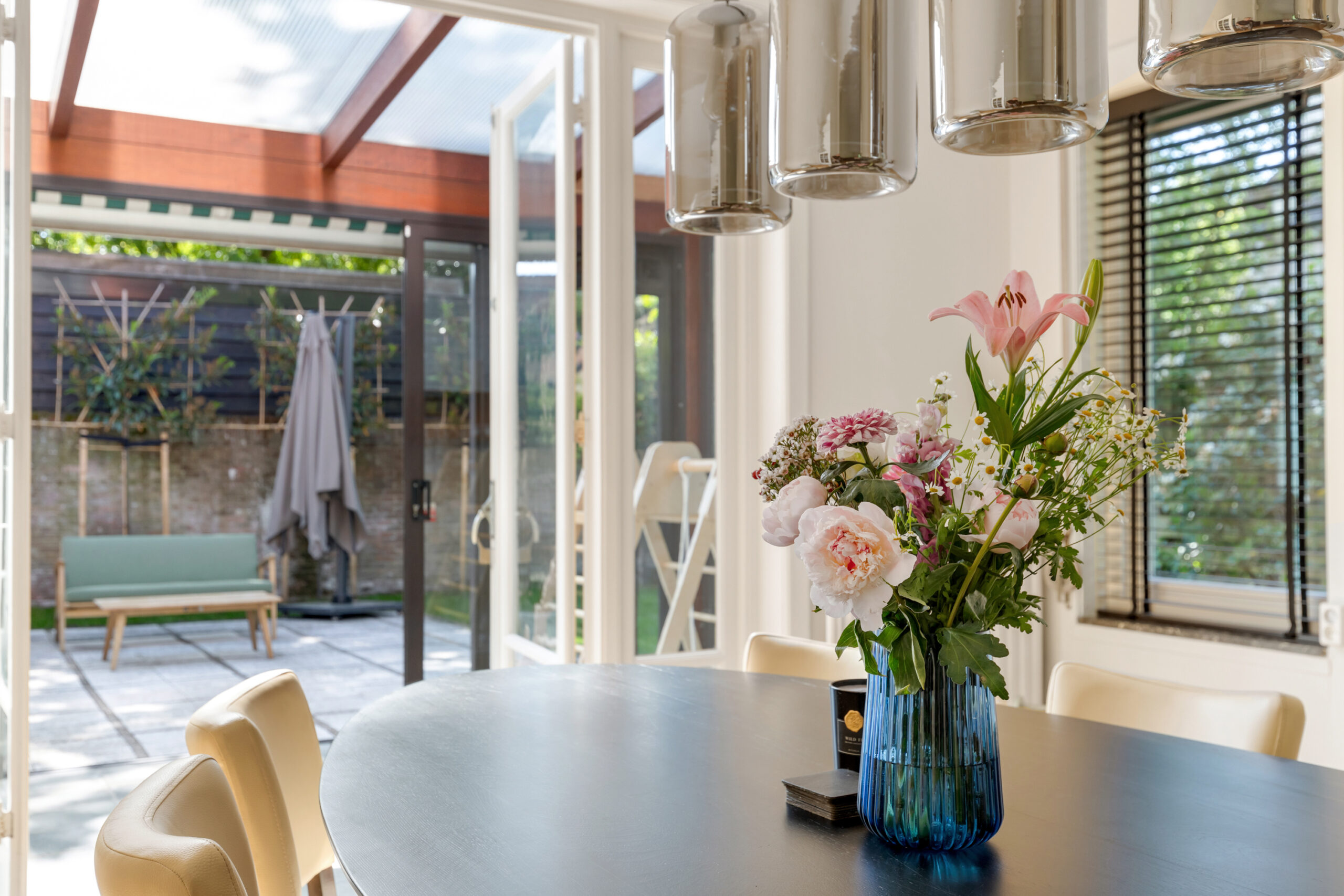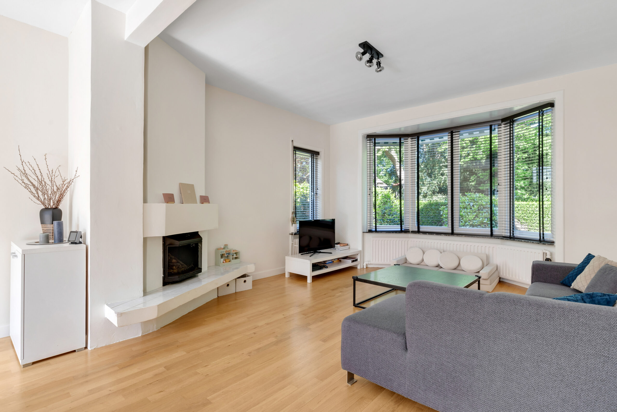 Entree met ruime hal, modern toilet en een werkkamer aan de voorzijde. De lichte woon-/eetkamer beschikt over hoge plafonds, een erker met een prachtig groen uitzicht en een sfeervolle open haard. Aan de achterzijde is een serre aanwezig. De gesloten keuken is voorzien van diverse inbouwapparatuur.