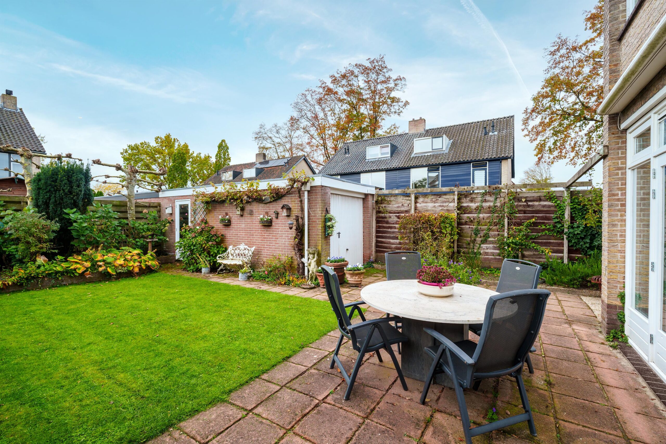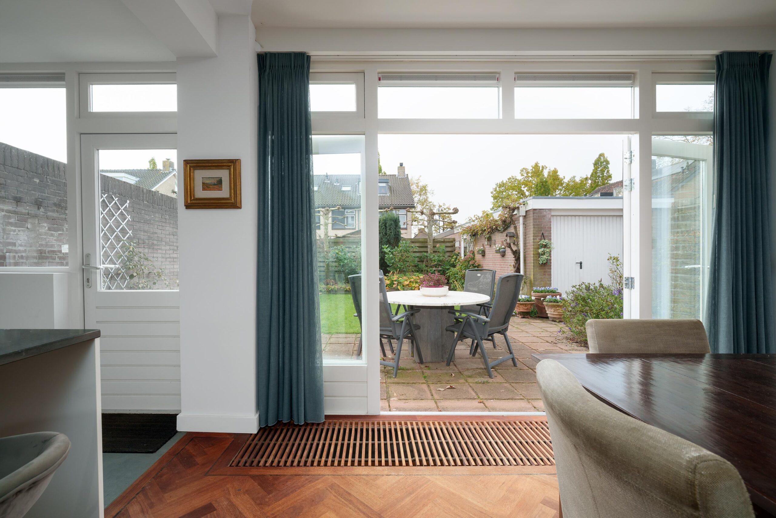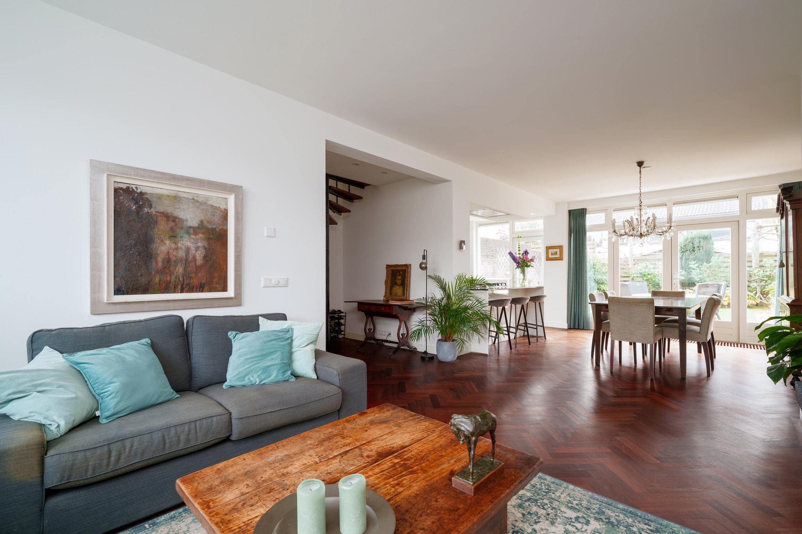 Overdekte entree, hal met vernieuwde meterkast, garderobe en toilet. De royale woon-/eetkamer beschikt over een sfeervolle open haard, grote raampartijen en dubbele openslaande deuren naar de achtertuin en een fraaie houten parketvloer. De moderne open woonkeuken met eiland is voorzien van diverse inbouwapparatuur en biedt eveneens toegang tot de tuin.