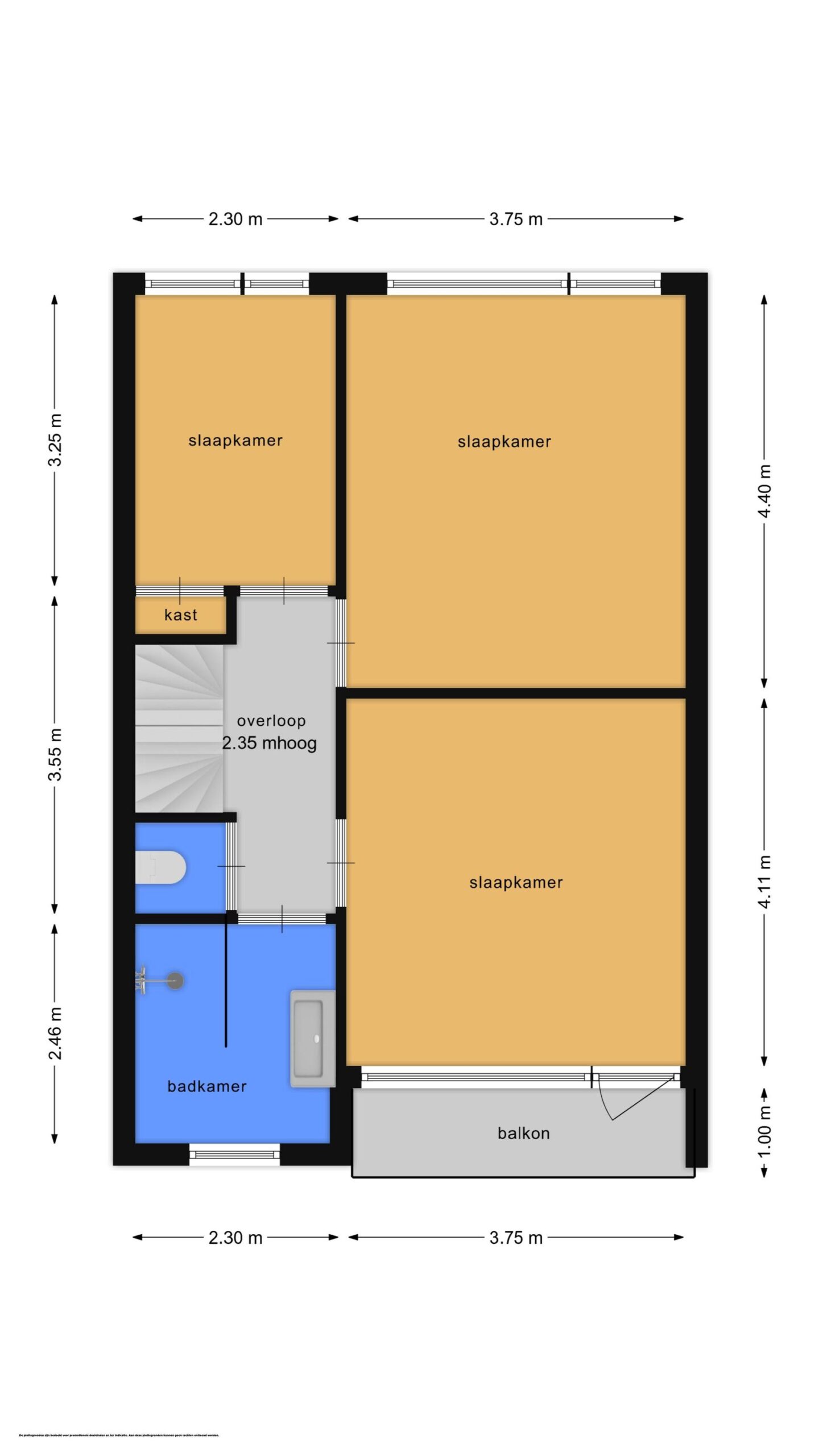 Overloop met toegang tot drie slaapkamers. De ruime ouderslaapkamer beschikt over een vaste kastenwand. De tweede slaapkamer heeft eveneens een vaste kast en een deur naar het overdekte balkon. De derde kamer is ideaal als kinder- of werkkamer. De moderne badkamer is uitgerust met een inloopdouche, dubbele wastafel met meubel en handdoekenradiator. Het toilet is separaat op de overloop.