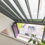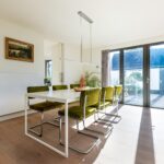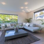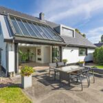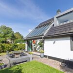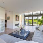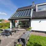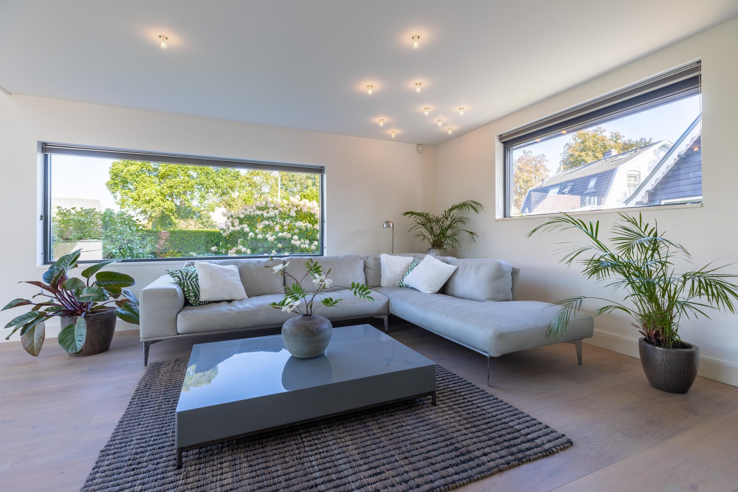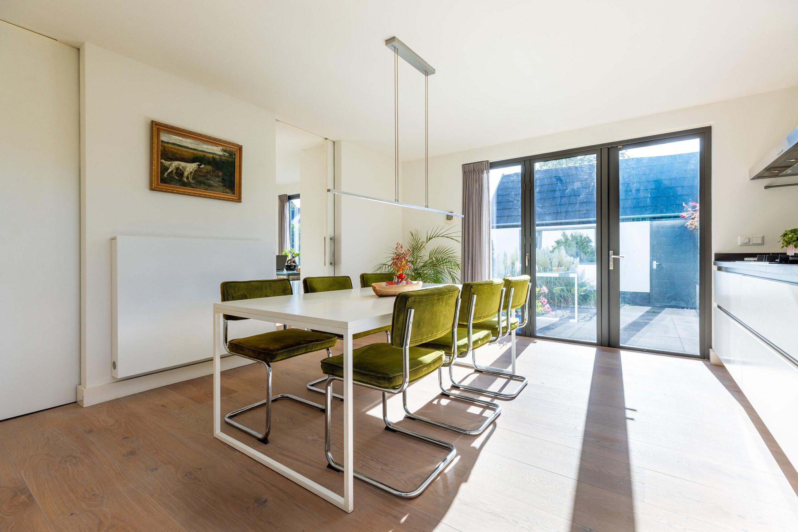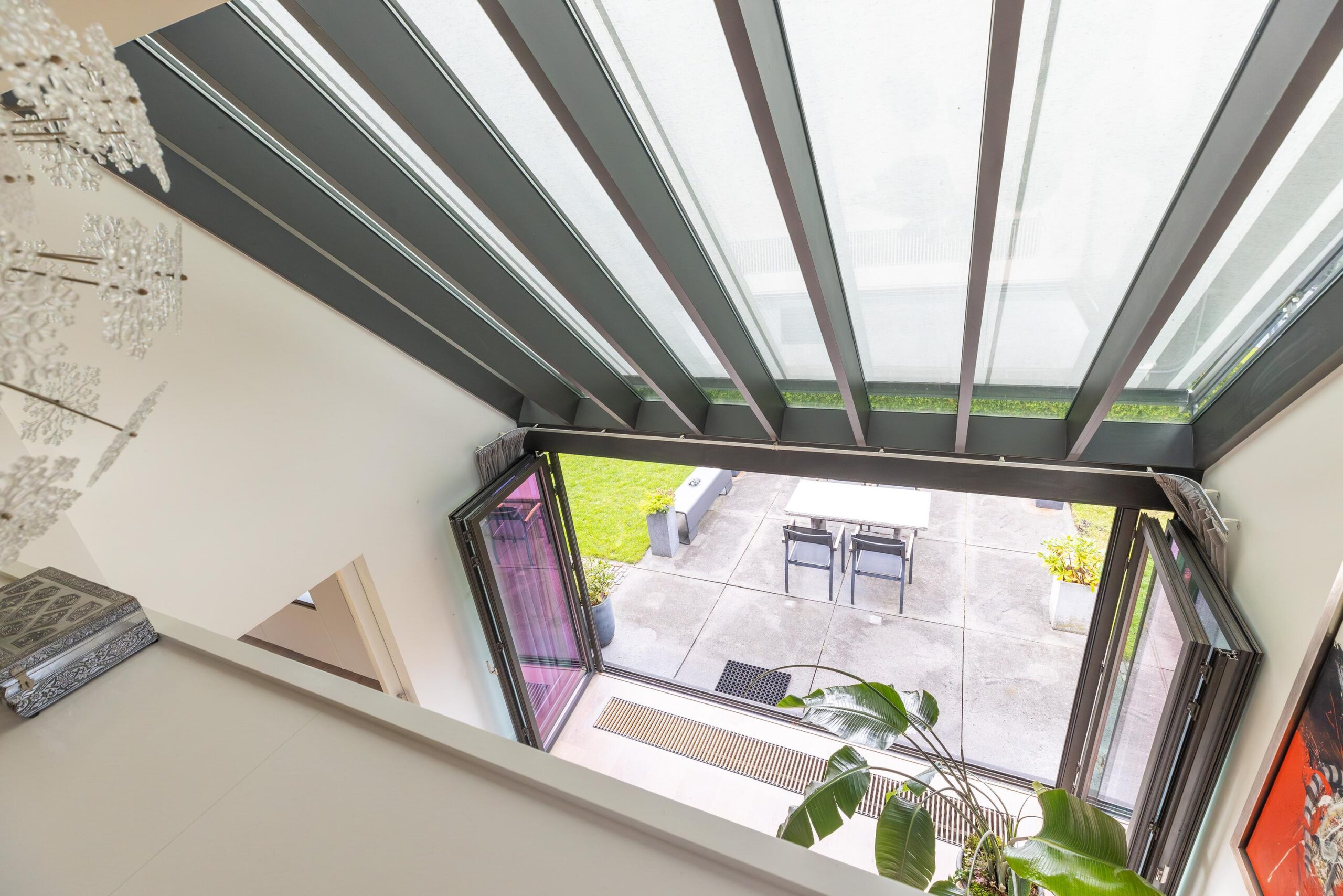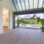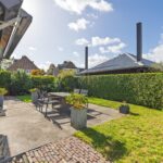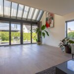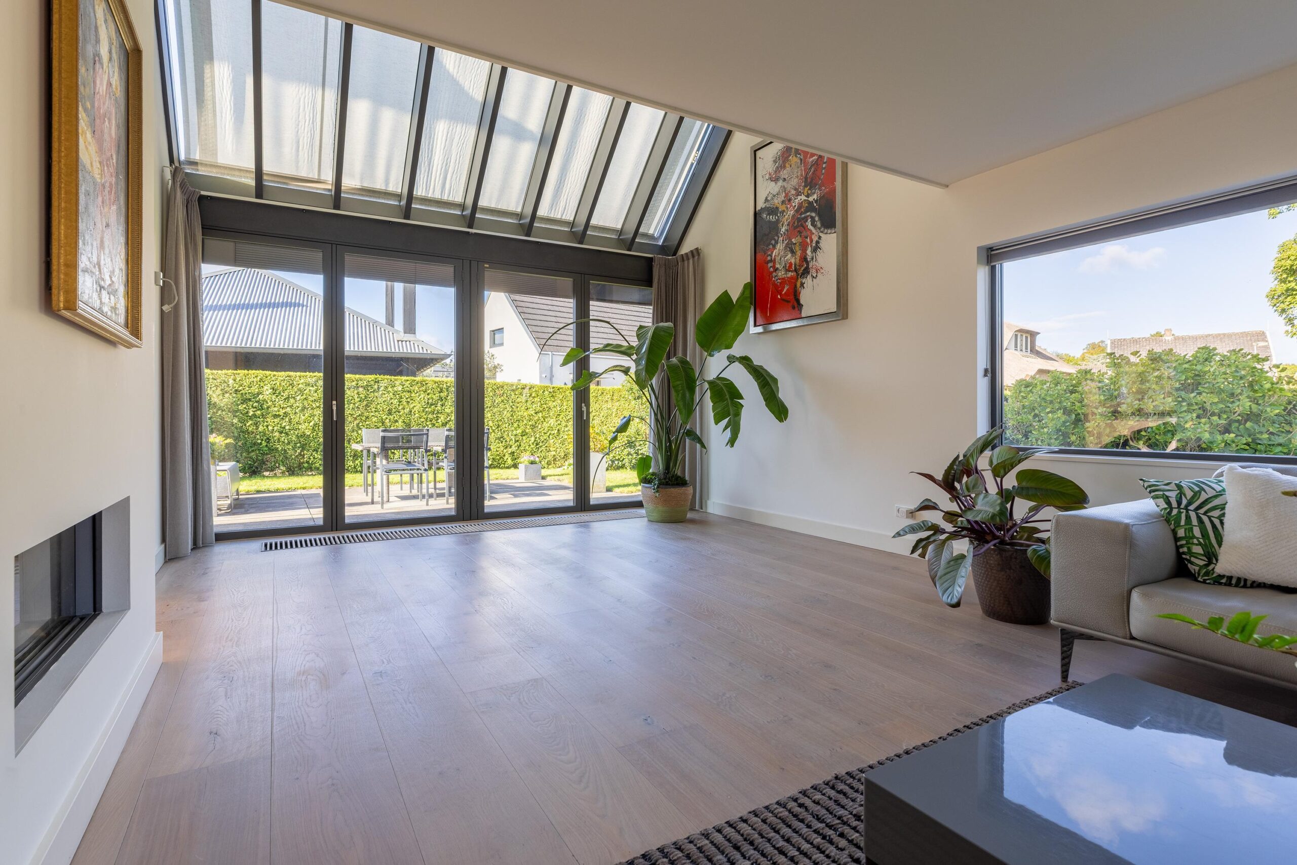 De woonkamer is verder voorzien van een brede gashaard en de achtergevel kan in zijn geheel geopend worden.